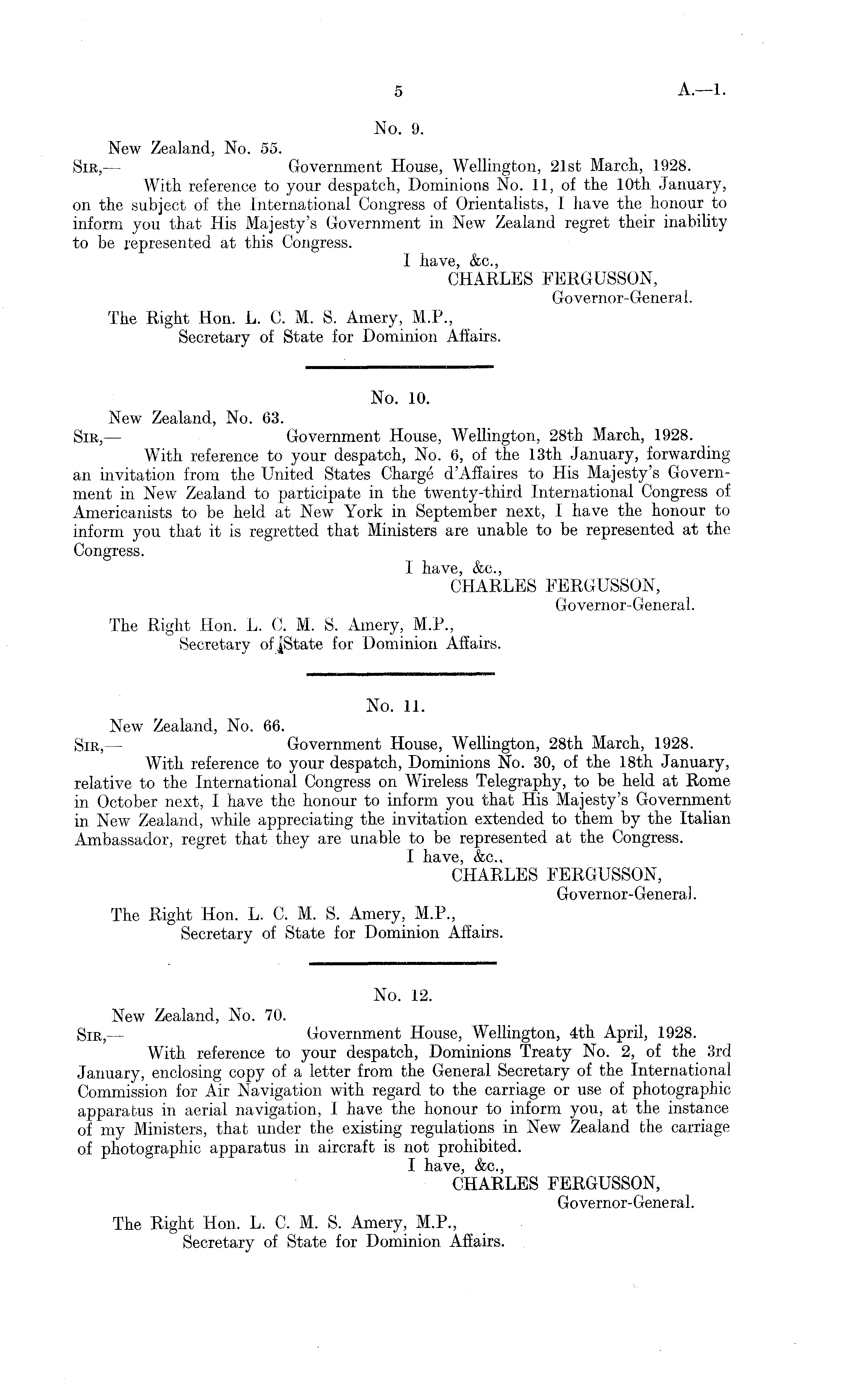 No. 9. New Zealand, No. 55. Sir, — Government House, Wellington, 21st March, 1928. With reference to your despatch, Dominions No. 11, of the 10th January, on the subject of the International Congress of Orientalists, I have the honour to inform you that His Majesty's Government in New Zealand regret their inability to be represented at this Congress. I have, &c., CHARLES FERGUSSON, Governor-General. The Right Hon. L. C. M. S. Amery, M.P., Secretary of State for Dominion Affairs.