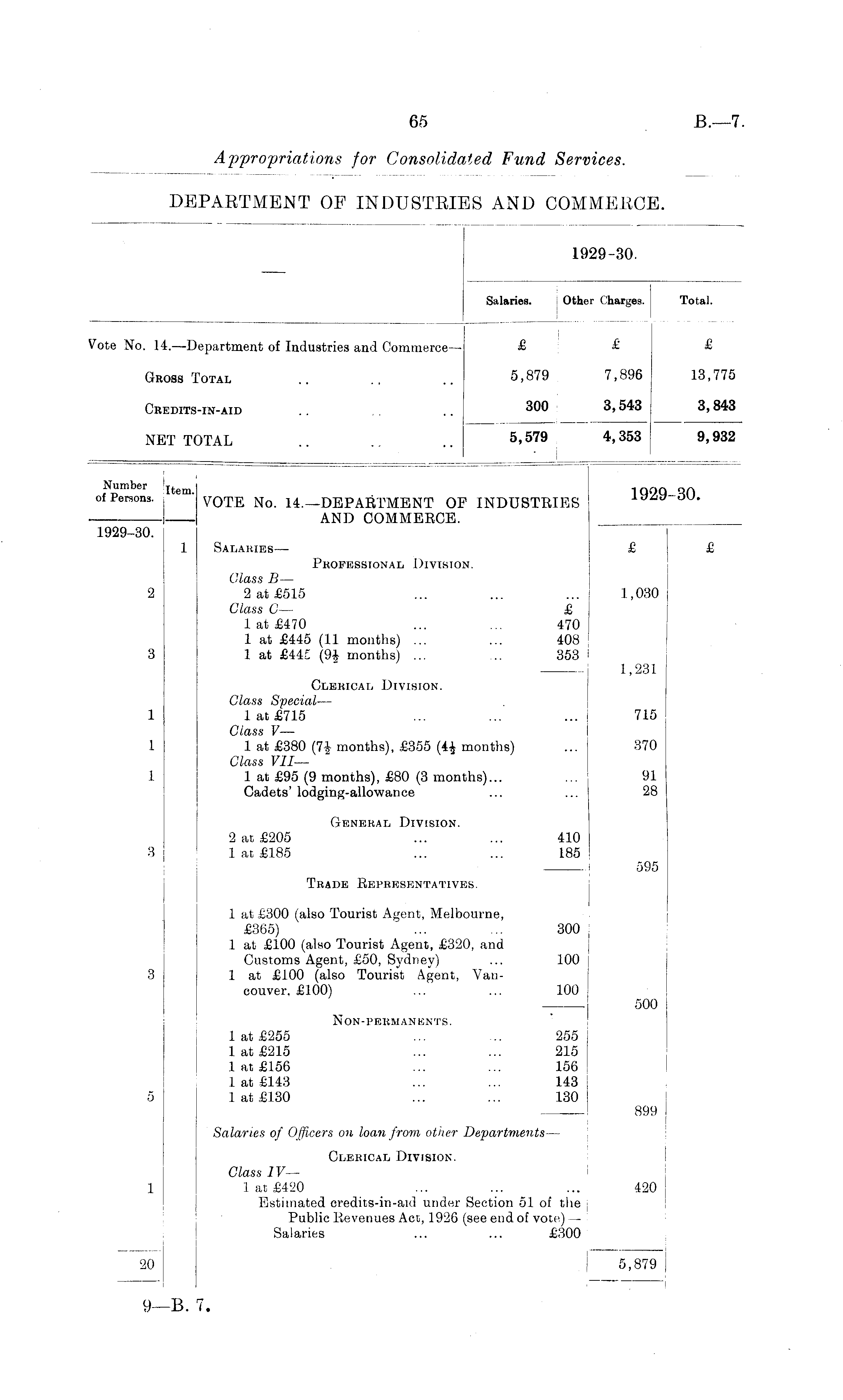 1929-30. Salaries. Other Charges. Total. Vote No. 14.—Department of Industries and Commerce— £ £ £ GROSS Total .. .. .. 5.879 7,896 13,775 Credits-in-aid .. 300 3,543 3,843 NET TOTAL .. 5,579 4,353 9,932 Number i Item lOOO QA of Persons. VOTE No. 14 — DEPARTMENT OF INDUSTRIES OU ' AND COMMERCE. 1929-30. ~ | 1 Salaries— £ | £ Professional Division. Class B—• 2 2 at £515 ... ... ... 1,030 Class C— £ 1 at £470 ... ... 470 1 at £445 (11 months) ... ... 408 3 1 at £445 (9i months) ... .. 353 : 1,231 Clerical Division. Class Special— 1 1 at £715 ... ... ... | 715 Class V — 1 1 at £380 (7\ months), £355 months) ... 370 Class VII— 1 1 at £95 (9 months), £80 (3 months)... ... 91 Cadets' lodging-allowance ... ... 28 General Division. 2 at £205 ... ... 410 3 1 at £185 ... ... 185 ; 595 Trade Representatives. I 1 at £300 (also Tourist Agent, Melbourne, £365) ... ... 300 1 at £100 (also Tourist Agent, £320, and Customs Agent, £50, Sydney) ... 100 3 1 at £100 (also Tourist Agent, Vancouver, £100) ... ... 100 —_ 500 Non-permanents. 1 at £255 ... ... 255 1 at £215 ... ... 215 1 at £156 ... ... 156 1 at £143 ... ... 143 5 1 at £130 ... ... 130 i J 899 Salaries of Officers on loan from other Departments— Clerical Division. Class IV— 1 1 at £420 ... ... ... 420 Estimated credits-in-aid under Section 51 of the Public Revenues Act, 1926 (see end of vote.) — Salaries ... ... £300 20 ! 5,879