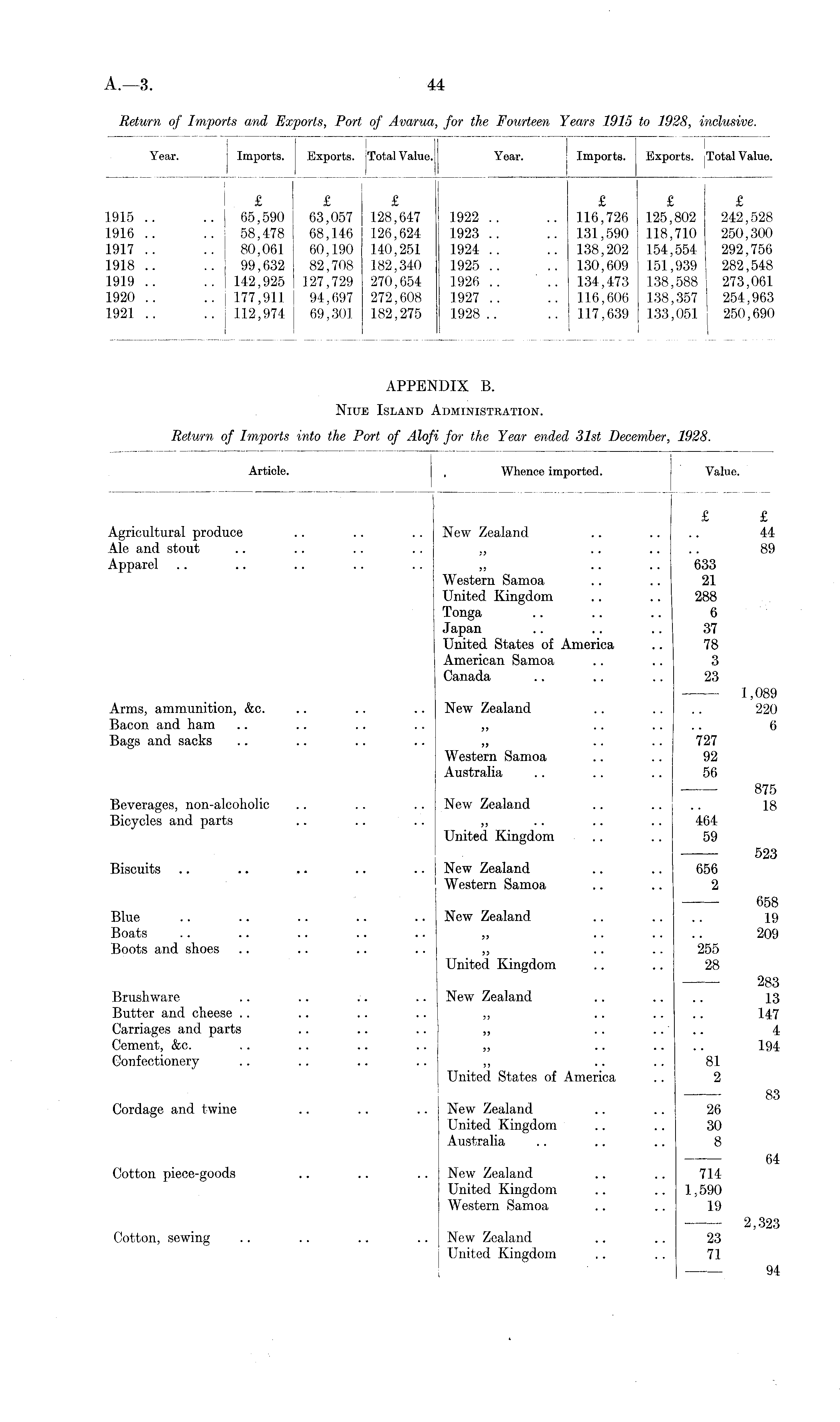 Return of Imports and Exports, Port of Avarua, for the Fourteen Years 1915 to 1928, inclusive.