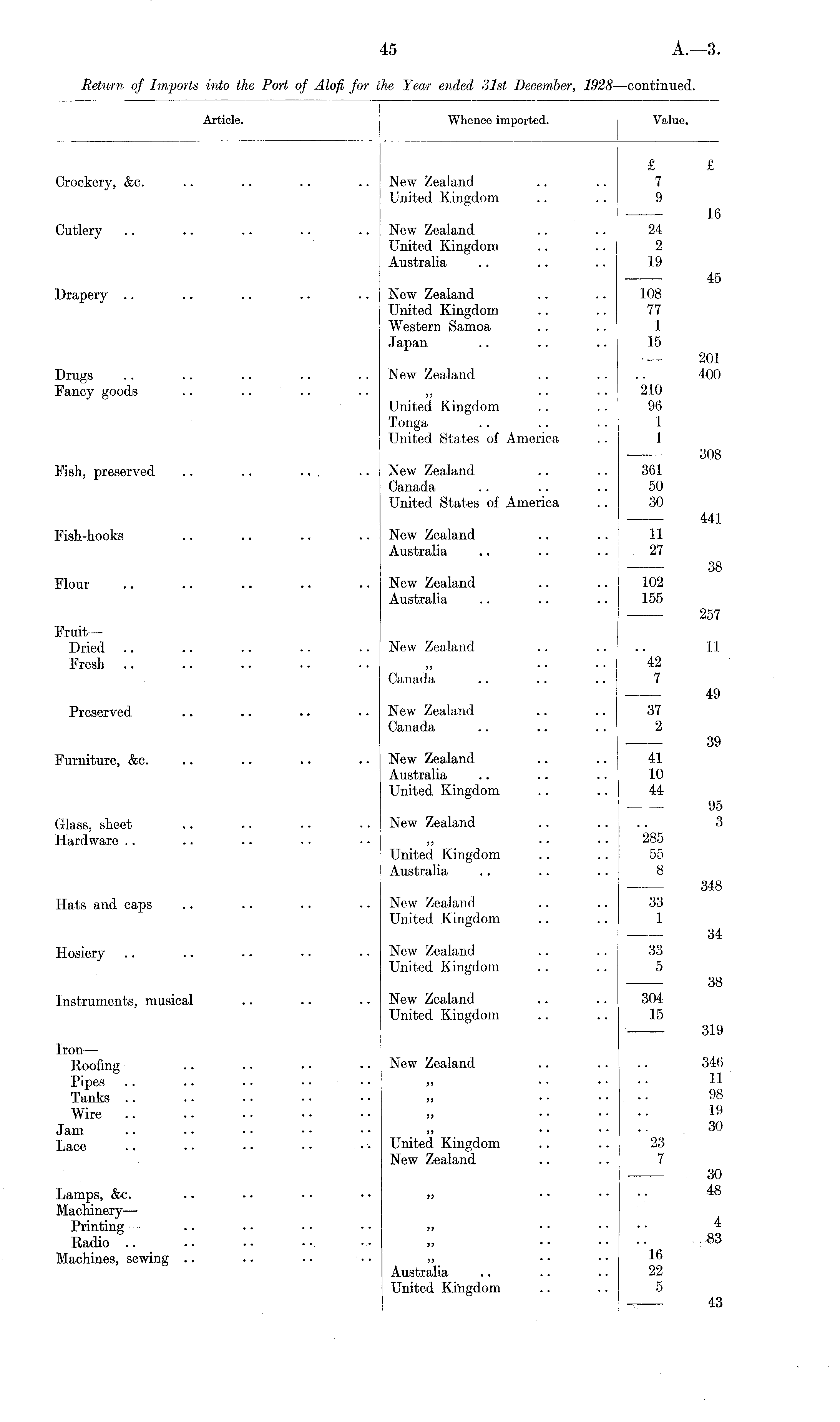 Article. Whence imported. Value. £ £ Crockery, &c. .. .. .. .. New Zealand .. .. 7 United Kingdom .. .. 9 16 Cutlery .. .. .. .. .. New Zealand .. .. 24 United Kingdom .. .. 2 Australia .. .. .. 19 45 Drapery .. .. .. .. .. New Zealand .. .. 108 United Kingdom .. .. 77 Western Samoa .. .. 1 Japan .. .. .. 15 201 Drugs .. .. .. .. .. New Zealand .. .. .. 400 Fancy goods .. .. .. .. „ .. .. 210 United Kingdom .. . . 96 Tonga .. .. .. 1 United States of America .. 1 308 Fish, preserved .. .. ... .. New Zealand .. .. 361 Canada .. .. .. 50 United States of America .. 30 441 Fish-hooks .. .. .. .. New Zealand .. .. J 11 Australia .. .. .. I 27 38 Flour .. .. .. .. .. New Zealand .. .. 102 Australia .. .. .. 155 257 Fruit— Dried .. .. .. .. .. New Zealand .. .. .. 11 Fresh .. .. .. .. . • ,, • • •• 42 Canada .. .. .. 7 49 Preserved .. .. .. New Zealand .. .. 37 Canada .. .. .. 2 39 Furniture, &c. .. .. .. .. New Zealand .. .. 41 Australia .. .. .. 10 United Kingdom .. .. 44 95 Glass, sheet .. .. .. ■ ■ New Zealand .. .. .. 3 Hardware .. .. .. • ■ ,, • • • • 285 United Kingdom .. .. 55 Australia .. .. .. 8 348 Hats and caps .. .. .. • • New Zealand .. .. 33 United Kingdom .. .. 1 — 34 Hosiery .. .. . • • ■ • • New Zealand .. .. 33 United Kingdom .. .. 5 38 Instruments, musical .. .. New Zealand .. .. 304 United Kingdom .. .. 15 319 Iron — Roofing .. . • • • • • New Zealand .. .. .. 346 Pipes .. .. . • • • • • ,, • • .... 11 Tanks .. .. • • • • • ■ jj • • • • • • 98 Wire .. .. • • • • • • » • • .... 19 Jam .. .. • • • • • • >> • • .... 30 Lace .. .. • • ■ • • • United Kingdom .. .. 23 New Zealand .. .. 7 — 30 Lamps, &c. .. • • • • • • ,> ■ ■ .... 48 Machinery — Printing ■ .. • • • • • • » • • .... 4 Radio .. .. •• • •• » •• .... -83 Machines, sewing .. .. • • • • „ _ • • ■ • 16 Australia .. .. .. 22 United Kingdom .. .. 5 43