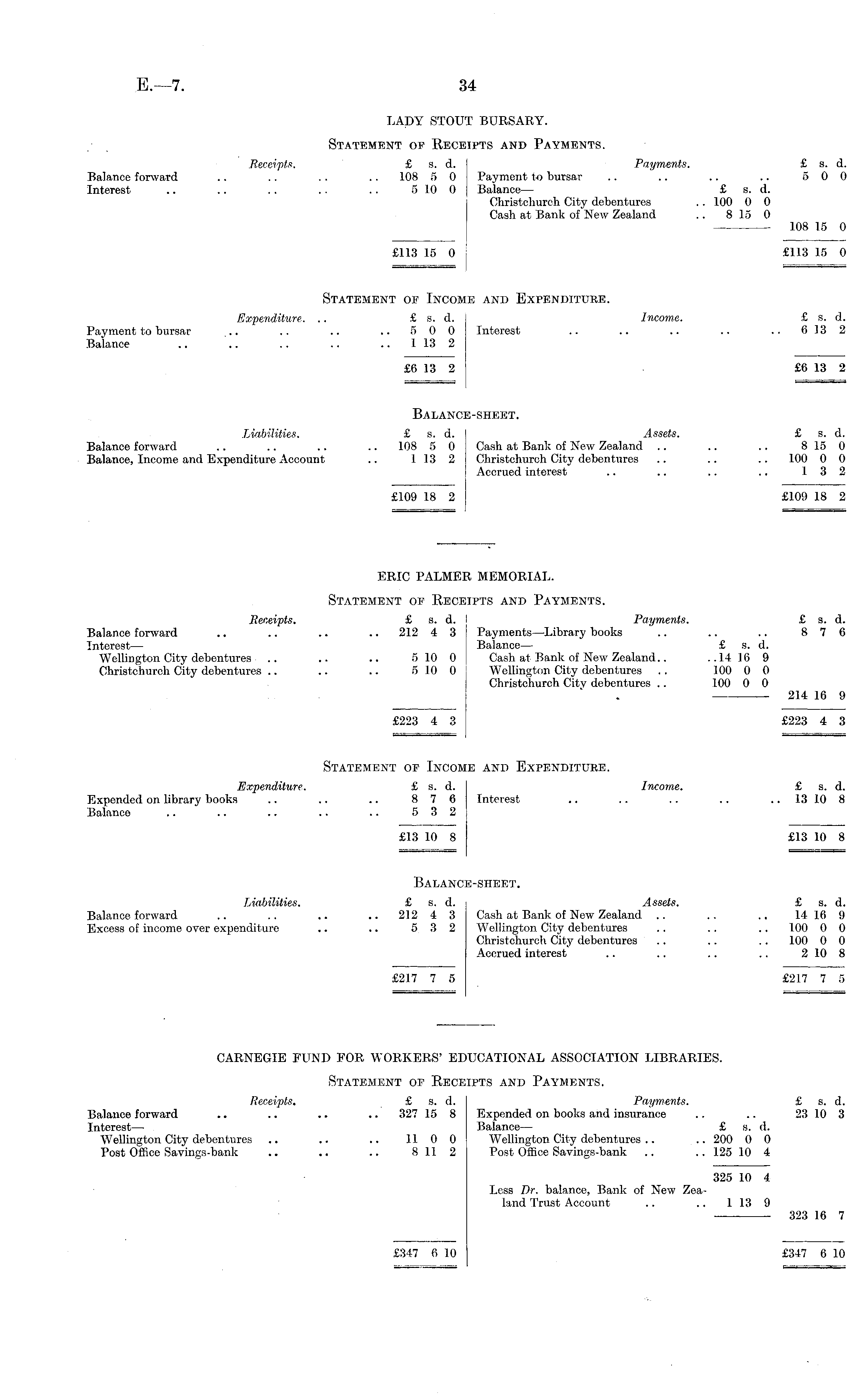 LADY STOUT BURSARY. Statement op Receipts and Payments. Receipts. £ s. d. Payments. £ s. d. Balance forward .. .. .. .. 108 5 0 Payment to bursar .. .. .. .. 5 0 0 Interest .. .. .. .. .. 510 0 Balance — £ s. d. Ohristcliurch City debentures .. 100 0 0 Cash at Bank of New Zealand .. 8 15 0 108 15 0 £113 15 0 £113 15 0 Statement op Income and Expenditure. Expenditure. .. £ s. d. Income. £ s. d. Payment to bursar .. .. .. .. 5 0 0 Interest .. .. .. .. .. 6132 Balance .. .. .. .. .. 1 13 2 £6 13 2 £6 13 2 Balance-sheet. Liabilities. £ s. d. Assets. £ s. d. Balance forward .. .. .. .. 108 5 0 Cash at Bank of New Zealand .. .. .. 8 15 0 Balance, Income and Expenditure Account .. 113 2 Christchurch City debentures .. .. .. 100 0 0 Accrued interest .. .. .. .. 13 2 £109 18 2 £109 18 2 ERIC PALMER MEMORIAL. Statement op Eeceipts and Payments. Receipts. £ s. d. I Payments. £ s. d. Balance forward .. .. .. .. 212 4 3 Payments—Library books .. .. .. 8 7 6 Interest— Balance— £ s. d. Wellington City debentures .. .. .. 510 0 Cash at Bank of New Zealand.. ..14 16 9 Christchurch City debentures .. .. .. 510 0 Wellington City debentures .. 100 0 0 Christchurch Citv debentures .. 100 0 0 214 16 9 £223 4 3 £223 4 3 Statement op Income and Expenditure. Expenditure. £ s. d. Income. £ s. d. Expended on library books .. .. .. 8 7 6 Interest .. .. .. .. 13 10 8 Balance .. .. .. .. .. 532 £13 10 8 £13 10 8 Balance-sheet. Liabilities. £ s. d. Assets. £ s. d. Balance forward .. .. .. .. 21243 Cash at Bank of New Zealand .. .. .. 14 16 9 Excess of income over expenditure .. .. 5 3 2 Wellington City debentures .. .. .. 100 0 0 Christchurch City debentures .. .. .. 100 0 0 Accrued interest .. .. .. .. 2 10 8 £217 7 5 £217 7 5 CARNEGIE FUND FOR WORKERS' EDUCATIONAL ASSOCIATION LIBRARIES. Statement op Receipts and Payments. Receipts. £ s. d. Payments. £ s. d. Balance forward .. .. .. .. 327 15 8 Expended on books and insurance .. .. 23 10 3 Interest — Balance— £ s. d. Wellington City debentures .. .. .. 11 0 0 Wellington City debentures .. .. 200 0 0 Post Office Savings-bank .. .. .. 811 2 Post Office Savings-bank .. .. 125 10 4 325 10 4 Less Dr. balance, Bank of New Zealand Trust Account .. .. 1 13 9 323 16 7 £347 6 10 £347 6 10