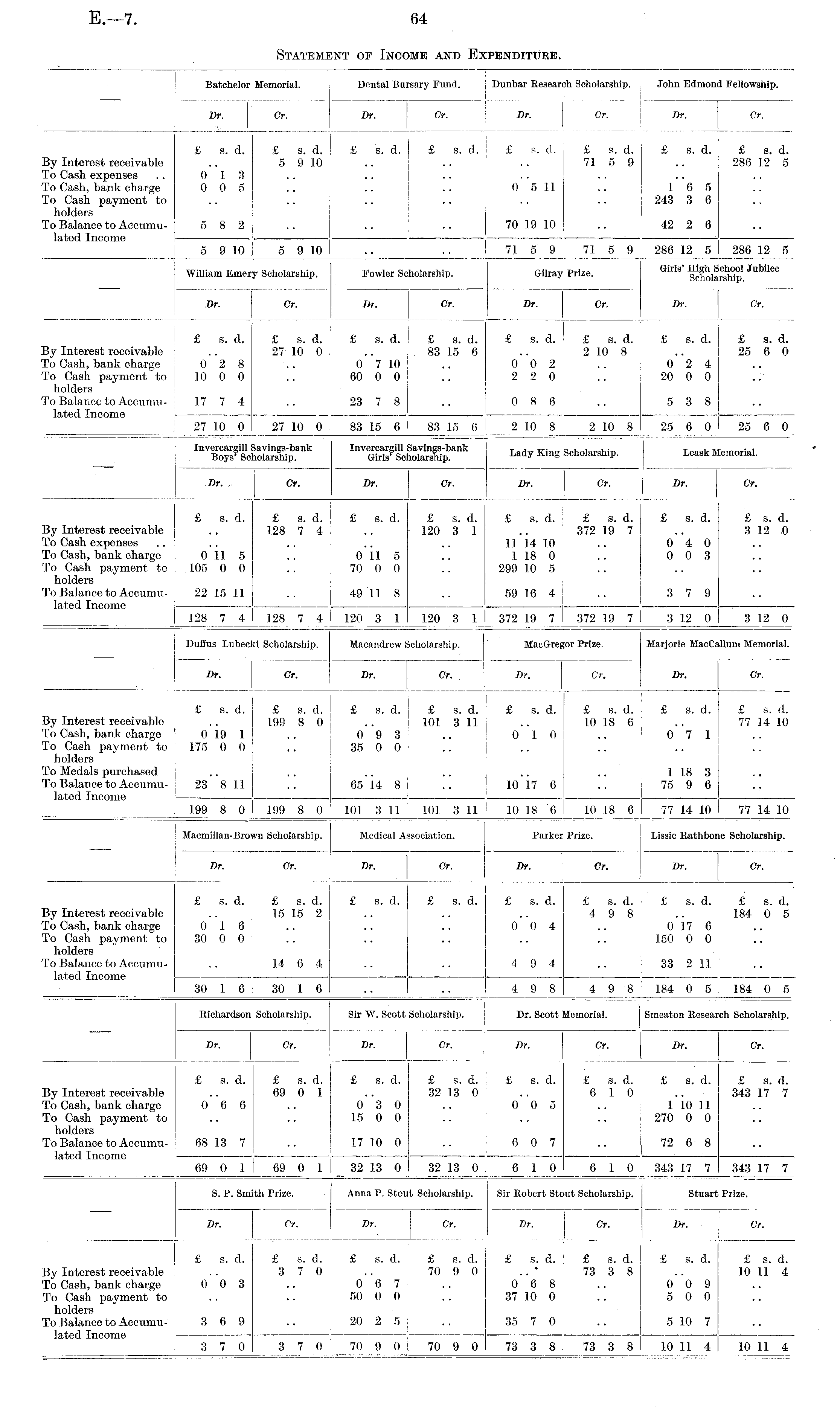 I I Batchelor Memorial. Dental Bursary Fund. Dunbar B-esearch Scholarship. John Edraond Fellowship. Dr. Cr. Dr. Cr. Dr. j Cr. Dr. Cr. £ b. d. £ s. d. £ 8. d. ! £ s. d. ; £ s. d. £ s. d. j £ s. d. £ s. d. By Interest receivable .. 5 9 10 .. j .. . . 71 5 9 .. 286 12 5 To Cash expenses .. 013 .. | .. j .. .. .. i To Cash, bank charge 00 5! .. | .. I .. 0511 .. 165 To Cash payment to .. ' . . .. .. .. .. 243 3 6 holders To Balance to Accumu- 5 8 2 j .. : .. .. [ 70 19 10 .. j 42 2 6 lated Income j- j — . — 5 9 10 I 5 9 10 .. I 71 5 9 71 5 9 _ 286 12 5 286 12 5 William Emery Scholarship. Fowler Scholarship. Gilray Prize. Girls ' f'holarship. JuMlee Dr. I Cr. Dr. Cr. Dr. Cr. Dr. j Cr. £ s. d. £ s. d. | £ s. d. £ s. d. £ s. d. £ s. d. j £ s. d. £ s. d. By Interest receivable .. 27 10 0 .. 83 15 6 .. 2 10 8 .. 25 6 0 To Cash, bank charge 028 .. i 0 7 10 .. 002 .. 024 To Cash payment to j 10 0 0 . . 60 0 0 .. 2 2 0 .. 20 0 0 holders To Balance to Accumu- 17 74 .. 23 7 8 .. 086 .. 538 lated Income ; 27 10 0 27 10 0 | 83 .15 6 83 15 6 2 10 8 _ 2 10 8 25 6 0 25 6 0 Invercargill Savings-bank Invercargill Savings-bank Tnrtv Kino Schnlarahin I T eask Memorial Boys' Scholarship. Girls' Scholarship. Lacl y Jvmg »™oJarship. Leask Memorial. Dr. Cr. Dr. Cr. Dr. j Cr. j Dr. j Cr. i £ s. d. £ s. d. £ s. d. £ s. d. £ s. d. £ s. d. | £ s. d. £ s. d. By Interest receivable j .. 128 7 4 .. 120 3 1 .. 372 19 7 I .. 3 12 0 To Cash expenses .. .. .. j .. .. 111410 .. 040 To Cash, bank charge j 0 11 5 .. 0 11 5 .. 1 18 0 .. 0 0 3 To Cash payment to 105 0 0 .. 70 0 0 .. 299 10 5 holders j To Balance to Accumu- 22 15 11 .. j 49"ll 8 .. 59 16 4 .. j 3 7 9 lated Income 1 I 128 7 4 128 7 4_l 120 _3__1 120 3 1 i 372 19 7 372 19 7 3 12 0 3 12 0 ! Duflfus Lubecki Scholarship. Macandrew Scholarship. MacGregor Prize. Marjorie MacCallum Memorial. Dr. J Cr. Dr. J Cr. j Dr. Cr. Dr. Cr. I I i ! £ s. d. £ s. d. | £ s. d. £ s. d. £ s. d. I £ s. d. £ s. d. £ s. d. By Interest receivable .. 199 8 0 .. 101 3 11 .. J 10 18 6 .. 77 14 10 To Cash, bank charge 0 19 1 .. 093 .. 0101 .. 071 To Cash payment to 175 0 0 .. 35 0 0 holders To Medals purchased .. .. .. .. .. .. 1 18 3 To Balance to Accumu- 23 8 11 .. 65 14 8 .. 10 17 6 .. 75 9 6 lated Income ' ' I 199 8 0 I 199 8 0 101 3 11 101 3 11 10 18 6 10 18 6 77 14 10 7714 10 Macmillan-Brown Scholarship. Medical Association. Parker Prize. Lissie Rathbone Scholarship. Dr. Cr. Dr. Cr. Dr. Cr. Dr. Cr. I i r £ s. d. | £ s. d. £ s. d. £ s. d. £ s. d. £ s. d. £ s. d. £ s. d. By Interest receivable .. 15 15 2 .. .. .. 4 9 8 .. 184 0 5 To Cash, bank charge 016 .. .. .. 004 .. 0 17 6 To Cash payment to 30 0 0 .. .. .. .. .. 150 0 0 holders To Balance to Accumu- .. 14 6 4 .. .. 4 9 4 .. 33 2 11 lated Income 30 1 6 1 30 1 6 .. .. 4 9 8 4 9 8 184 0 5 184 0 5 . Richardson Scholarship. Sir W. Scott Scholarship. Br. Scott Memorial. Smeaton Research Scholarship. Dr. Cr. Dr. Cr. Dr. Cr. Dr. Cr. . : £ s. d. £ s. d. £ s. d. £ s. d. £ s. d. £ s. d. ; £ s. d. £ s. d. By Interest receivable .. 69 0 1 .. 32 13 0 .. 6 1 0' .. 343 17 7 To Cash, bank charge 066 .. 030 .. 005 .. 1 10 11 To Cash payment to .. .. 15 0 0 .. .. .. 270 0 0 holders To Balance to Accumu- 68 13 7 .. 17 10 0 .. 6 0 7 .. i 72 6 8 lated Income ' I 69 0 1 1 69 0 1 I 32 13 0 32 13 0 _6 1 0 6 1 0 343 17 7 343 17 7 S. P. Smith Prize. Anna P. Stout Scholarship. Sir Robert Stout Scholarship. Stuart Prize. Dr. Cr. Dr. Cr. Dr. j Cr. Dr. \ Cr. £ s. d. £ s. d. £ s. d. £ s. d. £ s. d. £ s. d. £ s. d. £ s. d. By Interest receivable .. 3 7 0 .. 70 9 0 .. 73 3 8 .. 10 11 4 To Cash, bank charge 003 .. 067 .. 068 .. 009 To Cash payment to .. .. 50 0 0 .. 37 10 0 .. 5 0 0 holders To Balance to Accumu- 3 6 9 .. 20 2 5 .. 35 7 0 .. 5 10 7 lated Income ! 3 7 0 3 7 0 70 9 0 70 9 0 73 3 8 73 3 8 10 11 4 10 11 4