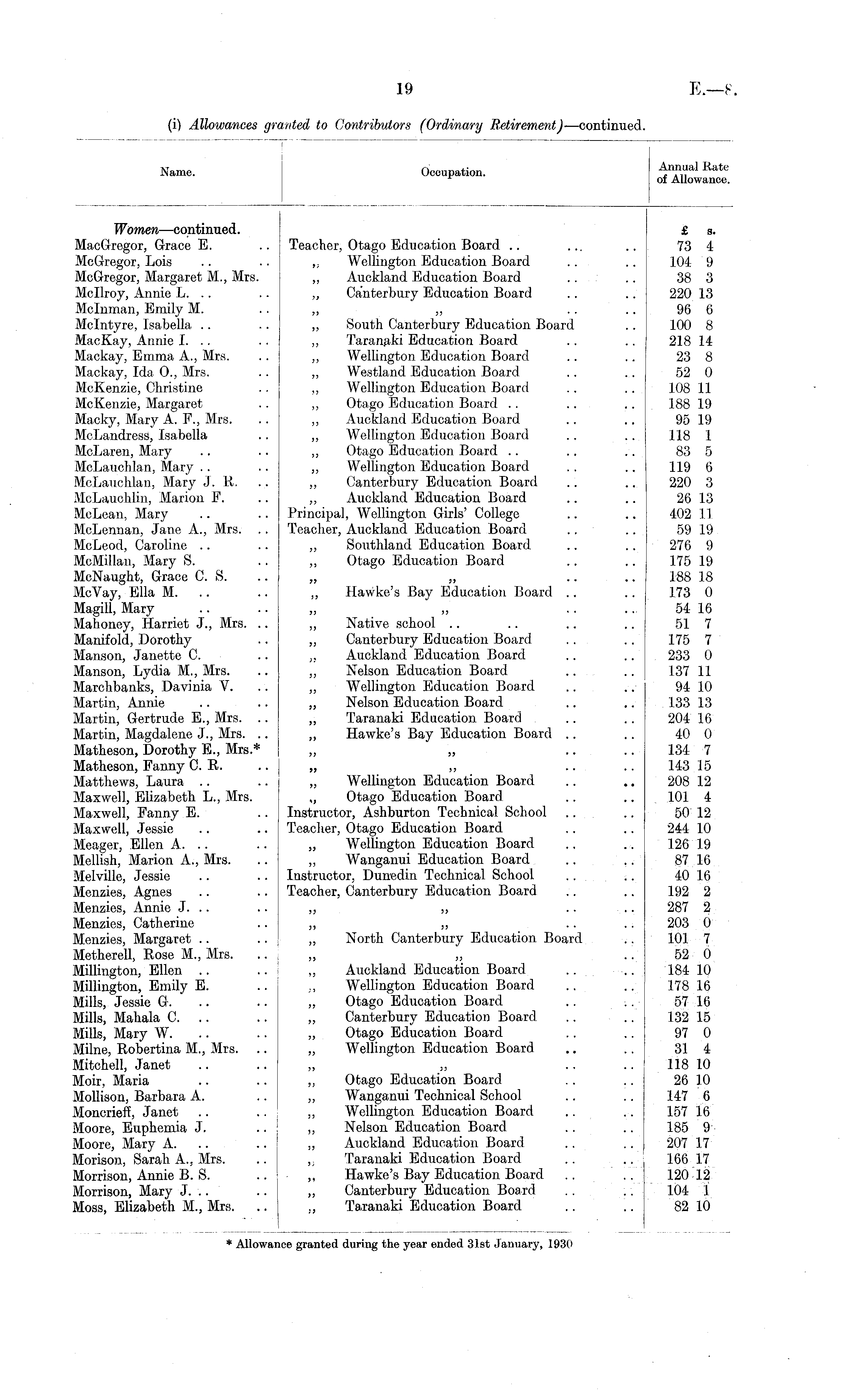 Name. Occupation. "V ate of Allowance. Women —continued. £ s. MacGregor, Grace E. .. Teacher, Otago Education Board .. ... .. 73 4 McGregor, Lois .. .. ,, Wellington Education Board .. .. 104 9 McGregor, Margaret M., Mrs. ,, Auckland Education Board .. .. 38 3 Mcllroy, Annie L. . . .. „ Canterbury Education Board .. .. 220 13 Mclnman, Emily M. „ „ .... 96 6 Mclntyre, Isabella .. .. „ South Canterbury Education Board .. 100 8 MacKay, Annie I. .. .. „ Taranaki Education Board .. .. 218 14 Mackay, Emma A., Mrs. .. „ Wellington Education Board .. .. 23 8 Mackay, Ida 0., Mrs. .. „ Westland Education Board .. ... 52 0 McKenzie, Christine .. „ Wellington Education Board .. .. 108 11 McKenzie, Margaret .. ,, Otago Education Board .. .. .. 188 19 Macky, Mary A. F., Mrs. .. „ Auckland Education Board .. .. 95 19 McLandress, Isabella .. ,, Wellington Education Board .. .. 118 1 McLaren, Mary .. .. ,, Otago Education Board .. .. .. 83 5 McLauchlan, Mary .. .. ,, Wellington Education Board .. .. 119 6 McLauchlan, Mary J. U. .. ,, Canterbury Education Board .. .. 220 3 McLaucklin, Marion F. .. ,, Auckland Education Board .. .. 26 13 McLean, Mary .. .. Principal, Wellington Girls' College .. .. 402 1.1 McLennan, Jane A., Mrs. .. Teacher, Auckland Education Board .. .. 59 19 McLeod, Caroline .. .. ,, Southland Education Board .. .. 276 9 McMillan, Mary S. .. ,, Otago Education Board .. .. 175 19 McNaught, Grace C. S. .. „ „ .. .. 188 18 McVay, Ella M. .. ,, Hawke's Bay Education Board .. .. 173 0 Magill, Mary .. .. „ „ .. 54 16 Mahoney, Harriet J., Mrs. .. „ Native school .. .. .. .. 51 7 Manifold, Dorothy .. „ Canterbury Education Board . . . . 175 7 Manson, Janette C. .. ,, Auckland Education Board .. .. 233 0 Manson, Lydia M., Mrs. .. ,, Nelson Education Board .. .. 137 11 Marchbanks, Davinia V. ,, Wellington Education Board .. .. 94 10 Martin, Annie .. .. „ Nelson Education Board .. .. 133 13 Martin, Gertrude E., Mrs. .. „ Taranaki Education Board .. .. 204 16 Martin, Magdalene J., Mrs. .. ,, Hawke's Bay Education Board .. .. 40 0 Matheson, Dorothy E., Mrs.* „ „ .... 134 7 Matheson, Fanny C. B. .. „ „ .. .. 143 15 Matthews, Laura .. .. „ Wellington Education Board .. .. 208 12 Maxwell, Elizabeth L., Mrs. ,, Otago Education Board .. .. 101 4 Maxwell, Fanny E. .. Instructor, Ashburton Technical School .. .. 50 12 Maxwell, Jessie .. .. Teacher, Otago Education Board .. .. 244 10 Meager, Ellen A. .. .. „ Wellington Education Board .. .. 126 19 Mellish, Marion A., Mrs. .. „ Wanganui Education Board .. .. 87 16 Melville, Jessie .. .. Instructor, Dunedin Technical School .. .. 40 16 Menzies, Agnes .. .. Teacher, Canterbury Education Board .. .. 192 2 .Menzies, Annie J. .. .. ,, ,, .. .. 287 2 Menzies, Catherine „ „ .. .. 203 0 Menzies, Margaret .. .. „ North Canterbury Education Board .. 101 7 Metherell, Rose M., Mrs. .. „ 52 0 Millington, Ellen .. .. „ Auckland Education Board .. .. 184 10 Millington, Emily E. .. ,, Wellington Education Board .. .. 178 16 Mills, Jessie G. .. .. „ Otago Education Board .. .. 57 16 Mills, Mahala C. .. „ Canterbury Education Board .. .. 132 15 Mills, Mary W. .. „ Otago Education Board .. .. 97 0 Milne, Robertina M., Mrs. .. „ Wellington Education Board .. .. 31 4 Mitchell, Janet .. .. „ .. .. 118 10 Moir, Maria .. .. „ Otago Education Board .. .. 26 10 Mollison, Barbara A. .. „ Wanganui Technical School .. .. 147 6 Moncrieff, Janet .. .. „ Wellington Education Board .. .. 157 16 Moore, Euphemia J. .. „ Nelson Education Board .. .. 185 9 Moore, Mary A. .. „ Auckland Education Board .. .. 207 17 Morison, Sarah A., Mrs. .. ,, Taranaki Education Board .. .. 166 17 Morrison, Annie B. S. .. „ Hawke's Bay Education Board .. .. 120 12 Morrison, Mary J. .. .. „ Canterbury Education Board .. .. 104 1 Moss, Elizabeth M., Mrs. .. „ Taranaki Education Board .. .. 82 10 * Allowance granted during the year ended 31st January, 1930