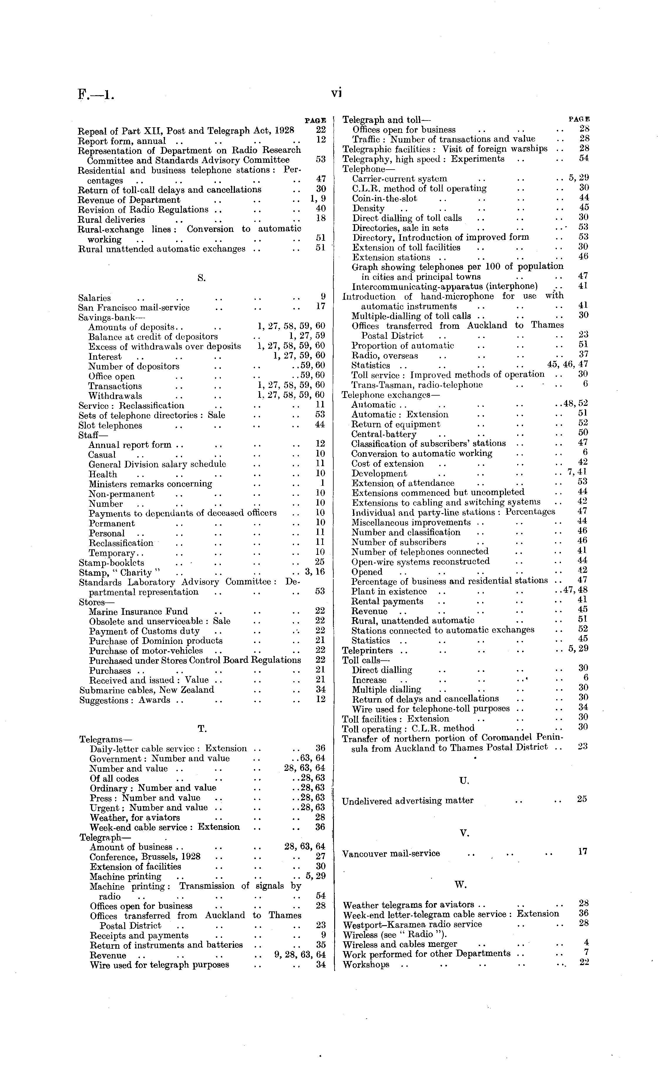 page Telegraph and toll —• page Repeal of Part XII, Post and Telegraph Act, 1928 22 Offices open for business .. .. • • 28 Report form, annual .. .. • • - • 12 Traffic : Number of transactions and value . ■ 28 Representation of Department on Radio Research Telegraphic facilities : Visit of foreign warships .. 28 Committee and Standards Advisory Committee 53 Telegraphy, high speed: Experiments .. .. 54 Residential and business telephone stations : Per- Telephone — centages .. .. .. .. .. 47 Carrier-current system .. .. .. 5,29 Return of toll-call delays and cancellations .. 30 C.L.R. method of toll operating .. .. 30 Revenue of Department .. .. ..1,9 Coin-in-the-slot .. . . ■. 44 Revision of Radio Regulations .. .. 40 Density .. .. .. •. 45 Rural deliveries .. .. .. • • 18 Direct dialling of toll calls .. .. 30 Rural-exchange lines: Conversion to automatic Directories, sale in sets .. ■. 53 working .. .. .. .. 51 Directory, Introduction of improved form .. 53 Rural unattended automatic exchanges .. ■. 51 Extension of toll facilities .. .. 30 Extension stations .. .. .. • • 46 Graph showing telephones per 100 of population S. in cities and principal towns ■. • • 47 Intercommunicating-apparatus (interphone) _.. 41 Salaries .. .. ■. . • • • 9 Introduction of hand-microphone for use with San Francisco mail-service .. •• 17 automatic instruments •• •• 41 Savings-bank— Multiple-dialling of toll calls .. .. 30 Amounts of deposits.. .. 1,27,58,59,60 Offices transferred from Auckland to Thames Balance at credit of depositors .. 1,27,59 Postal District .. .. .. ..23 Excess of withdrawals over deposits 1,27,58,59,60 Proportion of automatic .. .. ..51 Interest .. .. .. 1, 27, 59, 60 Radio, overseas .. .. ■ • 37 Number of depositors .. •• ..59,60 Statistics .. .. •• • ■ 45,46,47 Office open .. .. • • • • 59, 60 Toll service : Improved methods of operation .. 30 Transactions .. .. 1,27, 58, 59, 60 Trans-Tasman, radio-telephone .. . • 6 Withdrawals ■. ■ ■ 1. 27, 58, 59, 60 Telephone exchanges— Service : Reclassification .. . • •. 11 Automatic .. .. • • • • .. 48,52 Sets of telephone directories : Sale .. .. 53 Automatic : Extension .. • • • • 51 Slot telephones .. .. • • 44 Return of equipment .. ■ ■ 52 Staff — Central-battery .. .. • • 50 Annual report form .. .. . • 12 Classification of subscribers' stations .. .. 47 Casual .. .. . • • • 10 Conversion to automatic working .. .. 6 General Division salary schedule .. .. 11 Cost of extension .. .. •• ..42 Health .. .. .. • • 10 Development .. .. • ■ .. 7,41 Ministers remarks concerning .. .. 1 Extension of attendance .. • • 53 Non-permanent .. .. .. 10 Extensions commenced but uncompleted .. 44 Number .. .. .. .. 10 Extensions to cabling and switching systems .. 42 Payments to dependants of deceased officers .. 10 Individual and party-line stations : Percentages 47 Permanent .. .. .. 10 Miscellaneous improvements .. .. 44 Personal .. .. . • • ■ • • 11 Number and classification .. ■ • 46 Reclassification .. .. .. . . 11 Number of subscribers .. • • 46 Temporary.. .. .. .. ..10 Number of telephones connected .. .. 41 Stamp-booklets .. .. .. ■ • 25 Open-wire systems reconstructed .. ■ • 44 Stamp, " Charity" .. .. • • .. 3, 16 Opened .. .. . • • • • • 42 Standards Laboratory Advisory Committee : De- Percentage of business and residential stations .. 47 partmental representation .. .. 53 Plant in existence .. • • • • .. 47,48 Stores — Rental payments .. .. • • 41 Marine Insurance Fund .. .. 22 Revenue .. .. • • • • .. 45 Obsolete and unserviceable: Sale •. ■. 22 Rural, unattended automatic .. • ■ 51 Payment of Customs duty .. .. 22 Stations connected to automatic exchanges .. 52 Purchase of Dominion products .. .. 21 Statistics .. .. .. • • 45 Purchase of motor-vehicles .. •. .. 22 Teleprinters .. ■ ■ • • ■ • .. 5, 29 Purchased under Stores Control Board Regulations 22 Toll calls — Purchases .. .. .. • • 21 Direct dialling .. .. • • 30 Received and issued: Value .. .. 21 Increase .. .. • • •■ • • • ® Submarine cables, New Zealand .. .. 34 Multiple dialling .. .. • • .. 30 Suggestions: Awards .. .. .. 12 Return of delays and cancellations .. ■ • 30 Wire used for telephone-toll purposes .. .. 34 Toll facilities : Extension .. .. • • 30 T. Toll operating: C.L.R. method .. •. 30 Telegrams — Transfer of northern portion of Coromandel Penin-Daily-letter cable service : Extension .. .. 36 sula from Auckland to Thames Postal District .. 23 Government: Number and value ..63, 64 Number and value .. .. .. 28, 63, 64 Of all codes .. .. .. .. 28,63 jj. Ordinary : Number and value .. .. 28,63 Press: Number and value 28,63 Undelivered advertising matter .. .. 25 Urgent; Number and value .. .. .. 28, 63 Weather, for aviators .. .. 28 Week-end cable service : Extension .... 36 Telegraph — Amount of business .. .. .. 28, 63, 64 ... 1 7 Conference, Brussels, 1928 .. .. .. 27 Vancouver mail-service Extension of facilities .. .. .. 30 Machine printing .. .. .. .. 5, 29 Machine printing : Transmission of signals by W. radio .......... 54 Offices open for business .. .. .. 28 Weather telegrams for aviators .. .. •. 28 Offices transferred from Auckland to Thames Week-end letter-telegram cable service : Extension 36 Postal District .. .. .. 23 Westport-Karamea radio service .. . • 28 Receipts and payments .. .. .. 9 Wireless (see " Radio "). Return of instruments and batteries .. .. 35 Wireless and cables merger .. .. •. 4 Revenue .. .. .. .. 9,28, 63, 64 Work performed for other Departments .. .. 7 Wire used for telegraph purposes .. .. 34 Workshops .. .. • • • • 22