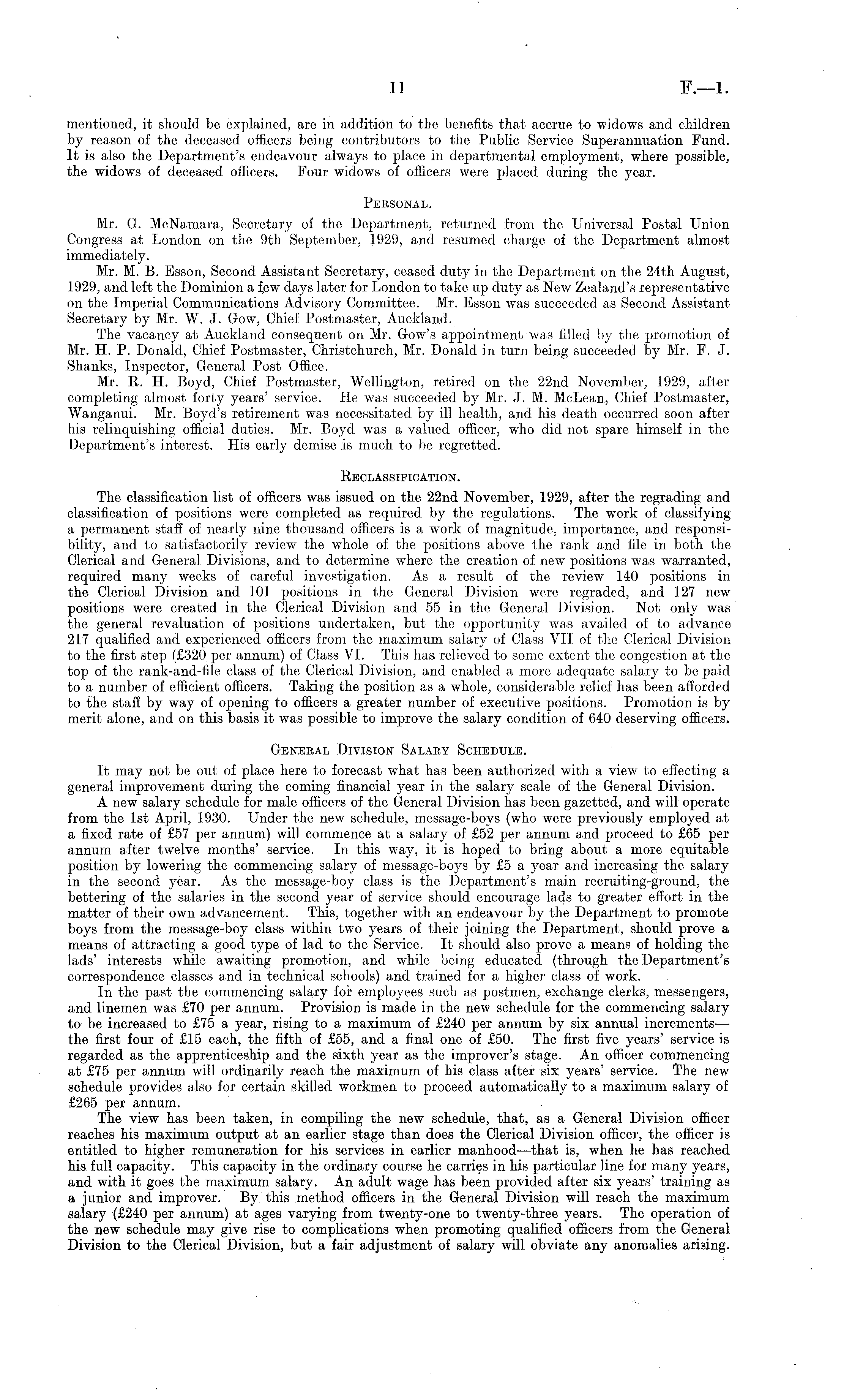 mentioned, it should be explained, are in addition to the benefits that accrue to widows and children by reason of the deceased officers being contributors to the Public Service Superannuation Fund. It is also the Department's endeavour always to place in departmental employment, where possible, the widows of deceased officers. Four widows of officers were placed during the year. Personal. Mr. G. McNamara, Secretary of the Department, returned from the Universal Postal Union Congress at London on the 9th September, 1929, and resumed charge of the Department almost immediately. Mr. M. B. Esson, Second Assistant Secretary, ceased duty in the Department on the 24th August, 1929, and left the Dominion a tew days later for London to take up duty as New Zealand's representative on the Imperial Communications Advisory Committee. Mr. Esson was succeeded as Second Assistant Secretary by Mr. W. J. Cow, Chief Postmaster, Auckland. The vacancy at Auckland consequent on Mr. Gow's appointment was filled by the promotion of Mr. H. P. Donald, Chief Postmaster, Christchurch, Mr. Donald in turn being succeeded by Mr. F. J. Shanks, Inspector, General Post Office. Mr. R. H. Boyd, Chief Postmaster, Wellington, retired on the 22nd November, 1929, after completing almost forty years' service. He was succeeded by Mr. J. M. McLean, Chief Postmaster, Wanganui. Mr. Boyd's retirement was necessitated by ill health, and his death occurred soon after his relinquishing official duties. Mr. Boyd was a valued officer, who did not spare himself in the Department's interest. His early demise .is much to be regretted. Reclassification. The classification list of officers was issued on the 22nd November, 1929, after the regrading and classification of positions were completed as required by the regulations. The work of classifying a permanent staff of nearly nine thousand officers is a work of magnitude, importance, and responsibility, and to satisfactorily review the whole of the positions above the rank and file in both the Clerical and General Divisions, and to determine where the creation of new positions was warranted, required many weeks of careful investigation. As a result of the review 140 positions in the Clerical Division and 101 positions in the General Division were regraded, and 127 new positions were created in the Clerical Division and 55 in the General Division. Not only was the general revaluation of positions undertaken, but the opportunity was availed of to advance 217 qualified and experienced officers from the maximum salary of Class VII of the Clerical Division to the first step (£320 per annum) of Class VI. This has relieved to some extent the congestion at the top of the rank-and-file class of the Clerical Division, and enabled a more adequate salary to be paid to a number of efficient officers. Taking the position as a whole, considerable relief has been afforded to the staff by way of opening to officers a greater number of executive positions. Promotion is by merit alone, and on this basis it was possible to improve the salary condition of 640 deserving officers. General Division Salary Schedule. It may not be out of place here to forecast what has been authorized with a view to effecting a general improvement during the coming financial year in the salary scale of the General Division. A new salary schedule for male officers of the General Division has been gazetted, and will operate from the Ist April, 1930. Under the new schedule, message-bovs (who were previously employed at a fixed rate of £57 per annum) will commence at a salary of £52 per annum ancl proceed to £65 per annum after twelve months' service. In this way, it is hoped to bring about a more equitable position by lowering the commencing salary of message-boys by £5 a year and increasing the salary in the second year. As the message-boy class is the Department's main recruiting-ground, the bettering of the salaries in the second year of service should encourage lads to greater effort in the matter of their own advancement. This, together with an endeavour by the Department to promote boys from the message-boy class within two years of their joining the Department, should prove a means of attracting a good type of lad to the Service. It should also prove a means of holding the lads' interests while awaiting promotion, and while being educated (through the Department's correspondence classes and in technical schools) and trained for a higher class of work. In the past the commencing salary for employees such as postmen, exchange clerks, messengers, and linemen was £70 per annum. Provision is made in the new schedule for the commencing salary to be increased to £75 a year, rising to a maximum of £240 per annum by six annual increments —• the first four of £15 each, the fifth of £55, and a final one of £50. The first five years' service is regarded as the apprenticeship and the sixth year as the improver's stage. An officer commencing at £75 per annum will ordinarily reach the maximum of his class after six years' service. The new schedule provides also for certain skilled workmen to proceed automatically to a maximum salary of £265 per annum. The view has been taken, in compiling the new schedule, that, as a General Division officer reaches his maximum output at an earlier stage than does the Clerical Division officer, the officer is entitled to higher remuneration for his services in earlier manhood —that is, when he has reached his full capacity. This capacity in the ordinary course he carries in his particular line for many years, and with it goes the maximum salary. An adult wage has been provided after six years' training as a junior and improver. By this method officers in the General Division will reach the maximum salary (£240 per annum) at ages varying from twenty-one to twenty-three years. The operation of the new schedule may give rise to complications when promoting qualified officers from the General Di