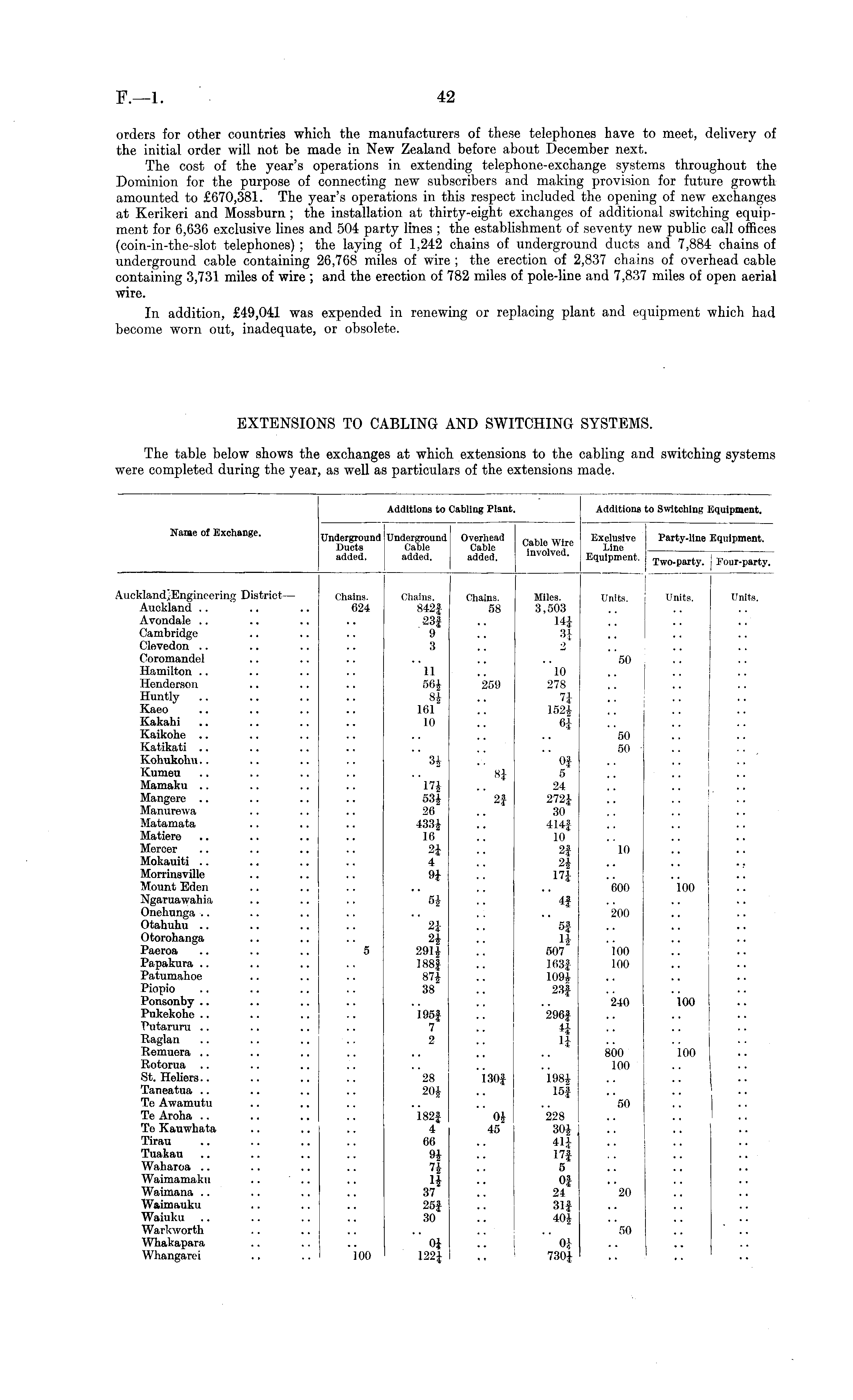 orders for other countries which the manufacturers of these telephones have to meet, delivery of the initial order will riot be made in New Zealand before about December next. The cost of the year's operations in extending telephone-exchange systems throughout the Dominion for the purpose of connecting new subscribers and making provision for future growth amounted to £670,381. The year's operations in this respect included the opening of new exchanges at Kerikeri and Mossburn ; the installation at thirty-eight exchanges of additional switching equipment for 6,636 exclusive lines and 504 party lines ; the establishment of seventy new public call offices (coin-in-the-slot telephones) ; the laying of 1,242 chains of underground ducts and 7,884 chains of underground cable containing 26,768 miles of wire ; the erection of 2,837 chains of overhead cable containing 3,731 miles of wire ; and the erection of 782 miles of pole-line and 7,837 miles of open aerial wire. In addition, £49,041 was expended in renewing or replacing plant and equipment which had become worn out, inadequate, or obsolete. EXTENSIONS TO CABLING AND SWITCHING SYSTEMS. The table below shows the exchanges at which extensions to the cabling and switching systems were completed during the year, as well as particulars of the extensions made.