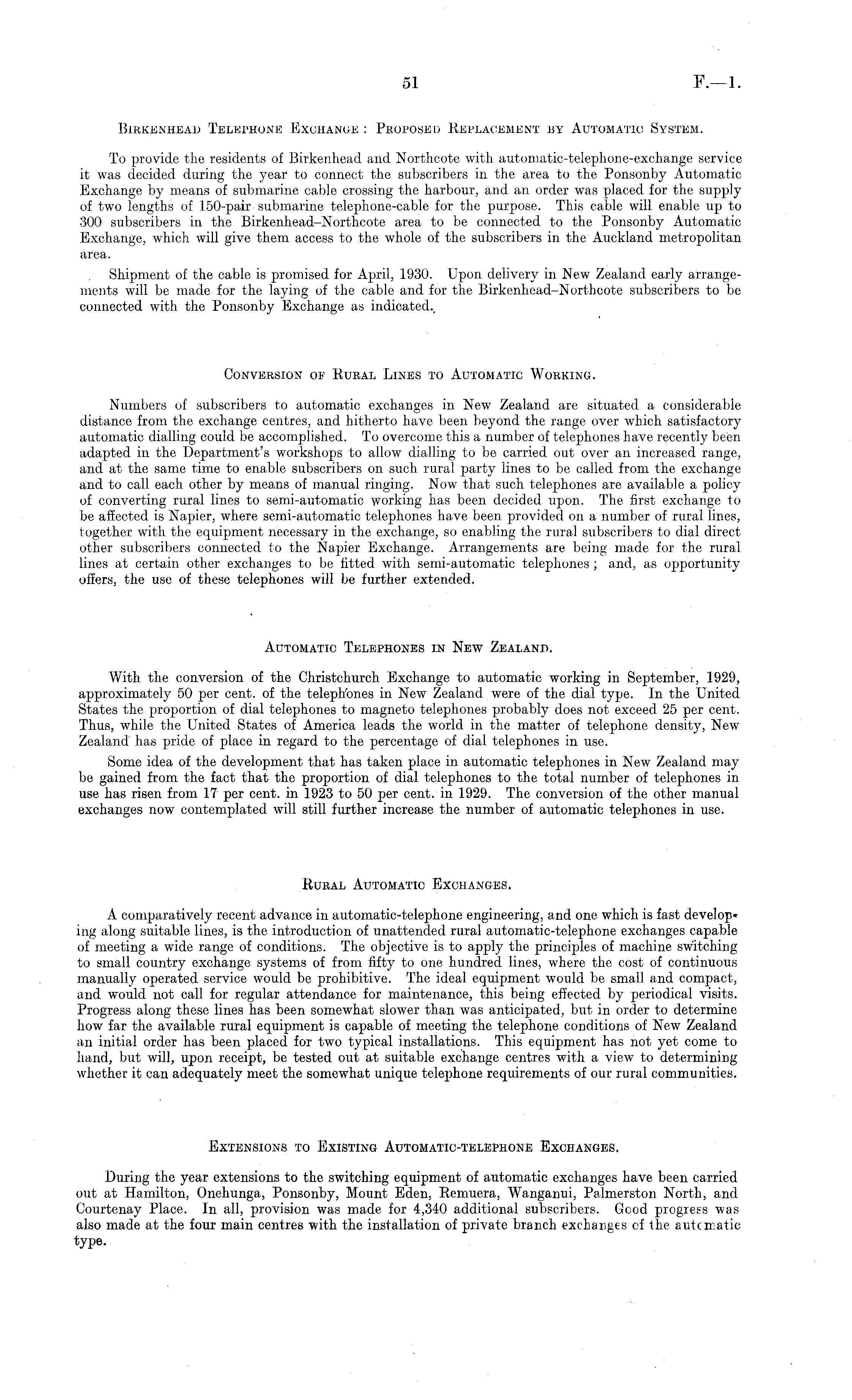 Birkenhead Telephone Exchange : Proposed Replacement by Automatic System. To provide the residents of Birkenhead and Northcote with automatic-telephone-exchange service it was decided during the year to connect the subscribers in the area to the Ponsonby Automatic Exchange by means of submarine cable crossing the harbour, and an order was placed for the supply of two lengths of 150-pair submarine telephone-cable for the purpose. This cable will enable up to 300 subscribers in the Birkenhead-Northcote area to be connected to the Ponsonby Automatic Exchange, which will give them access to the whole of the subscribers in the Auckland metropolitan area. Shipment of the cable is promised for April, 1930. Upon delivery in New Zealand early arrangements will be made for the laying of the cable and for the Birkenhead-Northcote subscribers to be connected with the Ponsonby Exchange as indicated.. Conversion of Rural Lines to Automatic Working. Numbers of subscribers to automatic exchanges in New Zealand are situated a considerable distance from the exchange centres, and hitherto have been beyond the range over which satisfactory automatic dialling could be accomplished. To overcome this a number of telephones have recently been adapted in the Department's workshops to allow dialling to be carried out over an increased range, and at the same time to enable subscribers on such rural party lines to be called from the exchange and to call each other by means of manual ringing. Now that such telephones are available a policy of converting rural lines to semi-automatic working has been decided upon. The first exchange to be affected is Napier, where semi-automatic telephones have been provided on a number of rural lines, together with the equipment necessary in the exchange, so enabling the rural subscribers to dial direct other subscribers connected to the Napier Exchange. Arrangements are being made for the rural lines at certain other exchanges to be fitted with semi-automatic telephones ; and, as opportunity offers, the use of these telephones will be further extended. Automatic Telephones in New Zealand. With the conversion of the Christchurch Exchange to automatic working in September, 1929, approximately 50 per cent, of the telephones in New Zealand were of the dial type. In the United States the proportion of dial telephones to magneto telephones probably does not exceed 25 per cent. Thus, while the United States of America leads the world in the matter of telephone density, New Zealand has pride of place in regard to the percentage of dial telephones in use. Some idea of the development that has taken place in automatic telephones in New Zealand may be gained from the fact that the proportion of dial telephones to the total number of telephones in use has risen from 17 per cent, in 1923 to 50 per cent, in 1929. The conversion of the other manual exchanges now contemplated will still further increase the number of automatic telephones in use. Rural Automatic Exchanges. A comparatively recent advance in automatic-telephone engineering, and one which is fast develop* ing along suitable lines, is the introduction of unattended rural automatic-telephone exchanges capable of meeting a wide range of conditions. The objective is to apply the principles of machine switching to small country exchange systems of from fifty to one hundred lines, where the cost of continuous manually operated service would be prohibitive. The ideal equipment would be small and compact, and would not call for regular attendance for maintenance, this being effected by periodical visits. Progress along these lines has been somewhat slower than was anticipated, but in order to determine how far the available rural equipment is capable of meeting the telephone conditions of New Zealand an initial order has been placed for two typical installations. This equipment has not yet come to hand, but will, upon receipt, be tested out at suitable exchange centres with a view to determining whether it can adequately meet the somewhat unique telephone requirements of our rural communities. Extensions to Existing Automatic-telephone Exchanges. During the year extensions to the switching equipment of automatic exchanges have been carried out at Hamilton, Onehunga, Ponsonby, 'Mount Eden, Remuera, Wanganui, Palmerston North, and Courtenay Place. In all, provision was made for 4,340 additional subscribers. Good progress was also made at the four main centres with the installation of private branch exchanges cf the autcmatic type.