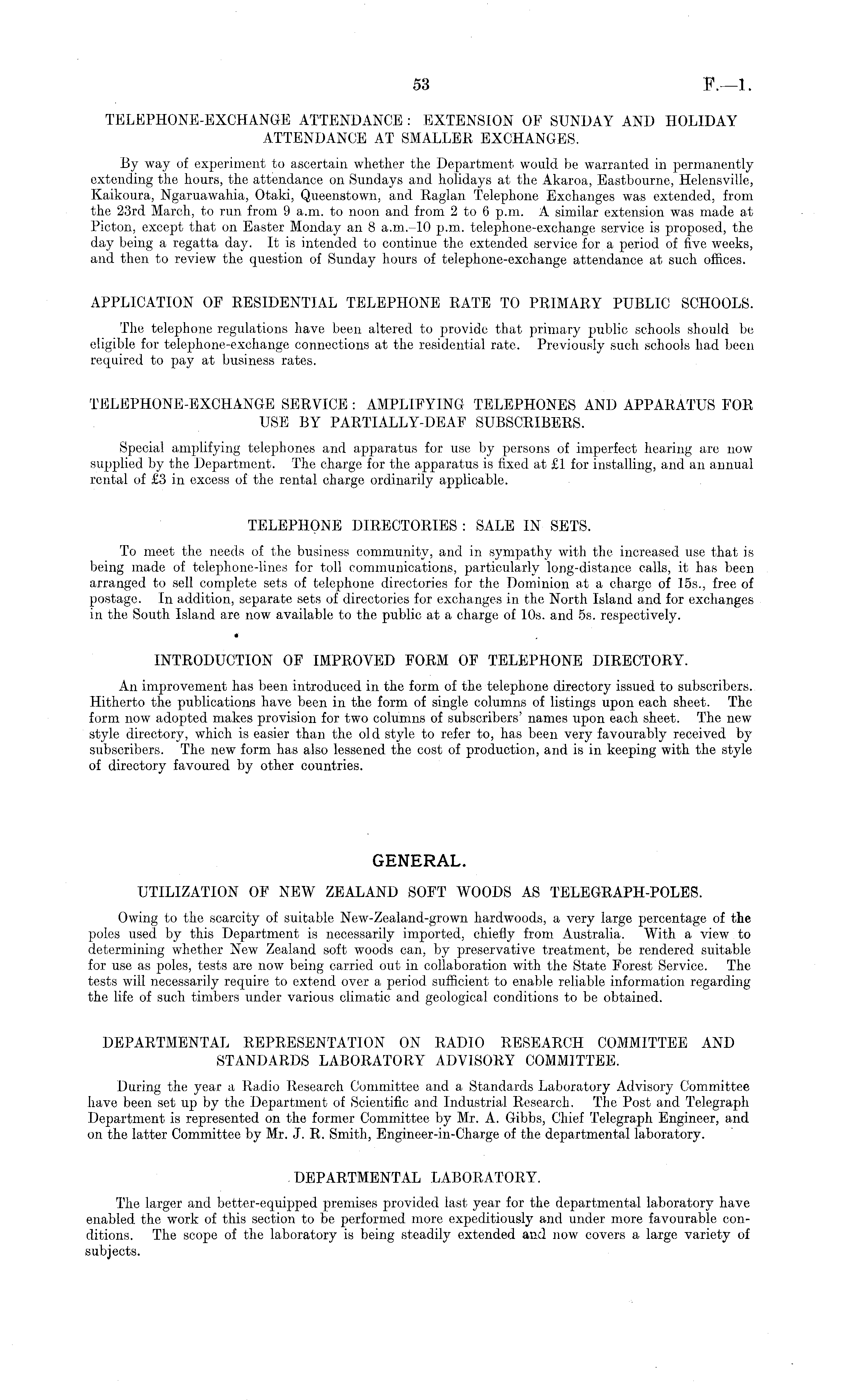 TELEPHONE-EXCHANGE ATTENDANCE : EXTENSION OF SUNDAY AND HOLIDAY ATTENDANCE AT SMALLER EXCHANGES. By way of experiment to ascertain whether the Department would be warranted in permanently extending the hours, the attendance on Sundays and holidays at the Akaroa, Eastbourne, Helensville, Kaikoura, Ngaruawahia, Otaki, Queenstown, and Raglan Telephone Exchanges was extended, from the 23rd March, to run from 9 a.m. to noon and from. 2to 6 p.m. A similar extension was made at Picton, except that on Easter Monday an 8 a.m.-10 p.m. telephone-exchange service is proposed, the day being a regatta day. It is intended to continue the extended service for a period of five weeks, and then to review the question of Sunday hours of telephone-exchange attendance at such offices. APPLICATION OF RESIDENTIAL TELEPHONE RATE TO PRIMARY PUBLIC SCHOOLS. The telephone regulations have been altered to provide that primary public schools should be eligible for telephone-exchange connections at the residential rate. Previously such schools had been required to pay at business rates. TELEPHONE-EXCHANGE SERVICE : AMPLIFYING TELEPHONES AND APPARATUS FOR USE BY PARTIALLY-DEAF SUBSCRIBERS. Special amplifying telephones and apparatus for use by persons of imperfect hearing are now supplied by the Department. The charge for the apparatus is fixed at £1 for installing, and an annual rental of £3 in excess of the rental charge ordinarily applicable. TELEPHONE DIRECTORIES : SALE IN SETS. To meet the needs of the business community, and in sympathy with the increased use that is being made of telephone-lines for toll communications, particularly long-distance calls, it has been arranged to sell complete sets of telephone directories for the Dominion at a charge of 155., free of postage. In addition, separate sets of directories for exchanges in the North Island and for exchanges in the South Island are now available to the public at a charge of 10s. and ss. respectively. • INTRODUCTION OF IMPROVED FORM OF TELEPHONE DIRECTORY. An improvement has been introduced in the form of the telephone directory issued to subscribers. Hitherto the publications have been in the form of single columns of listings upon each sheet. The form now adopted makes provision for two columns of subscribers' names upon each sheet. The new style directory, which is easier than the old style to refer to, has been very favourably received by subscribers. The new form has also lessened the cost of production, and is in keeping with the style of directory favoured by other countries. GENERAL. UTILIZATION OF NEW ZEALAND SOFT WOODS AS TELEGRAPH-POLES. Owing to the scarcity of suitable New-Zealand-grown hardwoods, a very large percentage of the poles used by this Department is necessarily imported, chiefly from Australia. With a view to determining whether New Zealand soft woods can, by preservative treatment, be rendered suitable for use as poles, tests are now being carried out in collaboration with the State Forest Service. The tests will necessarily require to extend over a period sufficient to enable reliable information regarding the life of such timbers under various climatic and geological conditions to be obtained. DEPARTMENTAL REPRESENTATION ON RADIO RESEARCH COMMITTEE AND STANDARDS LABORATORY ADVISORY COMMITTEE. During the year a Radio Research Committee and a Standards Laboratory Advisory Committee have been set up by the Department of Scientific and Industrial Research. The Post and Telegraph Department is represented on the former Committee by Mr. A. Gibbs, Chief Telegraph Engineer, and on the latter Committee by Mr. J. R. Smith, Engineer-in-Charge of the departmental laboratory. DEPARTMENTAL LABORATORY. The larger and better-equipped premises provided last year for the departmental laboratory have enabled the work of this section to be performed more expeditiously and under more favourable conditions. The scope of the laboratory is being steadily extended and now covers a large variety of subjects.