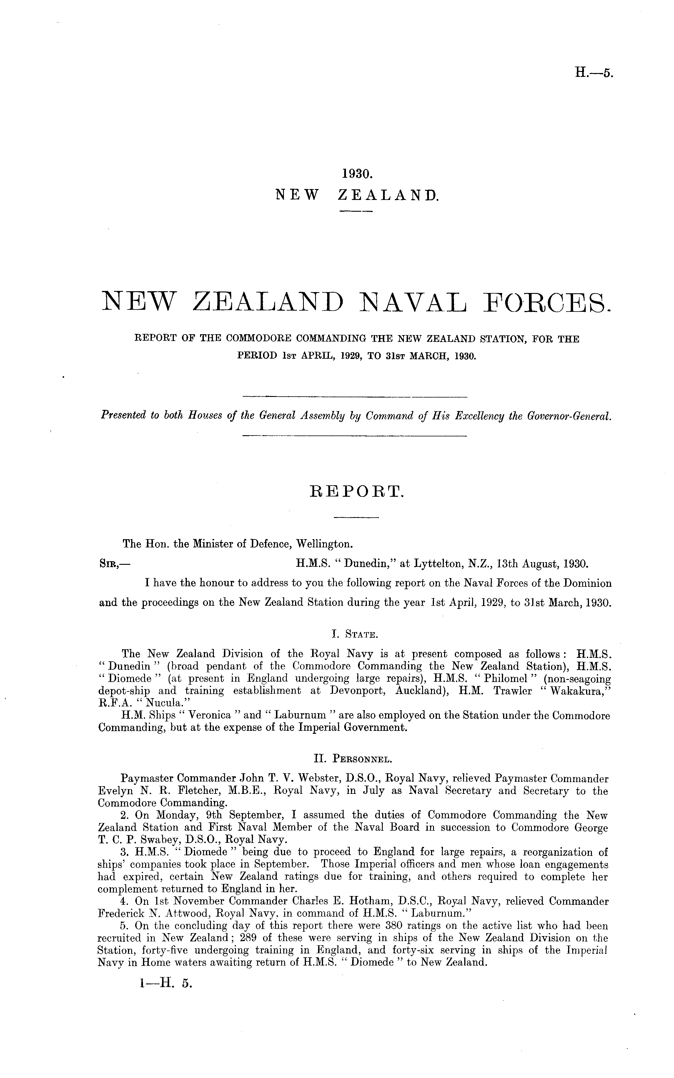 REPORT. The Hon. the Minister of Defence, Wellington. Sir, — H.M.S. " Dunedin," at Lyttelton, N.Z., 13th August, 1930. I have the honour to address to you the following report on the Naval Forces of the Dominion and the proceedings on the New Zealand Station during the year Ist April, 1929, to 31st March, 1930. I. State. The New Zealand Division of the Royal Navy is at present composed as follows : H.M.S. " Dunedin " (broad pendant of the Commodore Commanding the New Zealand Station), H.M.S. " Diomede " (at present in England undergoing large repairs), H.M.S. " Philomel " (non-seagoing depot-ship and training establishment at Devonport, Auckland), H.M. Trawler " Wakakura," R.F.A. " Nucula." H.M. Ships " Veronica " and " Laburnum " are also employed on the Station under the Commodore Commanding, but at the expense of the Imperial Government. 11. Personnel. Paymaster Commander John T. V. Webster, D.5.0., Royal Navy, relieved Paymaster Commander Evelyn N. R. Fletcher, M.8.E., Royal Navy, in July as Naval Secretary and Secretary to the Commodore Commanding. 2. On Monday, 9th September, I assumed the duties of Commodore Commanding the New Zealand Station and First Naval Member of the Naval Board in succession to Commodore George T. C. P. Swabey, D.5.0., Royal Navy. 3. H.M.S. " Diomede " being due to proceed to England for large repairs, a reorganization of ships' companies took place in September. Those Imperial officers and men whose loan engagements had expired, certain New Zealand ratings due for training, and others required to complete her complement returned to England in her. 4. On Ist November Commander Charles E. Hotham, D.S.C., Royal Navy, relieved Commander Frederick N. Attwood, Royal Navy, in command of H.M.S. " Laburnum." 5. On the concluding day of this report there were 380 ratings on the active list who had been recruited in New Zealand; 289 of these were serving in ships of the New Zealand Division on the Station, forty-five undergoing training in England, and forty-six serving in ships of the Imperial Navv in Home waters awaiting return of H.M.S. " Diomede " to New Zealand.