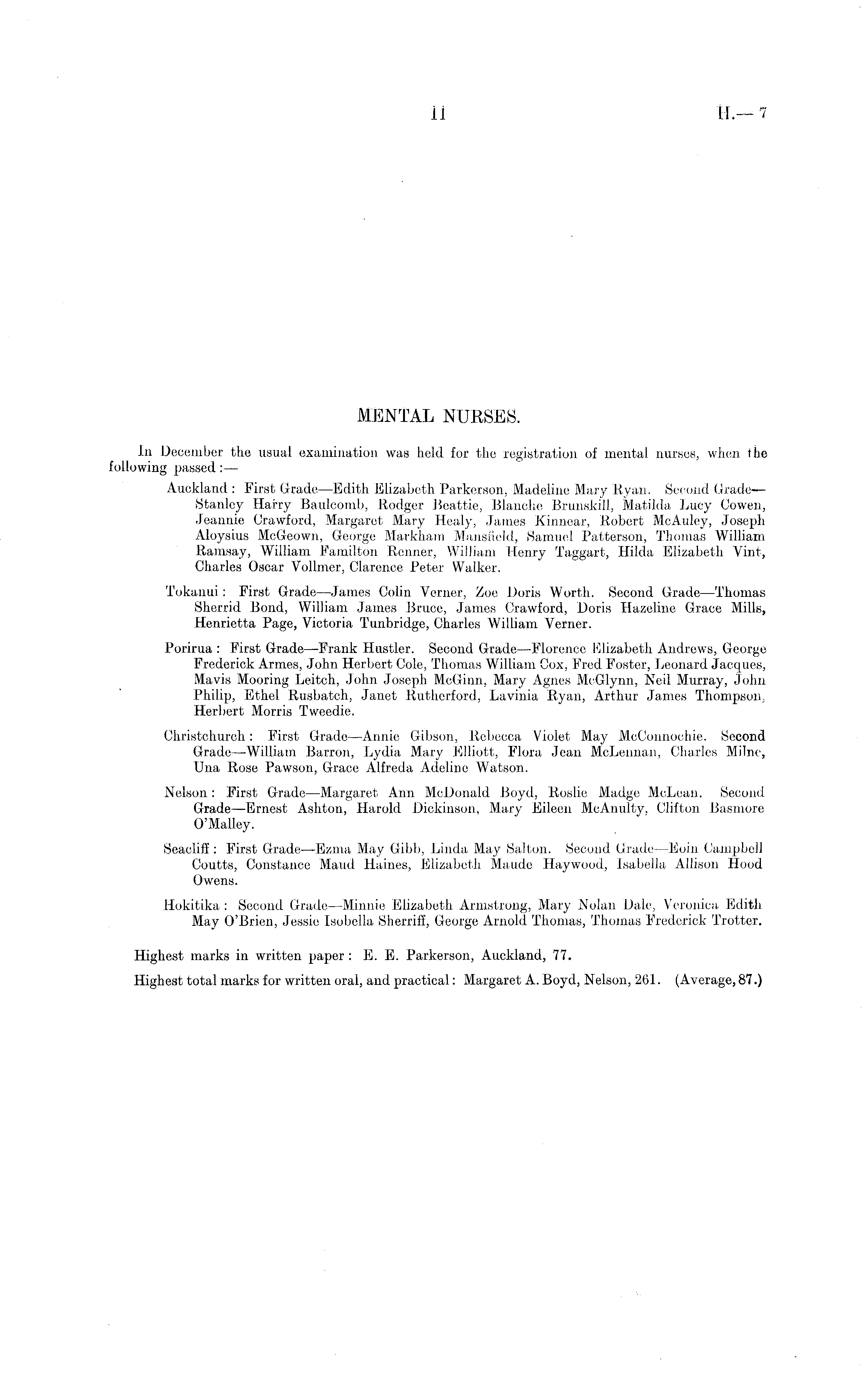 MENTAL NURSES. In December the usual examination was held for the registration of mental nurses, when the following passed :— Auckland : First Grade —Edith Elizabeth Parkerson, Madeline Mary Ryan. Second GradeStanley Harry Baulcomb, Rodger Beattie, Blanche Brunskill, Matilda Lucy Cowen, Jeannie Crawford, Margaret Mary Healy, James Kinnear, Robert McAuley, Joseph Aloysius McGeown, George Markham Mansfield, Samuel Patterson, Thomas William Ramsay, William Familton Renner, William Henry Taggart, Hilda Elizabeth Vint, Charles Oscar Vollmer, Clarence Peter Walker. Tokanui: First Grade —James Colin Verner, Zoe Doris Worth. Second Grade —Thomas Sherrid Bond, William James Bruce, James Crawford, Doris Hazeline Grace Mills, Henrietta Page, Victoria Tunbridge, Charles William Yerner. Porirua : First Grade —Frank Hustler. Second Grade —Florence Elizabeth Andrews, George Frederick Armes, John Herbert Cole, Thomas William Cox, Fred Foster, Leonard Jacques, Mavis Mooring Leitch, John Joseph McGinn, Mary Agnes McGlynn, Neil Murray, John Philip, Ethel Rusbatch, Janet Rutherford, Lavinia Ryan, Arthur James Thompson, Herbert Morris Tweedie. Christchurch: First Grade —Annie Gibson, Rebecca Violet May McConnoohie. Second Grade —William Barron, Lydia Mary Elliott, Flora Jean McLennan, Charles Milne, Una Rose Pawson, Grace Alfreda Adeline Watson. Nelson: First Grade —Margaret Ann McDonald Boyd, Roslie Madge McLean. Second Grade —Ernest Ashton, Harold Dickinson, Mary Eileen McAnulty. Clifton Basmore O'Malley. SeaelifE: First Grade—Ezma May Gibb, Linda May Salton. Second Grade—Eoin Campbell Coutts, Constance Maud Haines, Elizabeth Maude Haywood, Isabella Allison Hood Owens. Hokitika : Second Grade—Minnie Elizabeth Armstrong, Mary Nolan Dale, Veronica Edith May O'Brien, Jessie Isobella Sherriff, George Arnold Thomas, Thomas Frederick Trotter. Highest marks in written paper : E. E. Parkerson, Auckland, 77. Highest total marks for written oral, and practical: Margaret A. Boyd, Nelson, 261. (Average, 87.)