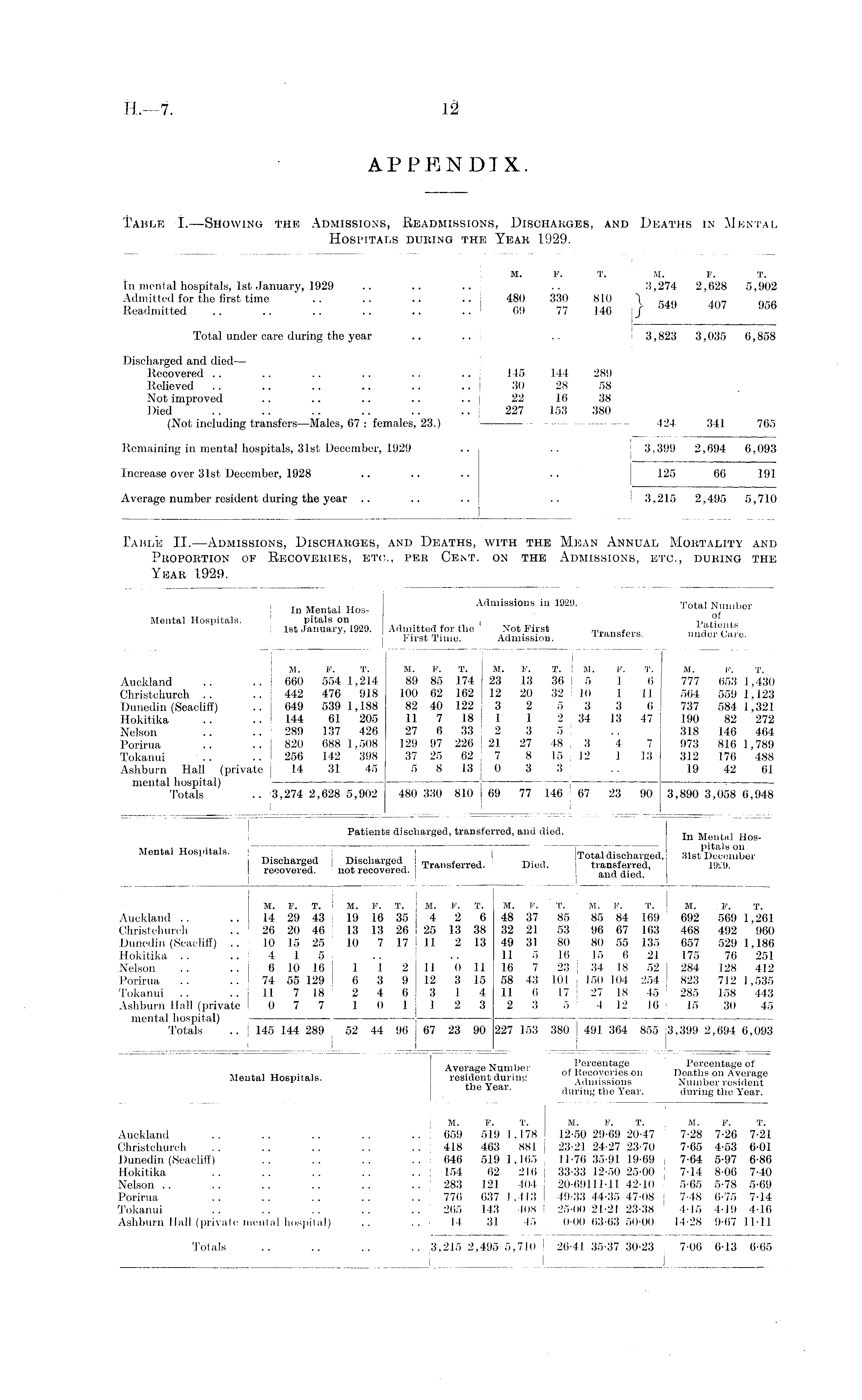 Admissions in 1929. Tntal Nnmhov i In Mental Hos- lotai xjumber Mental Hospitals. pitals on . p .9* 1st January, 1929. Admitted for the Not First Transfers under Cai^ | First Time. Admission. iranBters. under Gaie. I M. F. T. M. F. T. M. F. T. ! M. F. T. M. F. T. Auckland .. .. 660 554 1,214 89 85 174 23 13 36 | 5 1 6 777 653 1,430 Christchurch .. .. 442 476 918 100 62 162 12 20 32 j 10 1 il 564 559 J, 123 Dunedin (Seacliff) .. 649 539 1,188 82 40 122 3 2 5 3 3 6 737 584 1,321 Hokitika .. .. 144 61 205 11 7 18 1 1 2 34 13 47 190 82 272 Nelson .. .. 289 137 426 27 6 33 2 3 5 . . 318 146 464 Porirua .. .. 820 688 1,508 129 97 226 21 27 48 3 4 7 973 816 1,789 Tokanui .. .. 256 142 398 37 25 62 7 8 15 12 1 13 312 176 488 Ashburn Hall (private 14 31 45 5 8 13 0 3 3 . . 19 42 61 mental hospital) 1 , : Totals .. 3,274 2,628 5,902 480 330 810 169 77 146 67 23 90 3,890 3,058 6,948 Patients discharged, transferred, and died. , i n Mental Hos Mental Hospitals. | | i Total discharged 'i 1 sMh'I-.-n! h<-1 | SMS? Died. M. F. T. M. F. T. M. F. T. M. F. T. M. F. T. I M. F. T. Auckland .. .. .14 29 43 19 16 35 4 2 6 48 37 85 85 84 169 692 569 1,261 Christ-church .. 26 20 46 13 13 26 25 13 38 32 21 53 96 67 163 468 492 960 Dunedin (Seacliff) .. 10 15 25 10 7 17 11 2 13 49 31 80 80 55 135 657 529 1,186 Hokitika .. .. 4 1 5 .. .. 11 5 16 15 6 21 175 76 251 Nelson .. .. 6 10 16 1 1 2 11 0 11 16 7 23 34 18 52 I 284 128 412 Porirua .. .. 74 55 129 6 3 9 12 3 15 58 43 101 - 150 104 254 ! 823 712 1,535 Tokanui .. 11 7 18 2 4 6 3 1 4 11 6 17 27 18 45 1 285 158 443 Ashburn Hall (private 0 7 7 101 12323 5 1 4 12 16 15 30 45 mental hospital) , ! Totals .. 145 144 289 52 44 96 67 23 90 227 153 380 1491 364 855 3,399 2,694 6,093 Avm-asp Nnmhpi- Percentage Percentage of Mental Hospitals rlsidfnt du™ n- of Recoveries on Deaths on Average Mental Hospitals. resident oui Admissions ; Number resident during the Year. during the Year. M. F. T. M. F. T. M. F. T. Auckland .. .. .. .. .. 659 519 1.178 12-50 29-69 20-47 7-28 7-26 7-21 Christchurch . . .. .. . . .. 418 463 881 23-21 24-27 23-70 7-65 4-53 6-01 Dunedin (Seacliff) .. .. .. .. 646 519 1,165 11-76 35-91 19-69 - 7-64 5-97 6-86 Hokitika .. .. .. .. 154 62 216 33-33 12-50 25-00 7-14 8-06 7-40 Nelson .. .. .. .. .. .. 283 121 404 20-69111-11 42-10 5-65 5-78 5-69 Porirua .. .. .. .. .. 776 637 1,413 49-33 44-35 47-08 ! 7-48 6-75 7-14 Tokanui .. .. .. .. .. 265 143 408 25-00 21-21 23-38 4-15 4-19 4-16 Ashburn Hall (private mental hospital) .. .. - 14 31 45 0-00 63-63 50-00 14-28 9-67 11-11 Totals .. .. .. .. j3, 215 2,495 5,710 j 26-41 35-37 30-23 7-06 6-13 6-65