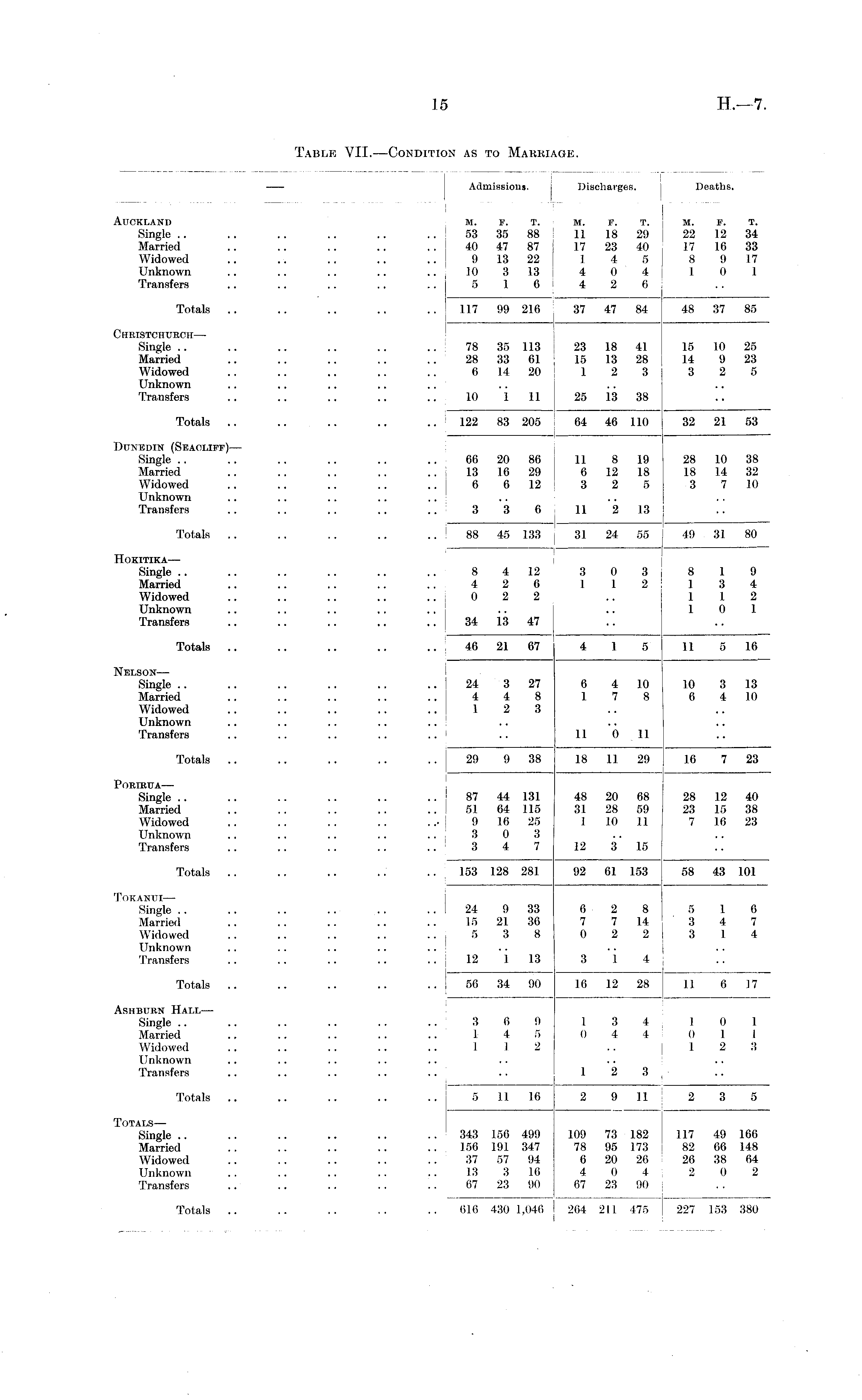 j Admissions. | Discharges. j Deaths. Auckland m. f. t. m. f. t. m. f. t. Single .. .. .. .. .. .. 53 35 88 11 18 29 22 12 34 Married .. .. .. .. . . 40 47 87 17 23 40 17 16 33 Widowed .. .. .. .. .. 9 13 22 1 4 5 8 9 17 Unknown .. .. .. .. .. 10 3 13 4 0 4 1 0 1 Transfers .. .. .. .. .. 5 16 426 Totals .. .. .. .. .. 117 99 216 37 47 84 48 37 85 C HKISTCHUECH— Single .. .. .. .. .. .. 78 35 113 23 18 41 15 10 25 Married .. .. .. .. .. 28 33 61 15 13 28 14 9 23 Widowed .. .. .. .. .. 6 14 20 1 2 3 3 2 5 Unknown Transfers .. .. .. .. .. 10 1 11 25 13 38 Totals .. .. .. .. .. 122 83 205 64 46 110 32 21 53 Dunedin (Seaclijt)— Single.. .. .. .. .. .. 66 20 86 11 8 19 28 10 38 Married .. .. .. .. .. 13 16 29 6 12 18 18 14 32 Widowed .. .. .. .. .. 6 6 12 3 2 5 3 7 10 Unknown Transfers .. .. .. .. .. 336 11 2 13 Totals .. .. .. .. .. 88 45 133 31 24 55 49 31 80 Hokitika— Single .. .. .. .. .. .. 84 12 303 819 Married .. .. .. .. .. 426 1 1 2 1 34 Widowed .. .. .. .. .. 022 .. 112 Unknown .. .. .. .. .. .. .. 10 1 Transfers .. .. .. .. .. 34 13 47 1 I Totals .. .. .. .. .. 46 21 67 4 1 5 11 5 16 Nelson — Single.. .. .. .. .. .. 24 3 27 6 4 10 10 3 13 Married .. .. .. .. .. 448 1 78 64 10 Widowed .. .. .. .. .. 12 3 Unknown Transfers .. .. .. .. .. .. 11 011 Totals .. .. .. .. .. 29 9 38 18 11 29 16 7 23 PORIBUA Single .. .. .. .. .. .. 87 44 131 48 20 68 28 12 40 Married .. .. .. .. .. I 51 64 115 31 28 59 23 15 38 Widowed .. .. .. .. . 9 16 25 1 10 11 7 16 23 Unknown .. ■. .. .. ..303 Transfers .. .. .. .. ..3 4 7 12 3 15 Totals .. .. .. . . .. 153 128 281 92 61 153 58 43 101 Tokanui — Single .. .. .. .. .. .. I 24 9 33 6 2 8 5 1 6 Married .. .. .. .. .. 15 21 36 7 7 14 3 4 7 Widowed .. .. .. .. ..5 3 8 0 2 2 3 1 4 Unknown .. .. .. .. Transfers .. . . .. .. .. 12 1 13 3 14 Totals .. .. .. .. .. 56 34 90 16 12 28 II 6 17 Ashburn Hall — Single .. .. .. .. .. .. 369 1 341 0 1 Married .. .. .. .. .. 1 4 5 0 4 4 0 11 Widowed .. .. .. .. .. 112 .. 12 3 Unknown Transfers .. .. .. .. .. .. 1 2 3 ( Totals .. .. .. .. .. 5 11 16 2 9 11 2 3 5 Totals — Single .. .. .. .. .. 343 156 499 109 73 182 117 49 166 Married . . .. .. .. .. 156 191 347 78 95 173 82 66 148 Widowed .. .. .. .. .. ; 37 57 94 6 20 26 26 38 64 Unknown .. .. .. .. .. 13 3 16 4 0 4 2 0 2 Transfers .. .. .. .. .. 67 23 90 67 23 90 Totals .. .. .. .. .. 616 430 1,046 264 211 475 227 153 380