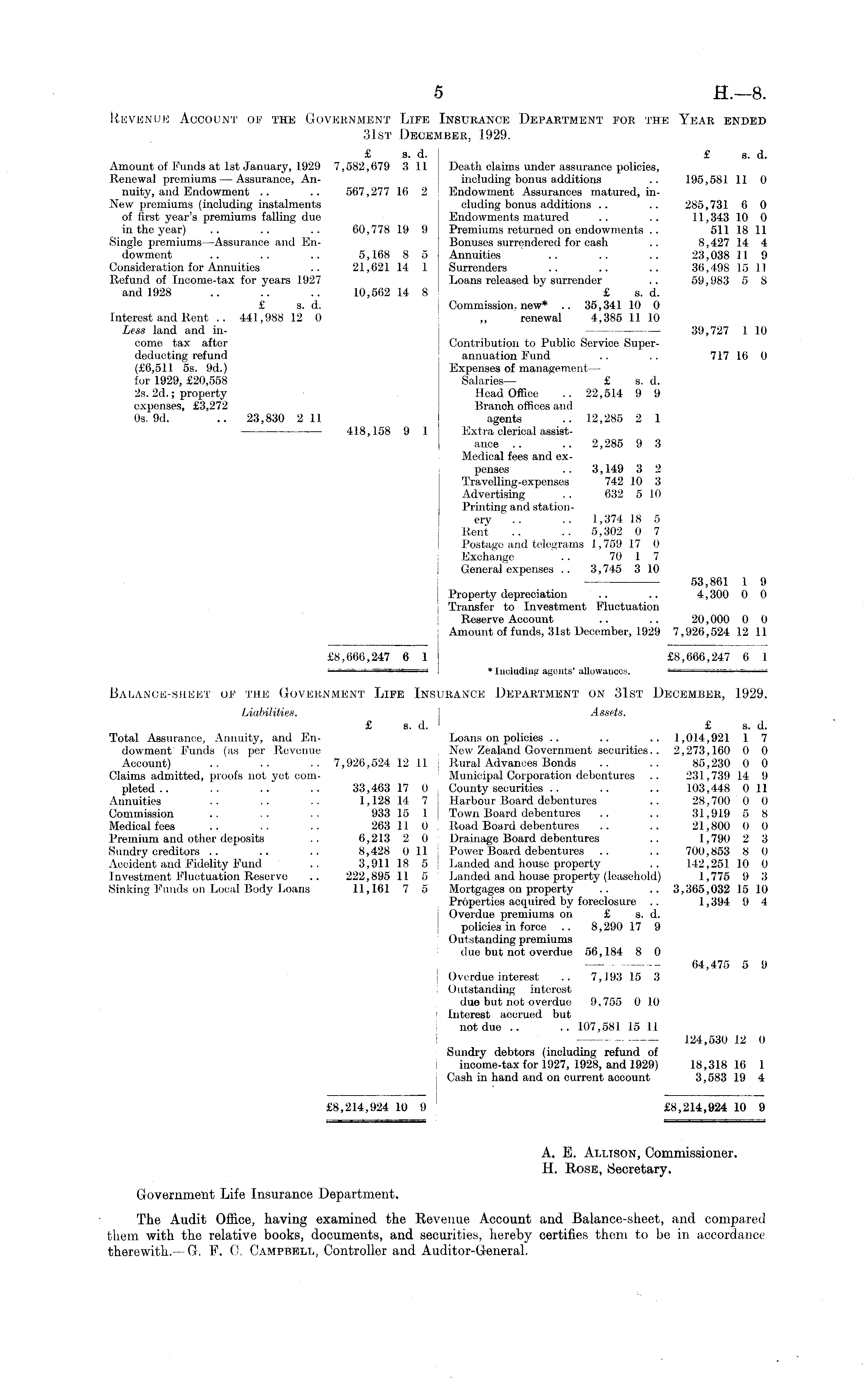 Revenue Account of the Government Life Insurance Department for the Year ended 31st December, 1929. £ s. d. £ a. d. Amount of Funds at Ist January, 1929 7,582,679 311 Death claims under assurance policies, Renewal premiums — Assurance, An- including bonus additions .. 195,581 11 0 nuity, and Endowment .. .. 567,277 16 2 Endowment Assurances matured, inNew premiums (including instalments eluding bonus additions .. .. 285,731 6 0 of first year's premiums falling due Endowments matured .. .. 11,343 10 0 in the year) .. .. .. 60,778 19 9 Premiums returned on endowments .. 511 18 11 Single premiums—Assurance and En- Bonuses surrendered for cash .. 8,427 14 4 dowment .. .. .. 5,16885 Annuities .. .. .. 23,038 11 9 Consideration for Annuities .. 21,621 14 1 Surrenders .. .. .. 36,498 15 11 Refund of Income-tax for years 1927 Loans released by surrender .. 59,983 5 S and 1928 .. .. .. 10,562 14 8 £ s. d. £ s. d. Commission, new* .. 35,341 10 0 Interest and Rent .. 441,988 12 0 ~ renewal 4,385 11 10 Less land and in- 39,727 1 10 come tax after Contribution to Public Service Superdeducting refund annuation Fund .. .. 717 16 0 (£6,511 ss. 9d.) Expenses of management — for 1929, £20,558 Salaries— £ s. d. 2s. 2d.; property Head Office .. 22,514 9 9 expenses, £3,272 Branch offices and os. 9d. .. 23,830 211 agents .. 12,285 2 1 418,158 9 1 Extra clerical assistance .. .. 2,285 9 3 Medical fees and expenses .. 3,149 3 2 Travelling-expenses 742 10 3 Advertising . . 632 5 10 Printing and stationery .. .. 1,374 18 5 Rent .. .. 5,302 0 7 Postage and telegrams 1,759 17 0 Exchange .. 70 1 7 General expenses .. 3,745 310 53,861 1 9 Property depreciation .. .. 4,300 0 0 Transfer to Investment Fluctuation Reserve Account . . .. 20,000 0 0 Amount of funds, 31st December, 1929 7,926,524 12 11 £8,666,247 6 1 ' £8,666,247 6 1 " " ~ - * Including agents' allowances. —• ~~ Balance-sheet of the Government Life Insurance Department on 31st December, 1929. Liabilities. j Assets. £ s. d. £ s. d. Total Assurance, Annuity, and En- Loans on policies .. .. .. 1,014,921 1 7 dowment Funds (as per Revenue New Zealand Government securities.. 2,273,160 0 0 Account) . . . . 7,926,524 12 11 Rural Advances Bonds .. .. 85,230 0 0 Claims admitted, proofs not yet com- Municipal Corporation debentures .. 231,739 14 9 pleted .. .. .. .. 33,463 17 0 County securities .. .. .. 103,448 011 Annuities .. .. .. 1,128 14 7 Harbour Board debentures .. 28,700 0 0 Commission .. .. . . 933 15 1 Town Board debentures .. .. 31,919 5 8 Medical fees .. .. .. 263 11 0 Road Board debentures .. .. 21,800 0 0 Premium and other deposits .. 6,213 2 0 Drainage Board debentures .. 1,790 2 3 Sundry creditors .. .. .. 8,428 011 Power Board debentures .. .. 700,853 8 0 Accident and Fidelity Fund .. 3,911 18 5 Landed and house property .. 142,251 10 0 Investment Fluctuation Reserve .. 222,895 11. 5 Landed and house property (leasehold) 1,775 9 3 Sinking Funds on Local Body Loans 11,161 7 5 Mortgages on property .. .. 3,365,032 15 10 Properties acquired by foreclosure .. 1,394 9 4 Overdue premiums on £ s. d. policies in force .. 8,290 17 9 Outstanding premiums due but not overdue 56,184 8 0 64,475 5 9 Overdue interest .. 7,193 15 3 Outstanding interest due but not overdue 9,755 0 10 Interest accrued but not due .. .. 107,581 15 11 124,530 12 0 Sundry debtors (including refund of income-tax for 1927, 1928, and 1929) 18,318 16 1 Cash in hand and on current account 3,583 19 4 £8,214,924 10 9 £8,214,924 10 9 A. E. Allison, Commissioner. H. Rose, Secretary. Government Life Insurance Department. The Audit Office, having examined the Revenue Account and Balance-sheet, and compared them with the relative books, documents, and securities, hereby certifies them to be in accordance therewith.—G. F. 0. Campbell, Controller and Auditor-General.