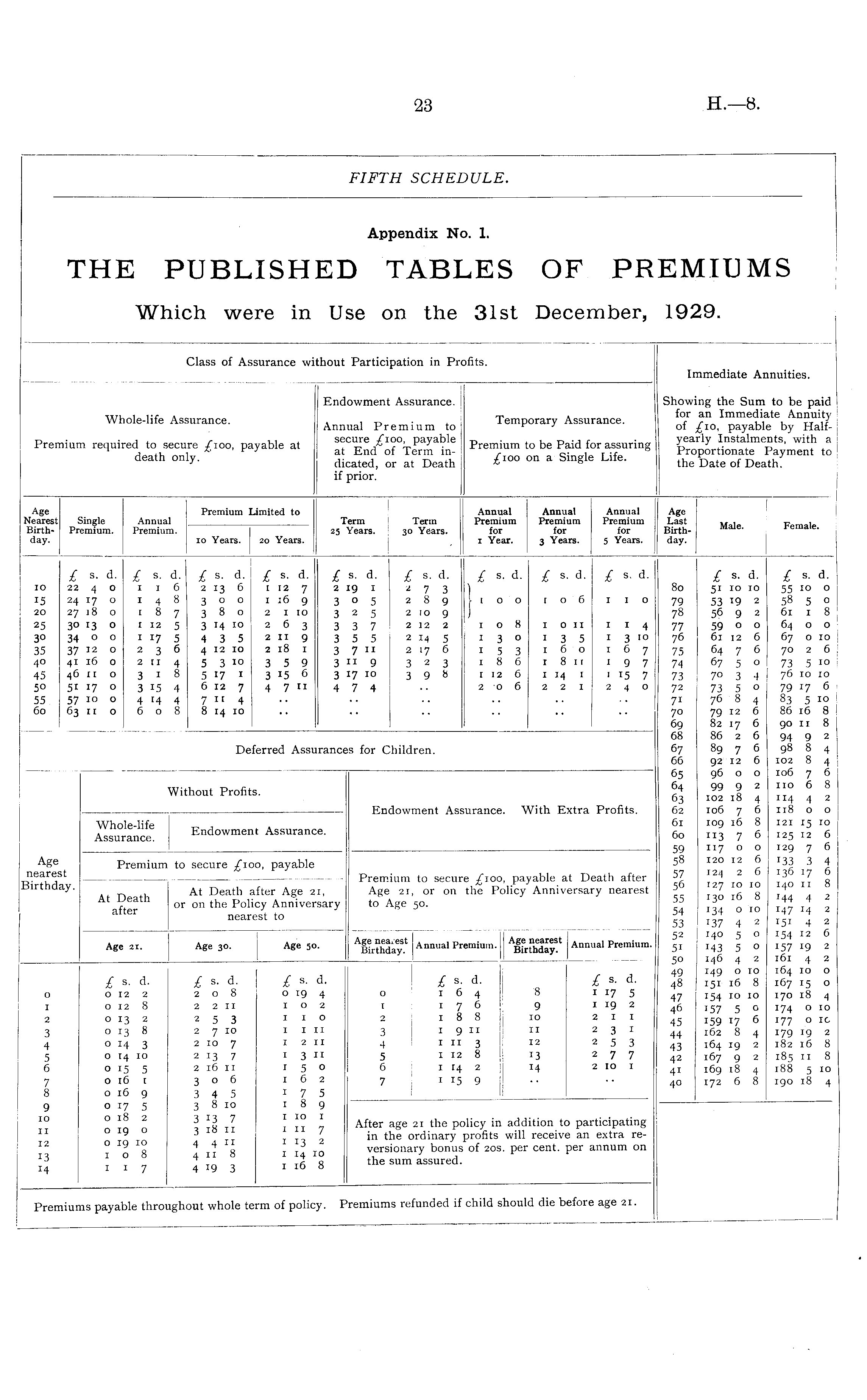 Appendix No. 1. THE PUBLISHED TABLES OF PREMIUMS Which were in Use on the 31st December, 1929.