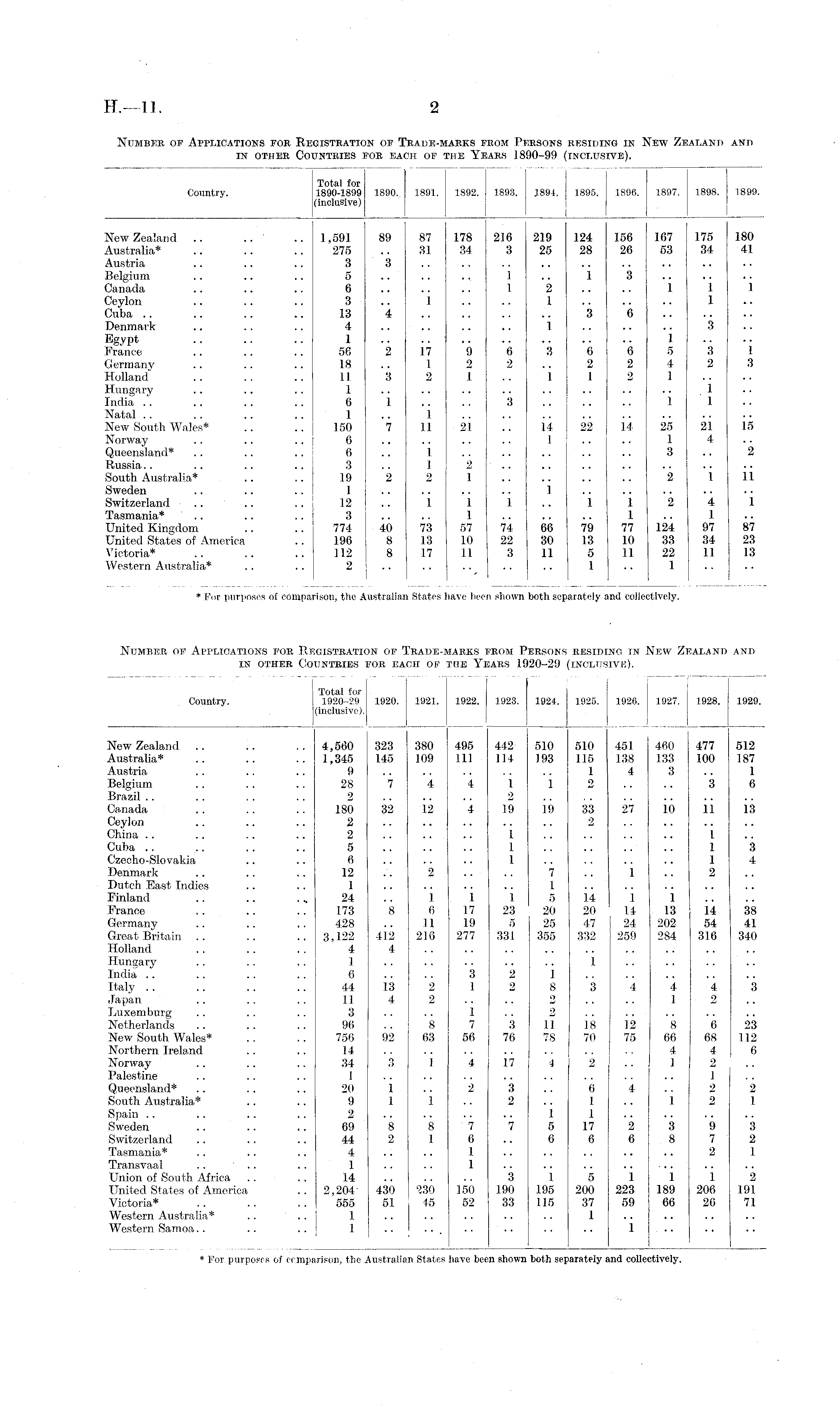 Number of Applications for Registration of Trade-marks from Persons residing in New Zealand and in other Countries for each of the Years 1920-29 (inclusive).