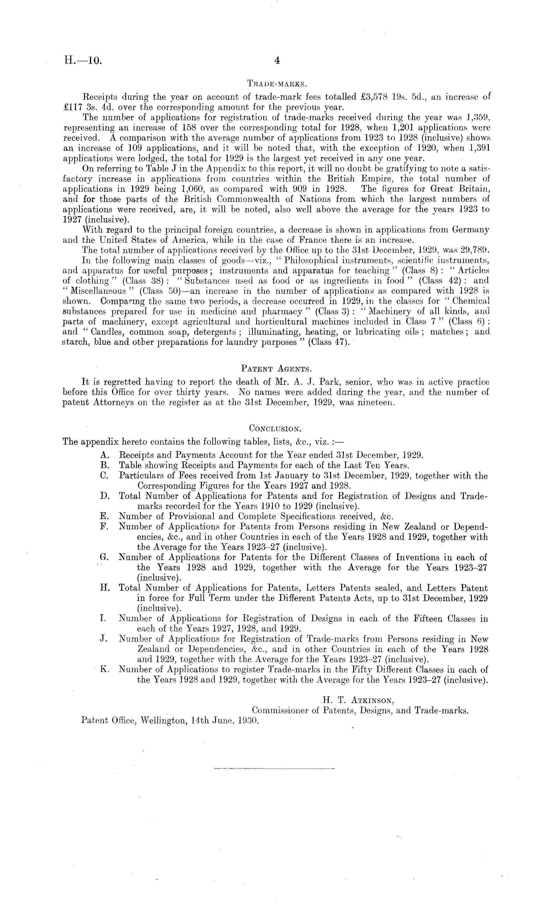 Trade-marks. Receipts during tile year on account of trade-mark fees totalled £3,573 19s. 5d., an increase of £117 3s. 4d. over the corresponding amount for the previous year. The number of applications for registration of trade-marks received during the year was 1,359, representing an increase of 158 over the corresponding total for 1928, when 1,201 applications were received. A comparison with the average number of applications from 1923 to .1928 (inclusive) shows an increase of 109 applications, and it will be noted that, with the exception of 1920, when 1,391 applications were lodged, the total for 1929 is the largest yet received in any one year. On referring to Table J in the Appendix to this report, it will no doubt be gratifying to note a satisfactory increase in applications from countries within the British Empire, the total number of applications in 1929 being 1,060, as compared with 909 in 1928. The figures for Great Britain, and for those parts of the British Commonwealth of Nations from which the largest numbers of applications were received, are, it will be noted, also well above the average for the years 1923 to 1927 (inclusive). With regard to the principal foreign countries, a decrease is shown in applications from Germany and the United States of America, while in the case of France there is an increase. The total number of applications received by the Office up to the 31st December, 1929, was 29,789. In the following main classes of goods —viz., " Philosophical instruments, scientific instruments, and apparatus for useful purposes; instruments' and apparatus for teaching" (Class 8): "Articles of clothing " (Class 38) : " Substances used as food or as ingredients in food " (Class 42) : and " Miscellaneous " (Class 50) —an increase in the number of applications as compared with 1928 is shown. Comparing the same two periods, a decrease occurred in 1929, in the classes for " Chemical substances prepared for use in medicine and pharmacy " (Class 3) : " Machinery of all kinds, and parts of machinery, except agricultural and horticultural machines included in Class 7 " (Class 6) : and " Candles, common soap, detergents ; illuminating, heating, or lubricating oils ; matches; and starch, blue and otber preparations for laundry purposes " (Class 47). Patent Agents. It is regretted having to report the death of Mr. A. J. Park, senior, who was in active practice before this Office for over thirty years. No names were added during the year, and the number of patent Attorneys on the register as at the 31st December, 1929, was nineteen. Conclusion. The appendix hereto contains the following tables, lists, &c., viz. : — A. Receipts and Payments Account for the Year ended 31st December, 1929. B. Table showing Receipts and Payments for each of the Last Ten Years. C. Particulars of Fees received from Ist January to 31st December, 1929, together with the Corresponding Figures for the Years 1927 and 1928. D. Total Number of Applications for Patents and for Registration of Designs and Trademarks recorded for the Years 1910 to 1929 (inclusive). E. Number of Provisional and Complete Specifications received, &c. F. Number of Applications for Patents from Persons residing in New Zealand or Dependencies, &c., and in other Countries in each of the Years 1928 and 1929, together with the Average for the Years 1923-27 (inclusive). G. Number of Applications for Patents for the Different Classes of Inventions in each of the Years 1928 and 1929, together with the Average for the Years 1923-27 (inclusive). IT. Total Number of Applications for Patents, Letters Patents sealed, and Letters Patent in force for Full Term under the Different Patents Acts, up to 31st December, 1929 (inclusive). I. Number of Applications for Registration of Designs in each of the Fifteen Classes in each of the Years 1927, 1928, and 1929. J. Number of Applications for Registration of Trade-marks from Persons residing in New Zealand or Dependencies, &c., and in other Countries in each of the Years 1928 and 1929, together with the Average for the Years 1923-27 (inclusive). K. Number of Applications to register Trade-marks in the Fifty Different Classes in each of the Years 1928 and 1929, together with the Average for the Years 1923-27 (inclusive). H. T. Atkinson, Commissioner of Patents, Designs, and Trade-marks. Patent Office, Wellington, 14th June, 1930.