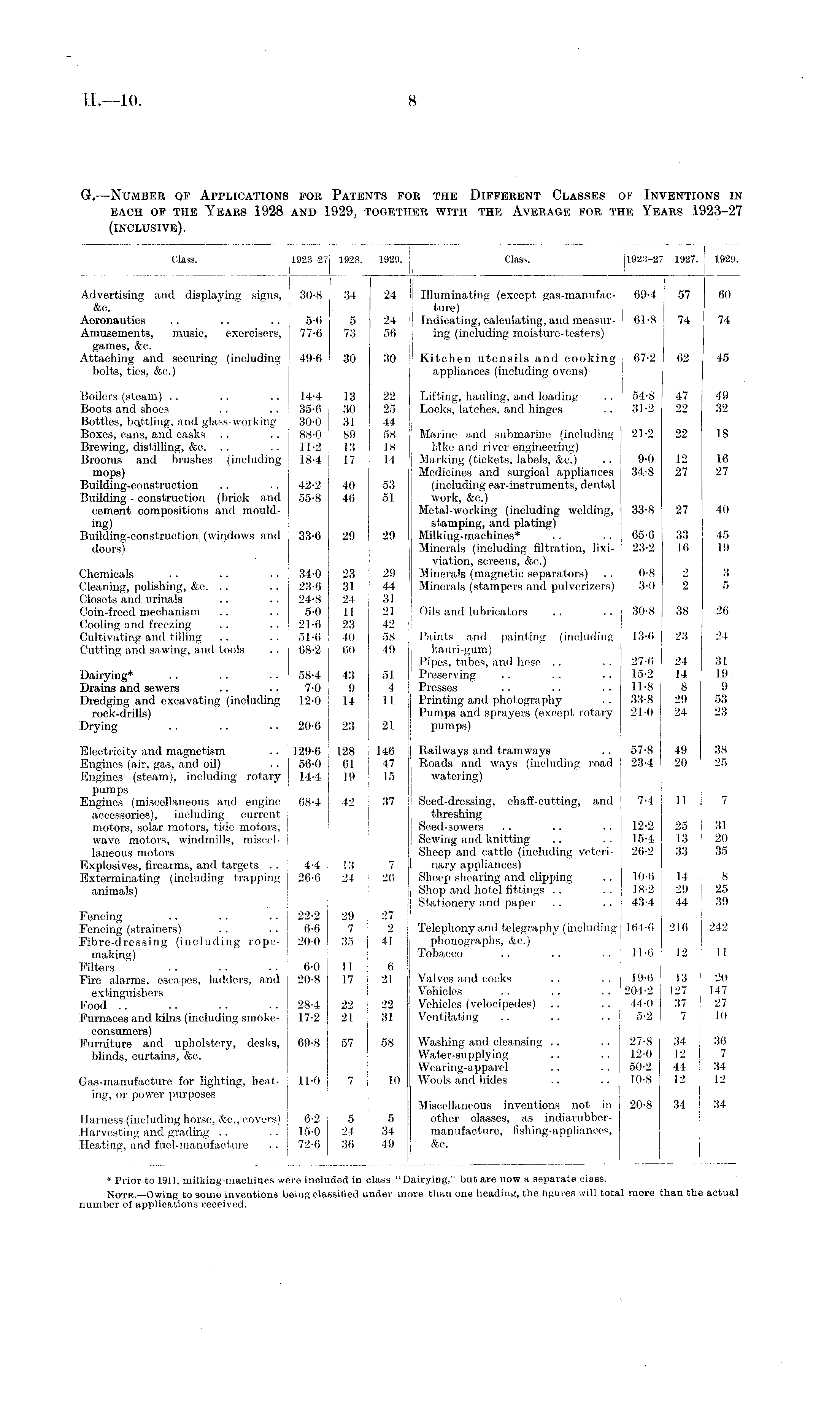 G. —Number of Applications for Patents for the Different Classes of Inventions in each of the Years 1928 and 1929, together with the Average for the Years 1923-27 (inclusive).