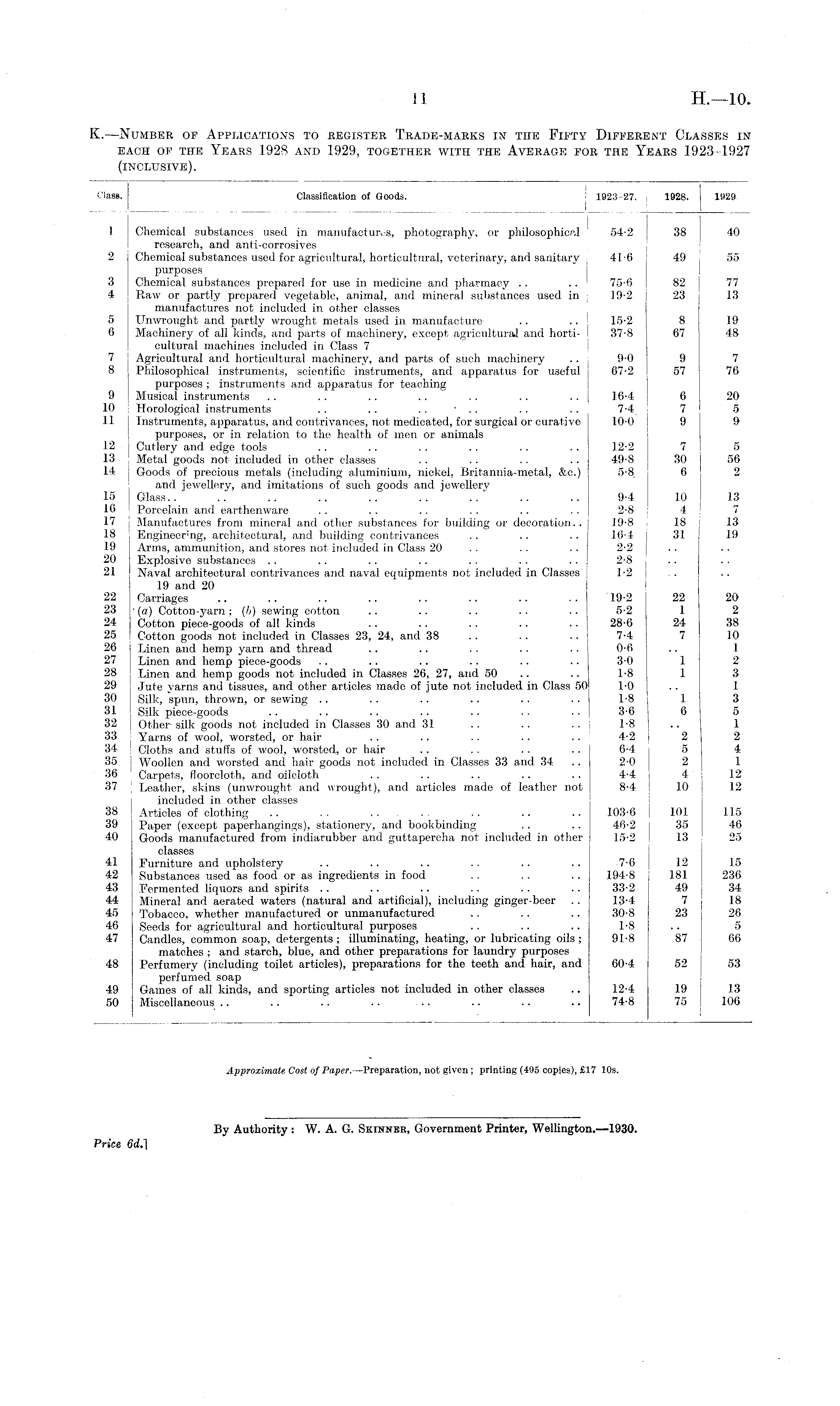 K.—Number of Applications to register Trade-marks in the Fifty Different Classes in each of the Years 1928 and 1929, together with the Average for the Years 1923-1927 (inclusive).