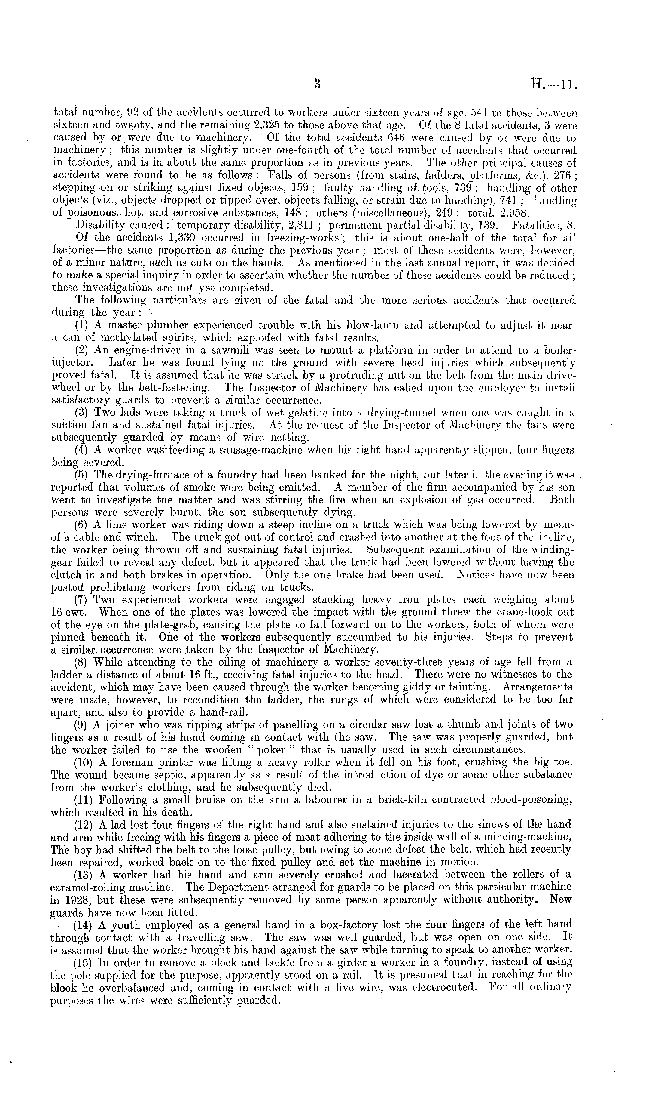 total number, 92 of the accidents occurred to workers under sixteen years of age, 541 to those between sixteen and twenty, and the remaining 2,325 to those above that age. 01' the 8 fatal accidents, 3 were caused by or were due to machinery. Of the total accidents 646 were caused by or were due to machinery ; this number is slightly under one-fourth of the total number of accidents that occurred in factories, and is in about the same proportion as in previous years. The other principal causes of accidents were found to be as follows : Falls of persons (from stairs, ladders, platforms, &c.), 276 ; stepping on or striking against fixed objects, 159 ; faulty handling of, tools, 739 ; handling of other objects (viz., objects dropped or tipped over, objects falling, or strain due to handling), 741 ; handling of jioisonous, hot, and corrosive substances, 148 ; others (miscellaneous), 249 ; total, 2,958. Disability caused : temporary disability, 2,811 ; permanent partial disability, 139. Fatalities, 8. Of the accidents 1,330 occurred in freezing-works ; this is about one-half of the total for all factories —the same proportion as during the previous year ; most of these accidents were, however, of a minor nature, such as cuts on the hands. As mentioned in the last annual report, it was decided to make a special inquiry in order to ascertain whether the number of these accidents could bo reduced ; these investigations are not yet completed. The following particulars are given of the fatal and the more serious accidents that occurred during the year (1) A master plumber experienced trouble with his blow-lamp and attempted to adjust it near a can of methylated spirits, which exploded with fatal results. (2) An engine-driver in a sawmill was seen to mount a jilatform in order to attend to a boilerinjector. Later he was found lying on the ground with severe head injuries which subsequently proved fatal. It is assumed that he was struck by a protruding nut on the belt from the main drivewheel or by the belt-fastening. The Inspector of Machinery has called upon the employer to install satisfactory guards to prevent a similar occurrence. (3) Two lads were taking a truck of wet gelatine into a drying-tunnel when one was caught in a suction fan and sustained fatal injuries. At the request of the Inspector of Machinery the fans were subsequently guarded by means of wire netting. (4) A worker was feeding a sausage-machine when his right hand apparently slipped, four lingers being severed. (5) The drying-furnace of a foundry had been banked for the night, but later in the evening it was reported that volumes of smoke were being emitted. A member of the firm accompanied by his son went to investigate the matter and was stirring the fire when an explosion of gas occurred. Both persons were severely burnt, the son subsequently dying. (6) A lime worker was riding down a steep incline on a truck which was being lowered by means of a cable and winch. The truck got out of control and crashed into another at the foot of the incline, the worker being thrown off and sustaining fatal injuries. Subsequent examination of the windinggear failed to reveal any defect, but it appeared that the truck had been lowered without having the clutch in and both brakes in operation. Only the one brake had been used. Notices have now been posted prohibiting workers from riding on trucks. (7) Two experienced workers were engaged stacking heavy iron plates each weighing about 16 cwt. When one of the plates was lowered the impact with the ground threw the crane-hook out of the eye on the plate-grab, causing the plate to fall forward on to the workers, both of whom were pinned beneath it. One of the workers subsequently succumbed to his injuries. Steps to prevent a similar occurrence were taken by the Inspector of Machinery. (8) While attending to the oiling of machinery a worker seventy-three years of age fell from a ladder a distance of about 16 ft., receiving fatal injuries to the head. There were no witnesses to the accident, which may have been caused through the worker becoming giddy or fainting. Arrangements were made, however, to recondition the ladder, the rungs of which were considered to be too far apart, and also to provide a hand-rail. (9) A joiner who was ripping strips' of panelling on a circular saw lost a thumb and joints of two fingers as a result of his hand coming in contact with the saw. The saw was properly guarded, but the worker failed to use the wooden " poker " that is usually used in such circumstances. (10) A foreman printer was lifting a heavy roller when it fell on his foot, crushing the big toe. The wound became septic, apparently as a result of the introduction of dye or some other substance from the worker's clothing, and he subsequently died. (11) Following a small bruise on the arm a labourer in a brick-kiln contracted blood-poisoning, which resulted in his death. (12) A lad lost four fingers of the right hand and also sustained injuries to the sinews of the hand and arm while freeing with his fingers a piece of meat adhering to the inside wall of a mincing-machine, The boy had shifted the belt to the loose pulley, but owing to some defect the belt, which had recently been repaired, worked back on to the fixed pulley and set the machine in motion. (13) A worker had his hand and arm severely crushed and lacerated between the rollers of a caramel-rolling machine. The Department arranged for guards to be placed on this particular machine in 1928, but these were subsequently removed by some person apparently without authority. New guards have now been fitted. (14) A youth employed as a general hand in a box-factory lost the four fingers of the left hand through contact with a travelling saw. The saw was well guarded, but was open on one side. It is assumed that the worker brought his hand against the saw while turning to speak to another worker. (15) In order to remove a block and tackle from a girder a w