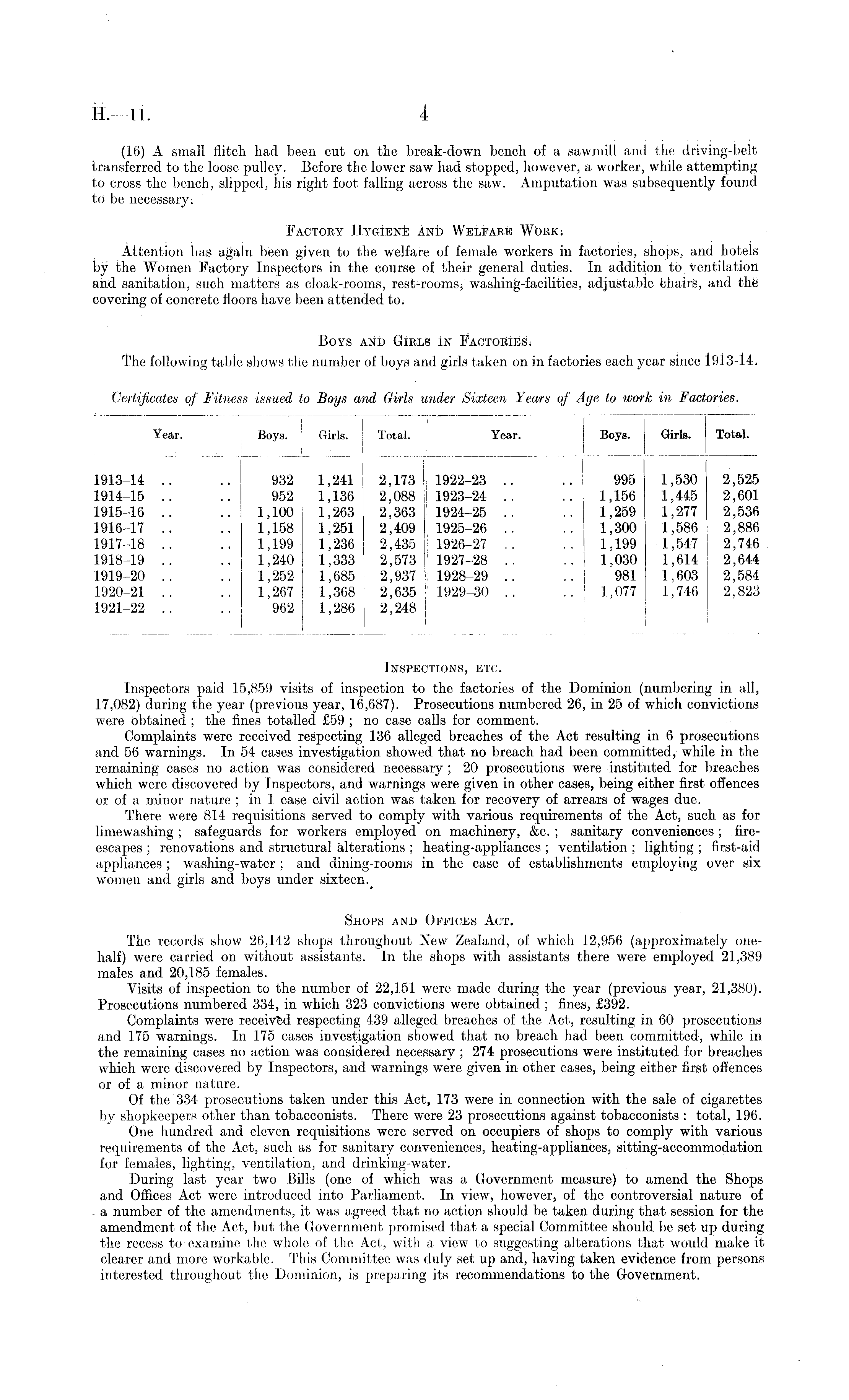 (16) A small Hitch had been cut on the break-down bench of a sawmill and the driving-belt transferred to the loose pulley. Before the lower saw had stopped, however, a worker, while attempting to cross the bench, slipped, bis right foot falling across the saw. Amputation was subsequently found to be necessary: Factory Hygiene And Welfare Work: Attention has again been given to the welfare of female workers in factories, shops, and hotels by the Women Factory Inspectors in the course of their general duties. In addition to. Ventilation and sanitation, such matters as cloak-rooms, rest-roomsj washing-facilities, adjustable fchairS, and the covering of concrete floors have been attended to: Boys and GiRLS iN Factorlesi The following table shows the number of boys and girls taken on in factories each year since 1913-14.
