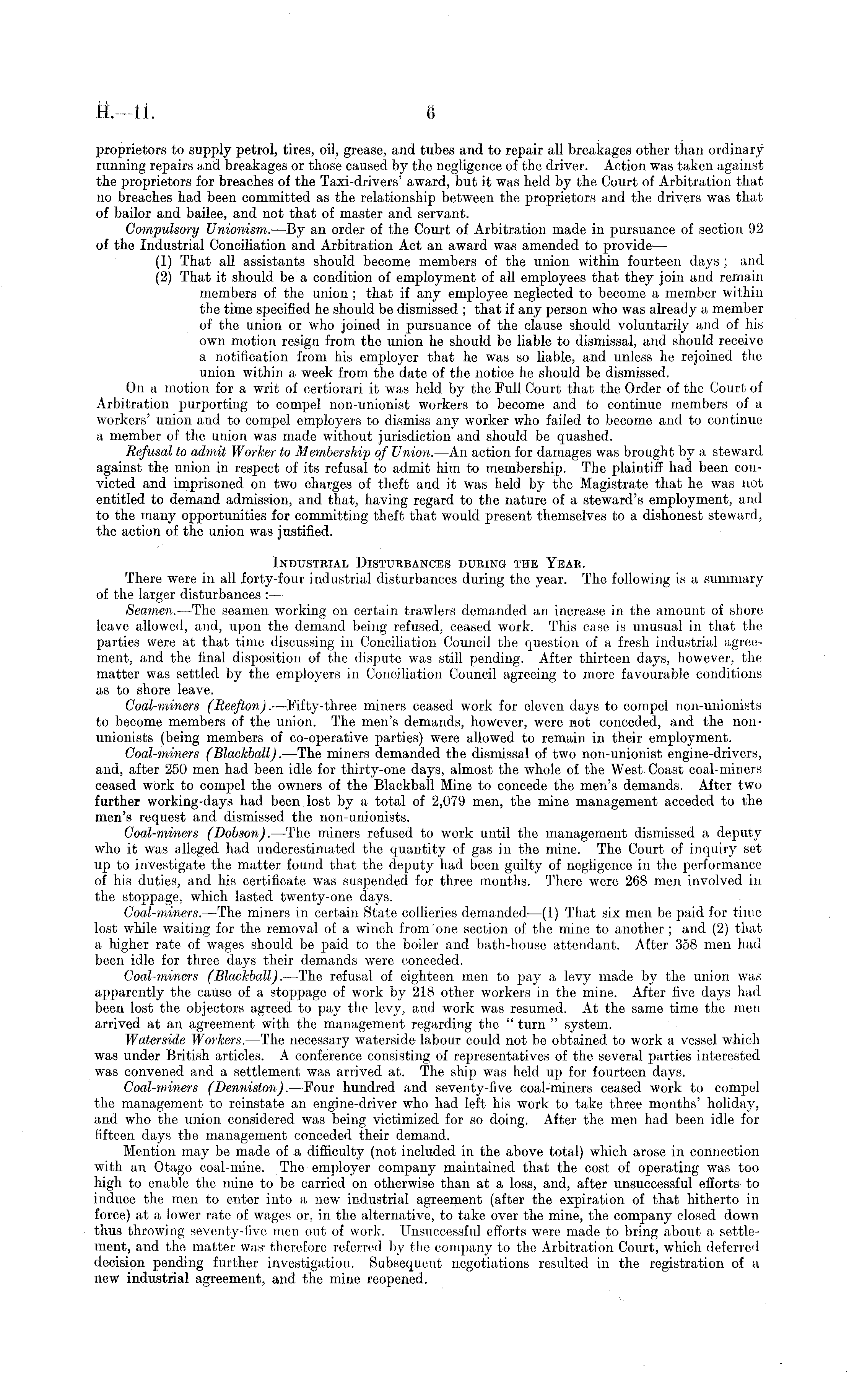 proprietors to supply petrol, tires, oil, grease, and tubes and to repair all breakages other than ordinary running repairs and breakages or those caused by the negligence of the driver. Action was taken against the proprietors for breaches of the Taxi-drivers' award, but it was held by the Court of Arbitration that no breaches had been committed as the relationship between the proprietors and the drivers was that of bailor and bailee, and not that of master and servant. Compulsory Unionism. —By an order of the Court of Arbitration made in pursuance of section 92 of the Industrial Conciliation and Arbitration Act an award was amended to provide— (1) That all assistants should become members of the union within fourteen days ; and (2) That it should be a condition of employment of all employees that they join and remain members of the union ; that if any employee neglected to become a member within the time specified he should be dismissed ; that if any person who was already a member of the union or who joined in pursuance of the clause should voluntarily and of his own motion resign from the union he should be liable to dismissal, and should receive a notification from his employer that he was so liable, and unless he rejoined the union within a week from the date of the notice he should be dismissed. On a motion for a writ of certiorari it was held by the Full Court that the Order of the Court of Arbitration purporting to compel non-unionist workers to become and to continue members of a workers' union and to compel employers to dismiss any worker who failed to become and to continue a member of the union was made without jurisdiction and should be quashed. Refusal to admit Worker to Membership of Union. —An action for damages was brought by a steward against the union in respect of its refusal to admit him to membership. The plaintiff had been convicted and imprisoned on two charges of theft and it was held by the Magistrate that he was not entitled to demand admission, and that, having regard to the nature of a steward's employment, and to the many opportunities' for committing theft that would present themselves to a dishonest steward, the action of the union was justified. Industrial Disturbances during the Year. There were in all forty-four industrial disturbances during the year. The following is a summary of the larger disturbances Seamen.—The seamen working on certain trawlers demanded an increase in the amount of shore leave allowed, and, upon the demand being refused, ceased work. This case is unusual in that the parties were at that time discussing in Conciliation Council the question of a fresh industrial agreement, and the final disposition of the dispute was still pending. After thirteen days, however, the matter was settled by the employers in Conciliation Council agreeing to more favourable conditions as to shore leave. Coal-miners (Reefton). —Fifty-three miners ceased work for eleven days to compel non-unionists to become members of the union. The men's demands, however, were not conceded, and the nonunionists (being members of co-operative parties) were allowed to remain in their employment. Coal-miners (Blackball). —The miners demanded the dismissal of two non-unionist engine-drivers, and, after 250 men had been idle for thirty-one days, almost the whole of the West Coast coal-miners ceased work to compel the owners of the Blackball Mine to concede the men's demands. After two further working-days had been lost by a total of 2,079 men, the mine management acceded to the men's request and dismissed the non-unionists. Coal-miners (Dobson). —The miners refused to work until the management dismissed a deputy who it was alleged had underestimated the quantity of gas in the mine. The Court of inquiry set up to investigate the matter found that the deputy had been guilty of negligence in the performance of his duties, and his certificate was suspended for three months. There were 268 men involved in the stoppage, which lasted twenty-one days. Coal-miners. —The miners in certain State collieries demanded —(1) That six men be paid for time lost while waiting for the removal of a winch from one section of the mine to another ; and (2) that a higher rate of wages should be paid to the boiler and bath-house attendant. After 358 men had been idle for three days their demands were conceded. Coal-miners (Blackball). —The refusal of eighteen men to pay a levy made by the union was apparently the cause of a stoppage of work by 218 other workers in the mine. After five days had been lost the objectors agreed to pay the levy, and. work was resumed. At the same time the men arrived at an agreement with the management regarding the " turn " system. Waterside Workers. —The necessary waterside labour could not be obtained to work a vessel which was under British articles. A conference consisting of representatives of the several parties interested was convened and a settlement was arrived at. The ship was held up for fourteen days. Coal-miners (Denniston): —Four hundred and seventy-five coal-miners ceased work to compel the management to reinstate an engine-driver who had left his work to take three months' holiday, and who the union considered was being victimized for so doing. After the men had been idle for fifteen days the management conceded their demand. Mention may be made of a difficulty (not included in the above total) which arose in connection with an Otago coal-mine. The employer company maintained that the cost of operating was too high to enable the mine to be carried on otherwise than at a loss, and, after unsuccessful efforts to induce the men to enter into a new industrial agreement (after the expiration of that hitherto in force) at a lower rate of wages or, in the alternative, to take over the mine, the company closed down thus throwing seventy-five men out of work. Unsuccessful efforts were made to bring about a settlement, and the matter was- th