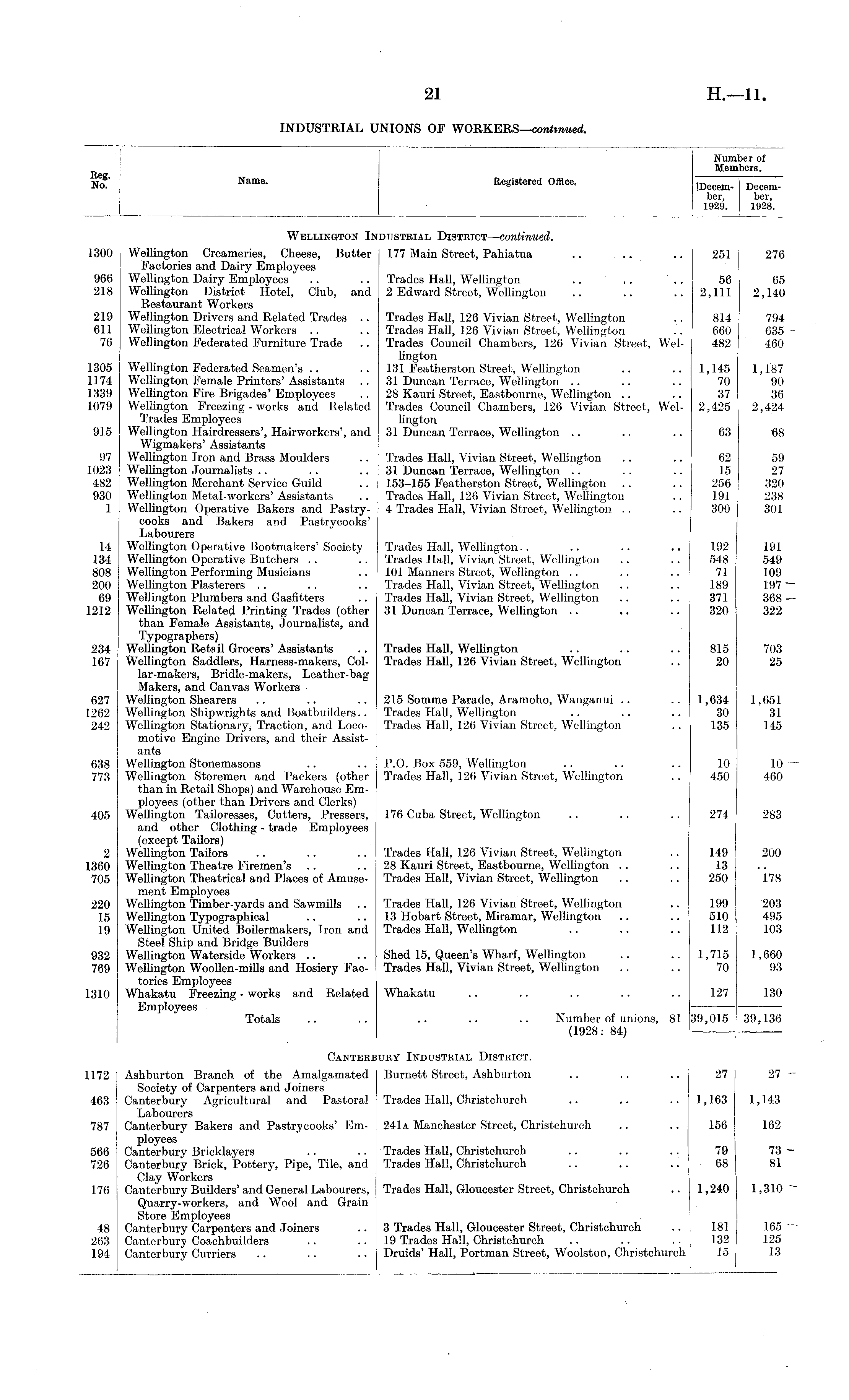Number of Members. jjgg _ Ho Name - Registered Offlee. !Decem . Decem . ber, ber, 1929. 1928. Wellington Industrial District—continued. 1300 Wellington Creameries, Cheese, Butter 177 Main Street, Pahiatua .. .. .. 251 276 Factories and Dairy Employees 966 Wellington Dairy Employees .. .. Trades Hall, Wellington .. .. .. 56 65 218 Wellington District Hotel, Club, and 2 Edward Street, Wellington .. .. .. 2,111 2,140 Restaurant Workers 219 Wellington Drivers and Related Trades .. Trades Hall, 126 Vivian Street, Wellington . . 814 794 611 Wellington Electrical Workers .. .. Trades Hall, 126 Vivian Street, Wellington .. 660 635 76 Wellington Federated Furniture Trade .. Trades Council Chambers, 126 Vivian Street, Wei- 482 460 lington 1305 Wellington Federated Seamen's .. .. 131 Featherston Street, Wellington .. .. 1,145 1,187 1174 Wellington Female Printers'Assistants .. 31 Duncan Terrace, Wellington .. .. .. 70 90 1339 Wellington Fire Brigades'Employees .. 28 Kauri Street, Eastbourne, Wellington .. .. 37 36 1079 Wellington Freezing - works anil Related Trades Council Chambers, 126 Vivian Stteet, Wei- 2,425 2,424 Trades Employees lington 915 Wellington Hairdressers', Hairworkers', and 31 Duncan Terrace, Wellington .. .. .. 63 68 Wigmakers' Assistants 97 Wellington Iron and Brass Moulders .. Trades Hall, Vivian Street, Wellington .. .. 62 59 1023 Wellington Journalists .. .. 31 Duncan Terrace, Wellington .. .. .. 15 27 482 Wellington Merchant Service Guild .. 153-155 Featherston Street, Wellington .. .. 256 320 930 Wellington Metal-workers' Assistants .. Trades Hall, 126 Vivian Street, Wellington .. 191 238 1 Wellington Operative Bakers and Pastry- 4 Trades Hall, Vivian Street, Wellington .. .. 300 301 cooks and Bakers and Pastrycooks' Labourers 14 Wellington Operative Bootmakers'Society Trades Hall, Wellington.. .. .. .. 192 191 134 Wellington Operative Butchers .. .. Trades Hall, Vivian Street, Wellington .. .. 548 549 808 Wellington Performing Musicians .. 101 Manners Street, Wellington .. .. .. 71 109 200 Wellington Plasterers .. .. .. Trades Hall, Vivian Street, Wellington .. .. 189 197 69 Wellington Plumbers and Gasfitters .. Trades Hall, Vivian Street, Wellington .. .. 371 368 ■ 1212 Wellington Related Printing Trades (other 31 Duncan Terrace, Wellington .. .. .. 320 322 than Female Assistants, Journalists, and Typographers) 234 Wellington Retail Grocers' Assistants .. Trades Hall, Wellington .. .. .. 815 703 167 Wellington Saddlers, Harness-makers, Col- Trades Hall, 126 Vivian Street, Wellington .. 20 25 lar-makers, Bridle-makers, Leather-bag Makers, and Canvas Workers 627 Wellington Shearers .. .. .. 215 Somme Parade, Aramoho, Wanganui .. .. 1,634 1,651 1262 Wellington Shipwrights and Boatbuilders.. Trades Hall, Wellington .. .. .. 30 31 242 Wellington Stationary, Traction, and Loco- Trades Hall, 126 Vivian Street, Wellington .. 135 145 motive Engine Drivers, and their Assistants 638 Wellington Stonemasons .. .. P.O. Box 559, Wellington . . .. .. 10 10 773 Wellington Storemen and Packers (other Trades Hall, 126 Vivian Street, Wellington .. 450 460 than in Retail Shops) and Warehouse Employees (other than Drivers and Clerks) 405 Wellington Tailoresses, Cutters, Pressers, 176 Cuba Street, Wellington .. .. .. 274 283 and other Clothing - trade Employees (except Tailors) 2 Wellington Tailors .. .. . . Trades Hall, 126 Vivian Street, Wellington .. 149 200 1360 Wellington Theatre Firemen's .. 28 Kauri Street, Eastbourne, Wellington . . .. 13 705 Wellington Theatrical and Places of Amuse- Trades Hall, Vivian Street, Wellington .. .. 250 178 ment Employees 220 Wellington Timber-yards and Sawmills .. Trades Hall, 126 Vivian Street, Wellington .. 199 '203 15 Wellington Typographical .. 13 Hobart Street, Miramar, Wellington .. .. 510 495 19 Wellington United Boilermakers, Iron and Trades Hall, Wellington .. . . .. 112 103 Steel Ship and Bridge Builders 932 Wellington Waterside Workers .. .. Shed 15, Queen's Wharf, Wellington .. .. 1,715 1,660 769 Wellington Woollen-mills and Hosiery Fac- Trades Hall, Vivian Street, Wellington .. .. 70 93 tories Employees 1310 Whakatu Freezing - works and Related Whakatu .. .. .. .. .. 127 130 Employees Totals .. .. .. .. .. Number of unions, 81 39,015 39,136 (1928: 84) Canterbury Industrial District. 1172 Ashburton Branch of the Amalgamated Burnett Street, Ashburton .. .. .. 27 27 Society of Carpenters and Joiners 463 Canterbury Agricultural and Pastoral Trades Hall, Christchurch .. .. .. 1,163 1,143 Labourers 787 Canterbury Bakers and Pastrycooks' Em- 241a Manchester Street, Christchurch .. .. 156 162 ployees 566 Canterbury Bricklayers .. .. Trades Hall, Christchurch .. .. .. 79 73 726 Canterbury Brick, Pottery, Pipe, Tile, and Trades Hall, Christchurch .. .. .. 68 81 Clay Workers 176 Canterbury Builders'and General Labourers, Trades Hall, Gloucester Street, Christchurch .. 1,240 1,310 Quarry-workers, and Wool and Grain Store Employees 48 Canterbury Carpenters and Joiners .. 3 Trades Hall, Gloucester Street, Christchurch .. 181 165 263 Canterbury Coachbuilders .. .. 19 Trades Hall, Christchurch .. .. .. 132 125 194 Canterbury Curriers .. .. .. Druids' Hall, Portman Street, Woolston, Christchurch 15 13
