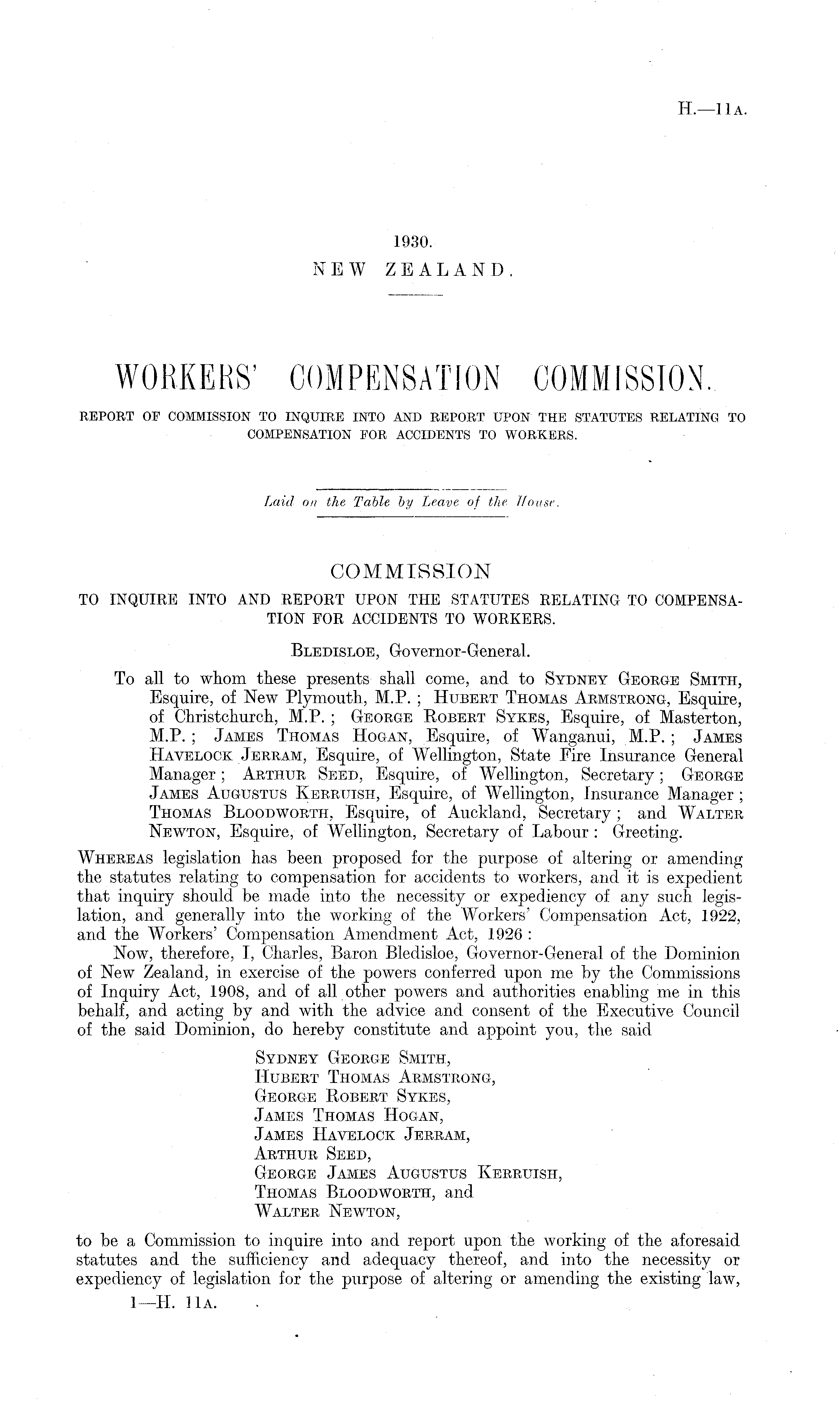 COMMISSION TO INQUIRE INTO AND REPORT UPON THE STATUTES RELATING TO COMPENSATION FOR ACCIDENTS TO WORKERS. Bledisloe, Governor-General. To all to whom these presents shall come, and to Sydney George Smith, Esquire, of New Plymouth, M.P. ; Hubert Thomas Armstrong, Esquire, of Christchurch, M.P. ; George Robert Sykes, Esquire, of Masterton, M.P. ; James Thomas llogan, Esquire, of Wanganui, M.P. ; James Havelock Jerram, Esquire, of Wellington, State Fire Insurance General Manager; Arthur Seed, Esquire, of Wellington, Secretary; George James Augustus Kerruish, Esquire, of Wellington, Insurance Manager ; Thomas Bloodworth, Esquire, of Auckland, Secretary; and Walter Newton, Esquire, of Wellington, Secretary of Labour : Greeting. Whereas legislation has been proposed for the purpose of altering or amending the statutes relating to compensation for accidents to workers, and it is expedient that inquiry should be made into the necessity or expediency of any such legislation, and generally into the working of the Workers' Compensation Act, 1922, and the Workers' Compensation Amendment Act, 1926 : Now, therefore, I, Charles, Baron Bledisloe, Governor-General of the Dominion of New Zealand, in exercise of the powers conferred upon me by the Commissions of Inquiry Act, 1908, and of all other powers and authorities enabling me in this behalf, and acting by and with the advice and consent of the Executive Council of the said Dominion, do hereby constitute and appoint you, the said Sydney George Smith, Hubert Thomas Armstrong, George Robert Sykes, James Thomas llogan, James Havelock Jerram, Arthur Seed, George James Augustus Kerruish, Thomas Bloodworth, and Walter Newton, to be a Commission to inquire into and report upon the working of the aforesaid statutes and the sufficiency and adequacy thereof, and into the necessity or expediency of legislation for the purpose of altering or amending the existing law,
