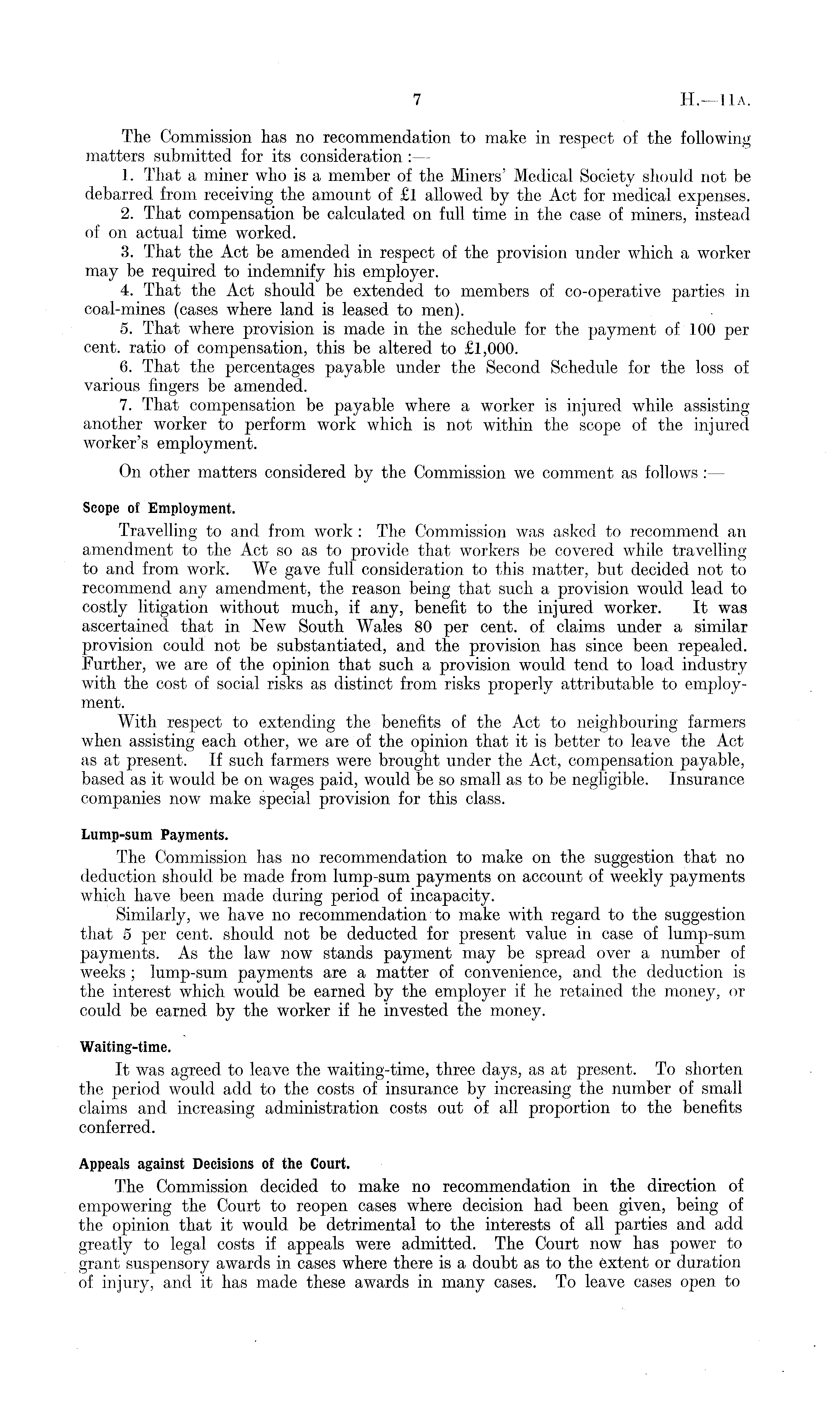 The Commission has no recommendation to make in respect of the following matters submitted for its consideration : — 1. That a miner who is a member of the Miners' Medical Society should not be debarred from receiving the amount of £l allowed by the Act for medical expenses. 2. That compensation be calculated on full time in the case of miners, instead of on actual time worked. 3. That the Act be amended in respect of the provision under which a worker may be required to indemnify his employer. 4. That the Act should be extended to members of co-operative parties in coal-mines (cases where land is leased to men). 5. That where provision is made in the schedule for the payment of 100 per cent, ratio of compensation, this be altered to £1,000. 6. That the percentages payable under the Second Schedule for the loss of various fingers be amended. 7. That compensation be payable where a worker is injured while assisting another worker to perform work which is not within the scope of the injured worker's employment. On other matters considered by the Commission we comment as follows :— Scope of Employment. Travelling to and from work : The Commission was asked to recommend an amendment to the Act so as to provide that workers be covered while travelling to and from work. We gave full consideration to this matter, but decided not to recommend any amendment, the reason being that such a provision would lead to costly litigation without much, if any, benefit to the injured worker. It was ascertained that in New South Wales 80 per cent, of claims under a similar provision could not be substantiated, and the provision has since been repealed. Further, we are of the opinion that such a provision would tend to load industry with the cost of social risks as distinct from risks properly attributable to employment. With respect to extending the benefits of the Act to neighbouring farmers when assisting each other, we are of the opinion that it is better to leave the Act as at present. If such farmers were brought under the Act, compensation payable, based as it would be on wages |)aid, would be so small as to be negligible. Insurance companies now make special provision for this class. Lump-sum Payments. The Commission has no recommendation to make on the suggestion that no deduction should be made from lump-sum payments on account of weekly payments which have been made during period of incapacity. Similarly, we have no recommendation to make with regard to the suggestion that 5 per cent, should not be deducted for present value in case of lump-sum payments. As the law now stands payment may be spread over a number of weeks ; lump-sum payments are a matter of convenience, and the deduction is the interest which would be earned by the employer if he retained the money, or could be earned by the worker if he invested the money. Waiting-time. It was agreed to leave the waiting-time, three days, as at present. To shorten the period would add to the costs of insurance by increasing the number of small claims and increasing administration costs out of all proportion to the benefits conferred. Appeals against Decisions of the Court. The Commission decided to make no recommendation in the direction of empowering the Court to reopen cases where decision had been given, being of the opinion that it would be detrimental to the interests of all parties and add greatly to legal costs if appeals were admitted. The Court now has power to grant suspensory awards in cases where there is a doubt as to the extent or duration of injury, and it has made these awards in many cases. To leave cases open to