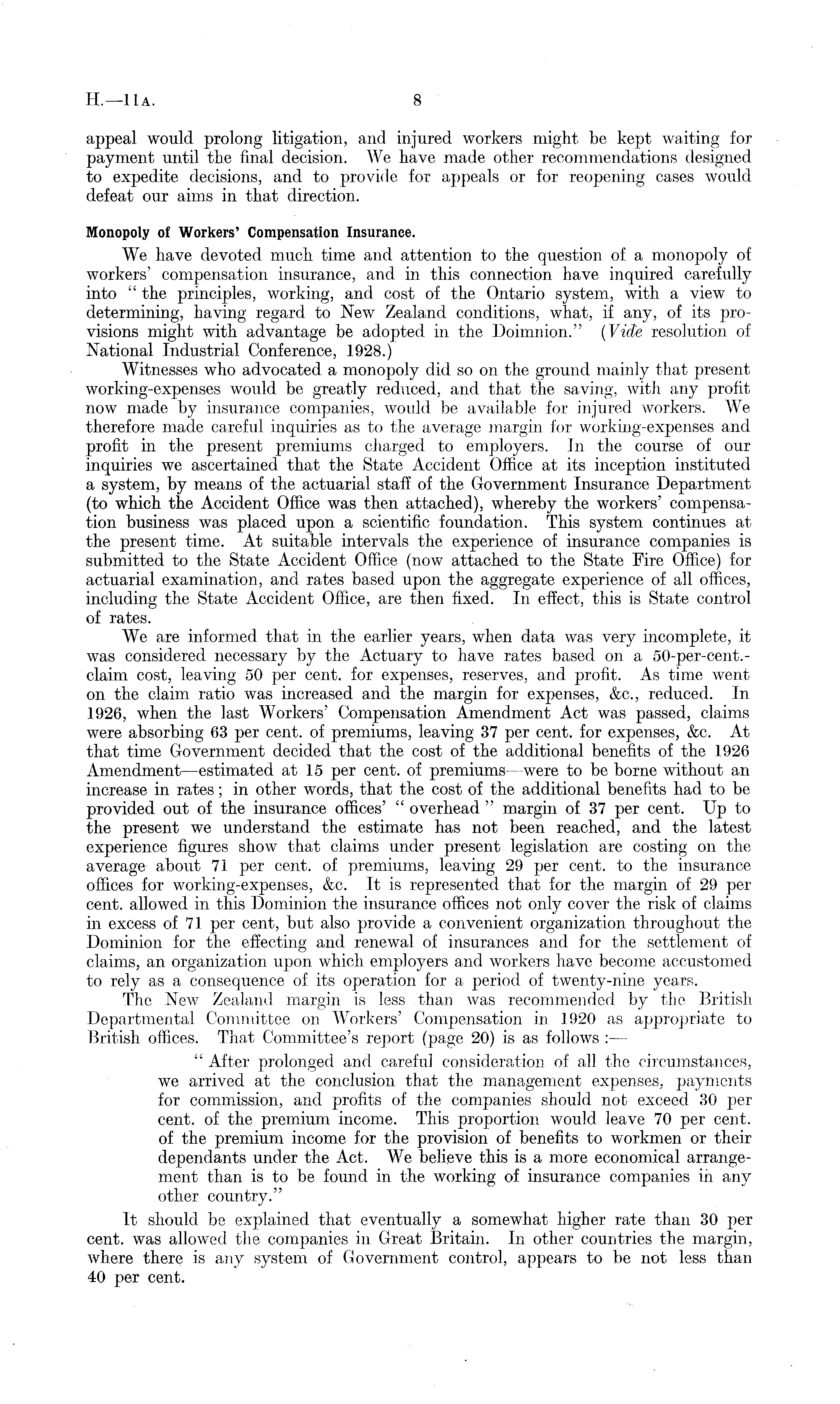 appeal would prolong litigation, and injured workers might be kept waiting for payment until the final decision. We have made other recommendations designed to expedite decisions, and to provide for appeals or for reopening cases would defeat our aims in that direction. Monopoly of Workers' Compensation Insurance. We have devoted much time and attention to the question of a monopoly of workers' compensation insurance, and in this connection have inquired carefully into " the principles, working, and cost of the Ontario system, with a view to determining, having regard to New Zealand conditions, what, if any, of its provisions might with advantage be adopted in the Dominion." (Vide resolution of National Industrial Conference, 1928.) Witnesses who advocated a monopoly did so on the ground mainly that present working-expenses would be greatly reduced, and that the saving, with any profit now made by insurance companies, would be available for injured workers. We therefore made careful inquiries as to the average margin for working-expenses and profit in the present premiums charged to employers. In the course of our inquiries we ascertained that the State Accident Office at its inception instituted a system, by means of the actuarial staff of the Government Insurance Department (to which the Accident Office was then attached), whereby the workers' compensation business was placed upon a scientific foundation. This system continues at the present time. At suitable intervals the experience of insurance companies is submitted to the State Accident Office (now attached to the State Fire Office) for actuarial examination, and rates based upon the aggregate experience of all offices, including the State Accident Office, are then fixed. In effect, this is State control of rates. We are informed that in the earlier years, when data was very incomplete, it was considered necessary by the Actuary to have rates based on a 50-per-cent.-claim cost, leaving 50 per cent, for expenses, reserves, and profit. As time went on the claim ratio was increased and the margin for expenses, &c., reduced. In 1926, when the last Workers' Compensation Amendment Act was passed, claims were absorbing 63 per cent, of premiums, leaving 37 per cent, for expenses, &c. At that time Government decided that the cost of the additional benefits of the 1926 Amendment —estimated at 15 per cent, of premiums—were to be borne without an increase in rates; in other words, that the cost of the additional benefits had to be provided out of the insurance offices' " overhead " margin of 37 per cent. Up to the present we understand the estimate has not been reached, and the latest experience figures show that claims under present legislation are costing on the average about 71 per cent, of premiums, leaving 29 per cent, to the insurance offices for working-expenses, &c. It is represented that for the margin of 29 per cent, allowed in this Dominion the insurance offices not only cover the risk of claims in excess of 71 per cent, but also provide a convenient organization throughout the Dominion for the effecting and renewal of insurances and for the settlement of claims, an organization upon which employers and workers have become accustomed to rely as a consequence of its operation for a period of twenty-nine years. The New Zealand margin is less than was recommended by the British Departmental Committee on Workers' Compensation in 1920 as appropriate to British offices. That Committee's report (page 20) is as follows : — " After prolonged and careful consideration of all the circumstances, we arrived at the conclusion that the management expenses, payments for commission, and profits of the companies should not exceed 30 per cent, of the premium income. This proportion would leave 70 per cent, of the premium income for the provision of benefits to workmen or their dependants under the Act. We believe this is a more economical arrangement than is to be found in the working of insurance companies in any other country." It should be explained that eventually a somewhat higher rate than 30 per cent, was allowed the companies in Great Britain. In other countries the margin, where there is any system of Government control, appears to be not less than 40 per cent.