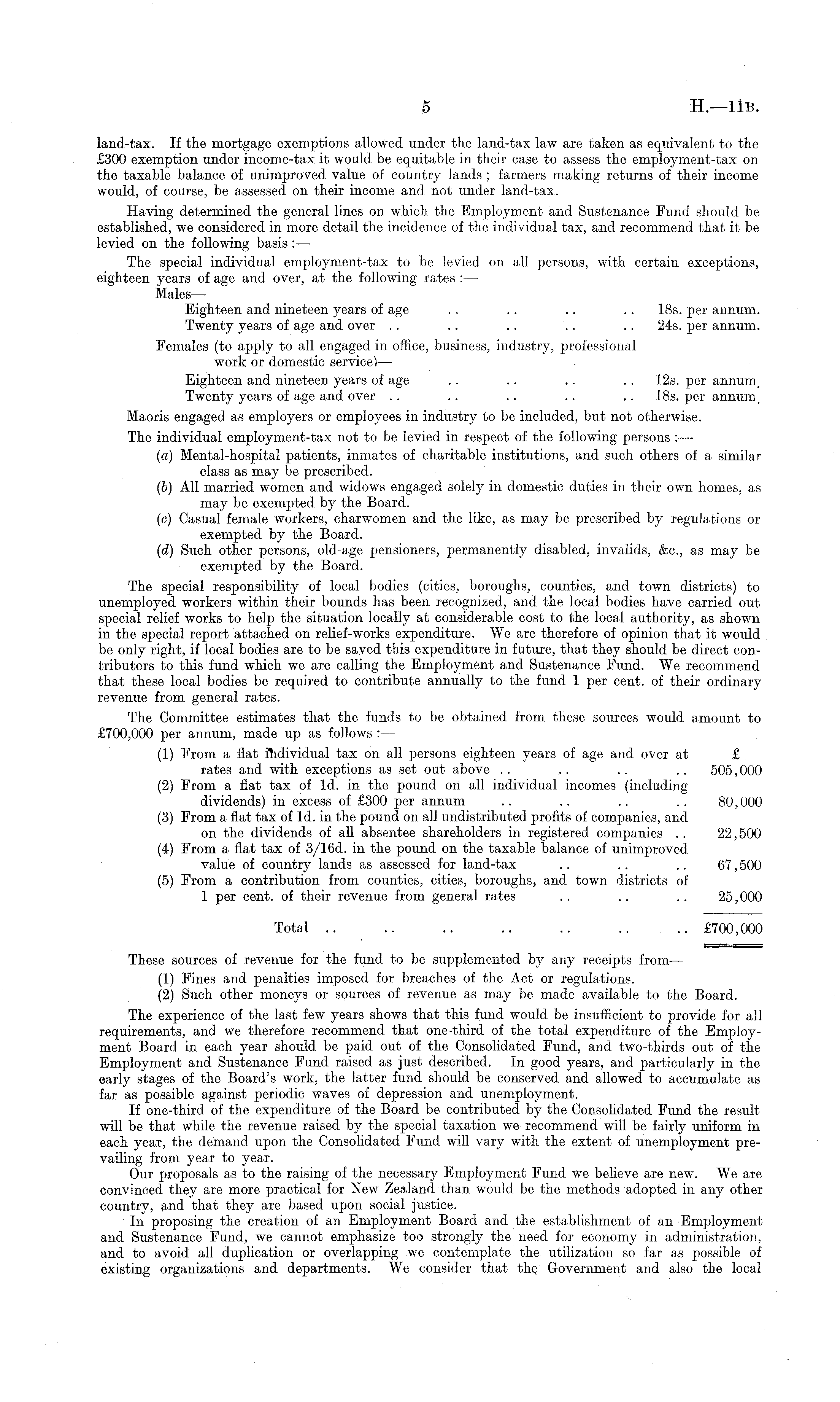 land-tax. If the mortgage exemptions allowed under the land-tax law are taken as equivalent to the £300 exemption under income-tax it would be equitable in their ease to assess the employment-tax on the taxable balance of unimproved value of country lands ; farmers making returns of their income would, of course, be assessed on their income and not under land-tax. Having determined the general lines on which the Employment and Sustenance Fund should be established, we considered in more detail the incidence of the individual tax, and recommend that it be levied on the following basis : — The special individual employment-tax to be levied on all persons, with certain exceptions, eighteen years of age and over, at the following rates : — Males — Eighteen and nineteen years of age . . .. .. .. 18s. per annum. Twenty years of age and over . . .. . . .. .. 245. per annum. Females (to apply to all engaged in office, business, industry, professional work or domestic service) — Eighteen and nineteen years of age .. .. .. 12s. per annum. Twenty years of age and over .. .. .. .. 18s. per annum. Maoris engaged as employers or employees in industry to be included, but not otherwise. The individual employment-tax not to be levied in respect of the following persons : — (a) Mental-hospital patients, inmates of charitable institutions, and such others of a similar class as may be prescribed. (b) All married women and widows engaged solely in domestic duties in their own homes, as may be exempted by the Board. (c) Casual female workers, charwomen and the like, as may be prescribed by regulations or exempted by the Board. (d) Such other persons, old-age pensioners, permanently disabled, invalids, &c., as may be exempted by the Board. The special responsibility of local bodies (cities, boroughs, counties, and town districts) to unemployed workers within their bounds has been recognized, and the local bodies have carried out special relief works to help the situation locally at considerable cost to the local authority, as shown in the special report attached on relief-works expenditure. We are therefore of opinion that it would be only right, if local bodies are to be saved this expenditure in future, that they should be direct contributors to this fund which we are calling the Employment and Sustenance Fund. We recommend that these local bodies be required to contribute annually to the fund 1 per cent, of their ordinary revenue from general rates. The Committee estimates that the funds to be obtained from these sources would amount to £700,000 per annum, made up as follows : — (1) From a flat individual tax on all persons eighteen years of age and over at £ rates and with exceptions as set out above .. . . .. .. 505,000 (2) From a flat tax of Id. in the pound on all individual incomes (including dividends) in excess of £300 per annum .. .. .. .. 80,000 (3) From a flat tax of Id. in the pound on all undistributed profits of companies, and on the dividends of all absentee shareholders in registered companies .. 22,500 (4) From a flat tax of 3/16 d. in the pound on the taxable balance of unimproved value of country lands as assessed for land-tax .. .. .. 67,500 (5) From a contribution from counties, cities, boroughs, and town districts of 1 per cent, of their revenue from general rates .. .. .. 25,000 Total .. .. .. .. .. .. .. £700,000 These sources of revenue for the fund to be supplemented by any receipts from— (1) Fines and penalties imposed for breaches of the Act or regulations. (2) Such other moneys or sources of revenue as may be made available to the Board. The experience of the last few years shows that this fund would be insufficient to provide for all requirements, and we therefore recommend that one-third of the total expenditure of the Employment Board in each year should be paid out of the Consolidated Fund, and two-thirds out of the Employment and Sustenance Fund raised as just described. In good years, and particularly in the early stages of the Board's work, the latter fund should be conserved and allowed to accumulate as far as possible against periodic waves of depression and unemployment. If one-third of the expenditure of the Board be contributed by the Consolidated Fund the result will be that while the revenue raised by the special taxation we recommend will be fairly uniform in each year, the demand upon the Consolidated Fund will vary with the extent of unemployment prevailing from year to year. Our proposals as to the raising of the necessary Employment Fund we believe are new. We are convinced they are more practical for New Zealand than would be the methods adopted in any other country, and that they are based upon social justice. In proposing the creation of an Employment Board and the establishment of an Employment and Sustenance Fund, we cannot emphasize too strongly the need for economy in administration, and to avoid all duplication or overlapping we contemplate the utilization so far as possible of existing organizations and departments. We consider that the Government and also the local