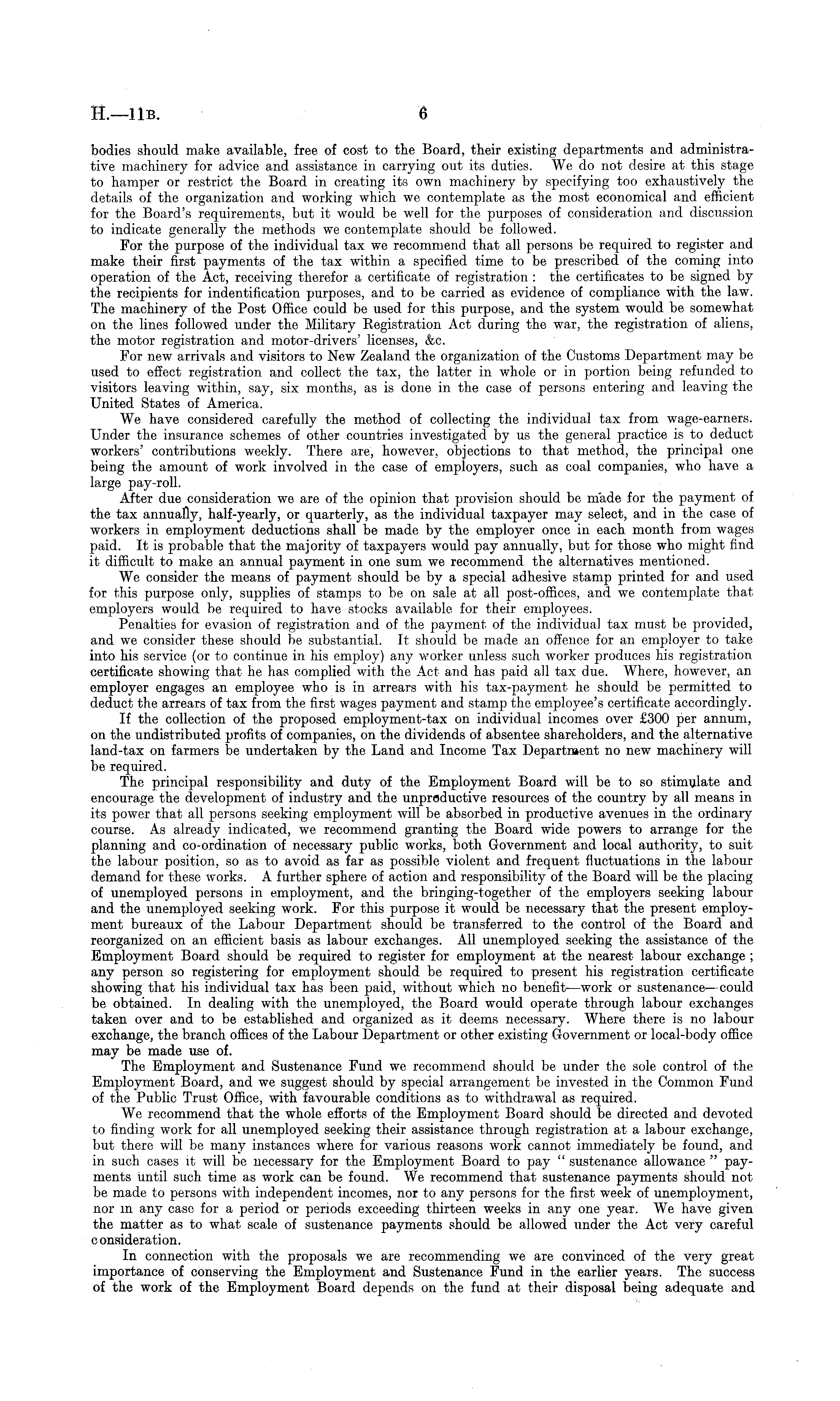 bodies should make available, free of cost to the Board, their existing departments and administrative machinery for advice and assistance in carrying out its duties. We do not desire at this stage to hamper or restrict the Board in creating its own machinery by specifying too exhaustively the details of the organization and working which we contemplate as the most economical and efficient for the Board's requirements, but it would be well for the purposes of consideration and discussion to indicate generally the methods we contemplate should be followed. For the purpose of the individual tax we recommend that all persons be required to register and make their first payments of the tax within a specified time to be prescribed of the coming into operation of the Act, receiving therefor a certificate of registration : the certificates to be signed by the recipients for indentification purposes, and to be carried as evidence of compliance with the law. The machinery of the Post Office could be used for this purpose, and the system would be somewhat on the lines followed under the Military Begistration Act during the war, the registration of aliens, the motor registration and motor-drivers' licenses, &c. For new arrivals and visitors to New Zealand the organization of the Customs Department may be used to effect registration and collect the tax, the latter in whole or in portion being refunded to visitors leaving within, say, six months, as is done in the case of persons entering and leaving the United States of America. We have considered carefully the method of collecting the individual tax from wage-earners. Under the insurance schemes of other countries investigated by us the general practice is to deduct workers' contributions weekly. There are, however, objections to that method, the principal one being the amount of work involved in the case of employers, such as coal companies, who have a large pay-roll. After due consideration we are of the opinion that provision should be made for the payment of the tax annually, half-yearly, or quarterly, as the individual taxpayer may select, and in the case of workers in employment deductions shall be made by the employer once in each month from wages paid. It is probable that the majority of taxpayers would pay annually, but for those who might find it difficult to make an annual payment in one sum we recommend the alternatives mentioned. We consider the means of payment should be by a special adhesive stamp printed for and used for this purpose only, supplies of stamps to be on sale at all post-offices, and we contemplate that employers would be required to have stocks available for their employees. Penalties for evasion of registration and of the payment of the individual tax must be provided, and we consider these should be substantial. It should be made an offence for an employer to take into his service (or to continue in his employ) any worker unless such worker produces his registration certificate showing that he has complied with the Act and has paid all tax due. Where, however, an employer engages an employee who is in arrears with his tax-payment he should be permitted to deduct the arrears of tax from the first wages payment and stamp the employee's certificate accordingly. If the collection of the proposed employment-tax on individual incomes over £300 per annum, on the undistributed profits of companies, on the dividends of absentee shareholders, and the alternative land-tax on farmers be undertaken by the Land and Income Tax Department no new machinery will be required. The principal responsibility and duty of the Employment Board will be to so stimulate and encourage the development of industry and the unproductive resources of the country by all means in its power that all persons seeking employment will be absorbed in productive avenues in the ordinary course. As already indicated, we recommend granting the Board wide powers to arrange for the planning and co-ordination of necessary public works, both Government and local authority, to suit the labour position, so as to avoid as far as possible violent and frequent fluctuations in the labour demand for these works. A further sphere of action and responsibility of the Board will be the placing of unemployed persons in employment, and the bringing-together of the employers seeking labour and the unemployed seeking work. For this purpose it would be necessary that the present employment bureaux of the Labour Department should be transferred to the control of the Board and reorganized on an efficient basis as labour exchanges. All unemployed seeking the assistance of the Employment Board should be required to register for employment at the nearest labour exchange ; any person so registering for employment should be required to present his registration certificate showing that his individual tax has been paid, without which no benefit —work or sustenance—could be obtained. In dealing with the unemployed, the Board would operate through labour exchanges taken over and to be established and organized as it deems necessary. Where there is no labour exchange, the branch offices of the Labour Department or other existing Government or local-body office may be made use of. The Employment and Sustenance Fund we recommend should be under the sole control of the Enrployment Board, and we suggest should by special arrangement be invested in the Common Fund of the Public Trust Office, with favourable conditions as to withdrawal as required. We recommend that the whole efforts of the Employment Board should be directed and devoted to finding work for all unemployed seeking their assistance through registration at a labour exchange, but there will be many instances where for various reasons work cannot immediately be found, and in such cases it will be necessary for the Employment Board to pay " sustenance allowance " payments until such time as work can be found. We recommend that sustena