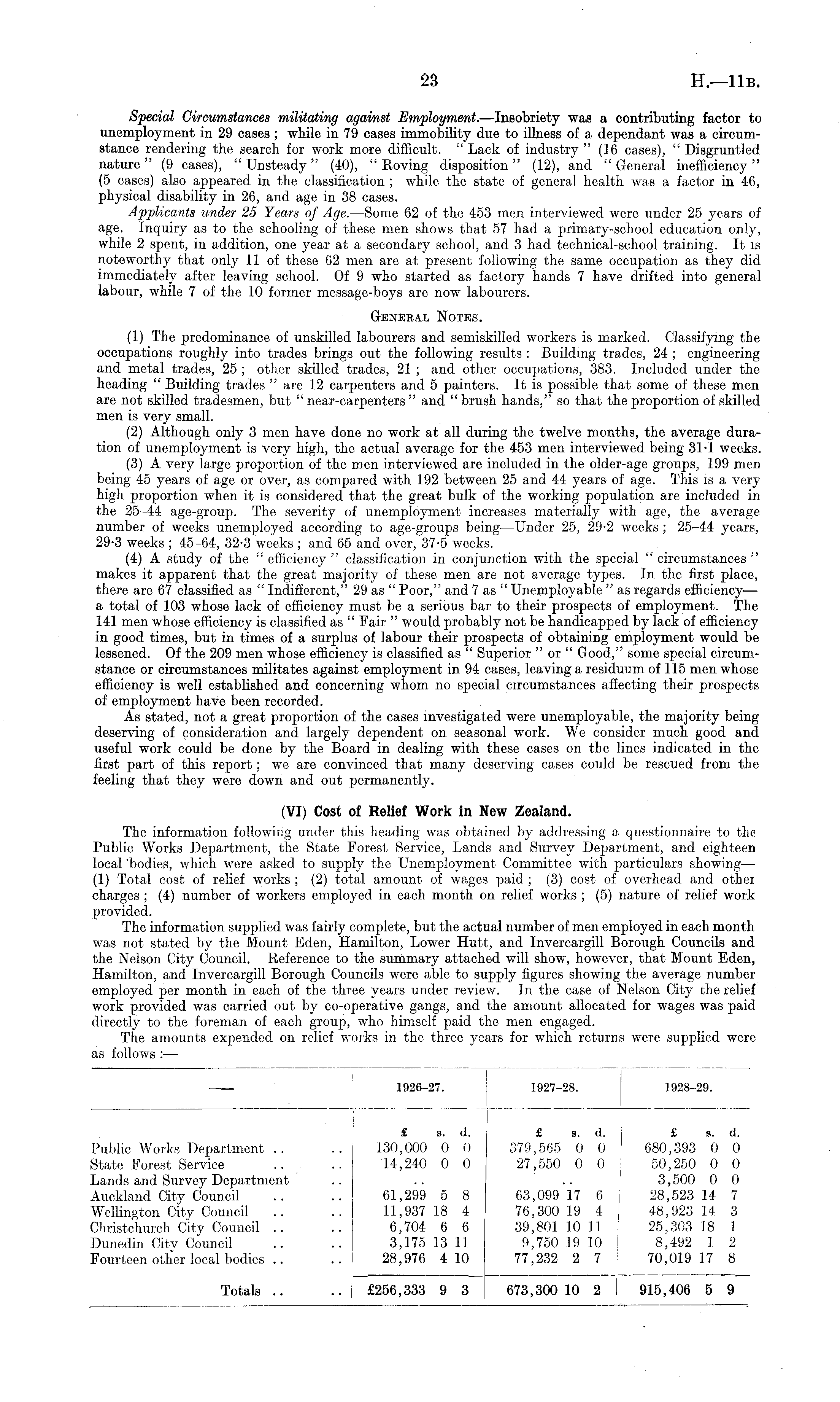 Special Circumstances militating against Employment.—lnsobriety was a contributing factor to unemployment in 29 cases ; while in 79 cases immobility due to illness of a dependant was a circumstance rendering the search for work more difficult. " Lack of industry " (16 cases), " Disgruntled nature "(9 cases), " Unsteady" (40), " Roving disposition " (12), and " General inefficiency " (5 cases) also appeared in the classification ; while the state of general health was a factor in 46, physical disability in 26, and age in 38 cases. Applicants under 25 Years of Age. —Some 62 of the 453 men interviewed were under 25 years of age. Inquiry as to the schooling of these men shows that 57 had a primary-school education only, while 2 spent, in addition, one year at a secondary school, and 3 had technical-school training. It is noteworthy that only II of these 62 men are at present following the same occupation as they did immediately after leaving school. Of 9 who started as factory hands 7 have drifted into general labour, while 7 of the 10 former message-boys are now labourers. General Notes. (1) The predominance of unskilled labourers and semiskilled workers is marked. Classifying the occupations roughly into trades brings out the following results : Building trades, 24 ; engineering and metal trades, 25 ; other skilled trades, 21 ; and other occupations, 383. Included under the heading " Building trades " are 12 carpenters and 5 painters. It is possible that some of these men are not skilled tradesmen, but " near-carpenters " and " brush hands," so that the proportion of skilled men is very small. (2) Although only 3 men have done no work at all during the twelve months, the average duration of unemployment is very high, the actual average for the 453 men interviewed being 31-1 weeks. (3) A very large proportion of the men interviewed are included in the older-age groups, 199 men being 45 years of age or over, as compared with 192 between 25 and 44 years of age. This is a very high proportion when it is considered that the great bulk of the working population are included in the 25-44 age-group. The severity of unemployment increases materially with age, the average number of weeks unemployed according to age-groups being—Under 25, 29-2 weeks ; 25-44 years, 29-3 weeks ; 45-64, 32-3 weeks ; and 65 and over, 37-5 weeks. (4) A study of the " efficiency " classification in conjunction with the special " circumstances " makes it apparent that the great majority of these men are not average types. In the first place, there are 67 classified as " Indifferent," 29 as " Poor," and 7 as " Unemployable " as regards efficiency— a total of 103 whose lack of efficiency must be a serious bar to their prospects of employment. The 141 men whose efficiency is classified as " Fair " would probably not be handicapped by lack of efficiency in good times, but in times of a surplus of labour their prospects of obtaining employment would be lessened. Of the 209 men whose efficiency is classified as " Superior "or " Good," some special circumstance or circumstances militates against employment in 94 cases, leaving a residuum of 115 men whose efficiency is well established and concerning whom no special circumstances affecting their prospects of employment have been recorded. As stated, not a great proportion of the cases investigated were unemployable, the majority being deserving of consideration and largely dependent on seasonal work. We consider much good and useful work could be done by the Board in dealing with these cases on the lines indicated in the first part of this report; we are convinced that many deserving cases could be rescued from the feeling that they were down and out permanently. (VI) Cost of Relief Work in New Zealand. The information following under this heading was obtained by addressing a questionnaire to the Public Works Department, the State Forest Service, Lands and Survey Department, and eighteen local 'bodies, which were asked to supply the Unemployment Committee with particulars showing'— (1) Total cost of relief works ; (2) total amount of wages paid ; (3) cost of overhead and other charges ; (4) number of workers employed in each month on relief works ; (5) nature of relief work provided. The information supplied was fairly complete, but the actual number of men employed in each month was not stated by the Mount Fden, Hamilton, Lower Hutt, and Invercargill Borough Councils and the Nelson City Council. Reference to the summary attached will show, however, that Mount Eden, Hamilton, and Invercargill Borough Councils were able to supply figures showing the average number employed per month in each of the three years under review. In the case of Nelson City the relief work provided was carried out by co-operative gangs, and the amount allocated for wages was paid directly to the foreman of each group, who himself paid the men engaged. The amounts expended on relief works in the three years for which returns were supplied were as follows :—