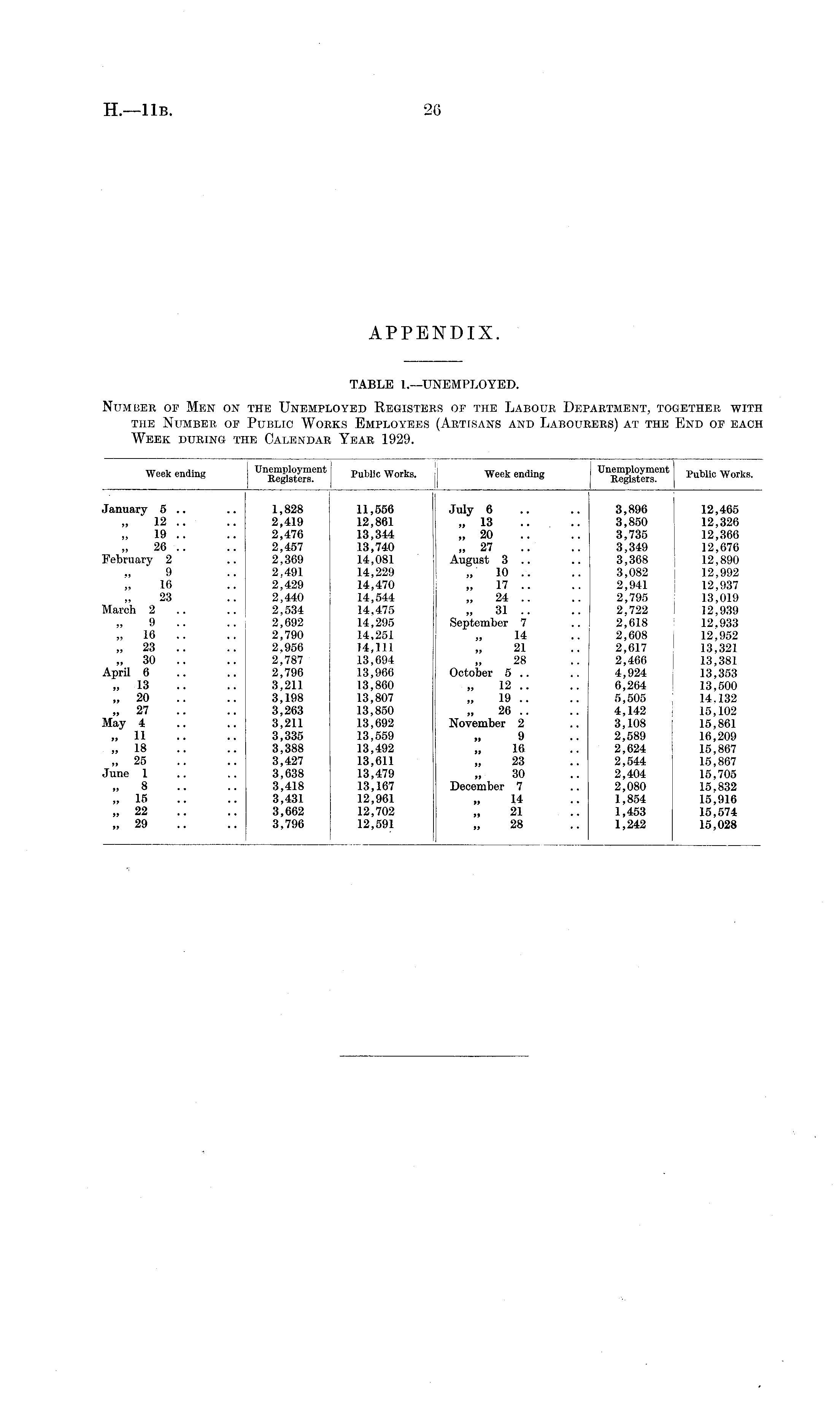 TABLE 1.—UNEMPLOYED. Number of Men on the Unemployed Registers of the Labour Department, together with the Number of Public Works Employees (Artisans and Labourers) at the End of each Week during the Calendar Year 1929.