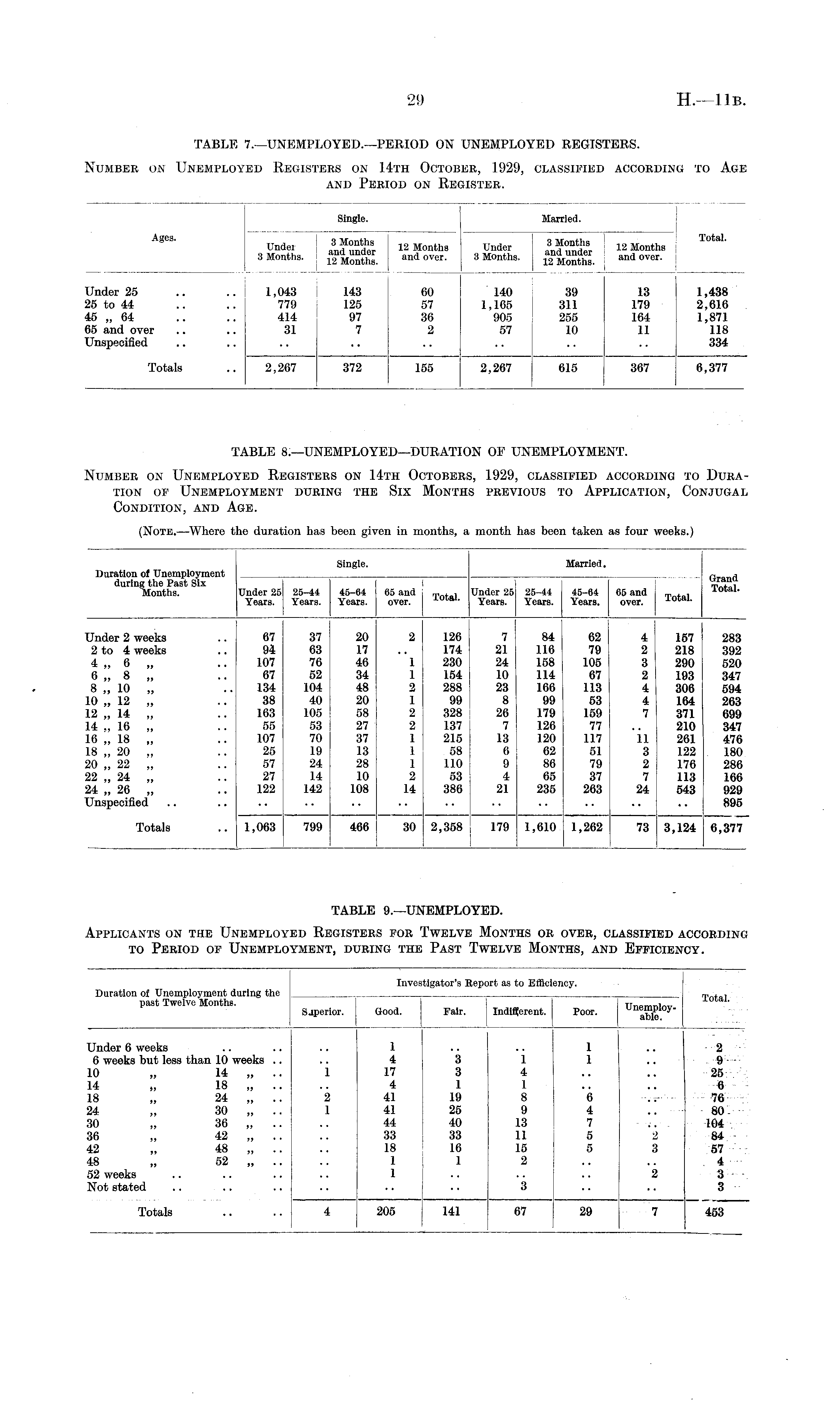 TABLE 7.—UNEMPLOYED.—PERIOD ON UNEMPLOYED REGISTERS. Number on Unemployed Registers on 14th October, 1929, classified according to Age and Period on Register.