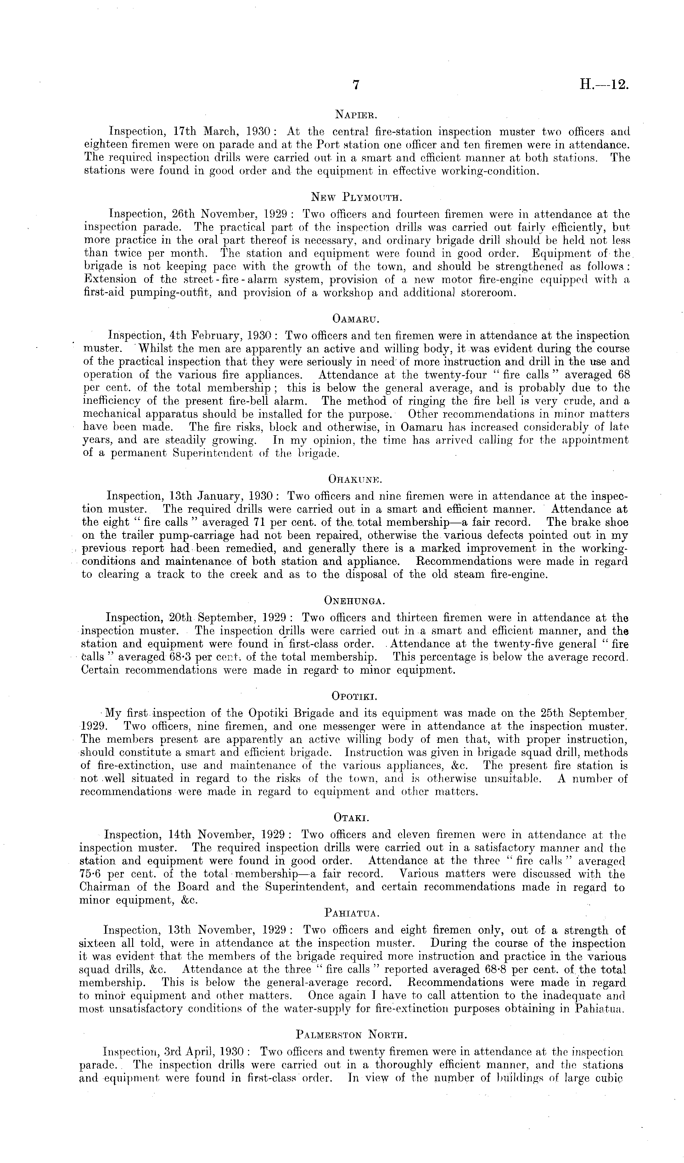 Napieb. Inspection, 17th March, 1930: At the central fire-station inspection muster two officers and eighteen firemen were on parade and at the Port station one officer and ten firemen were in attendance. The required inspection drills were carried out in a smart and efficient manner at both stations. The stations were found in good order and the equipment in effective working-condition. New Plymouth. Inspection, 26th November, 1929 : Two officers and fourteen firemen were in attendance at the inspection parade. The practical part of the inspection drills was carried out fairly efficiently, but more practice in the oral part thereof is necessary, and ordinary brigade drill should be held not less than twice per month. The station and equipment were found in good order. Equipment of the brigade is not keeping pace with the growth of the town, and should be strengthened as follows: Extension of the street - fire - alarm system, provision of a new motor fire-engine equipped with a first-aid pumping-outfit, and provision of a workshop and additional storeroom. Oamaru. Inspection, 4th February, 1930 : Two officers and ten firemen were in attendance at the inspection muster. Whilst the men are apparently an active and willing body, it was evident during the course of the practical inspection that they were seriously in need of more instruction and drill in the use and operation of the various fire appliances. Attendance at the twenty-four " fire calls " averaged 68 per cent, of the total membership ; this is below the general average, and is probably due to the inefficiency of the present fire-bell alarm. The method of ringing the fire bell is very crude, and a mechanical apparatus should be installed for the purpose. Other recommendations in minor matters have been made. The fire risks, block and otherwise, in Oamaru has increased considerably of late years, and are steadily growing. In my opinion, the time has arrived calling for the appointment of a permanent. Superintendent of the brigade. Ohakune. Inspection, 13th January, 1930 : Two officers and nine firemen were in attendance at the inspection muster. The required drills were carried out in a smart and efficient manner. Attendance at the eight " fire calls " averaged 71 per cent, of the. total membership —a fair record. The brake shoe on the trailer pump-carriage had not been repaired, otherwise the various defects pointed out in my previous report had been remedied, and generally there is a marked improvement in the workingconditions and maintenance of both station and appliance. Recommendations were made in regard to clearing a track to the creek and as to the disposal of the old steam fire-engine. Onehunga. Inspection, 20th September, 1929 : Two officers and thirteen firemen were in attendance at the inspection muster. The inspection drills were carried out in a smart and efficient manner, and the station and equipment were found in first-class order. Attendance at the twenty-five general " fire Calls " averaged 68-3 per cent; of the total membership. This percentage is below the average record. Certain recommendations were made in regard - to minor equipment. Opotiki. My first inspection of the Opotiki Brigade and its equipment was made on the 25th September 1929. Two officers, nine firemen, and one messenger were in attendance at the inspection muster. The members present are apparently an active willing body of men that, with proper instruction, should constitute a smart and efficient brigade. Instruction was given in brigade squad drill, methods of fire-extinction, use and maintenance of the various appliances, &c. The present fire station is not well situated in regard to the risks of the town, and is otherwise unsuitable. A number of recommendations were made in regard to equipment and other matters. Otaki. Inspection, 14th November, 1929 : Two officers and eleven firemen were in attendance at the inspection muster. The required inspection drills were carried out in a satisfactory manner and the station and equipment were found in good order. Attendance at the three " fire calls " averaged 75-6 per cent, of the total membership —a fair record. Various matters were discussed with the Chairman of the Board and the Superintendent, and certain recommendations made in regard to minor equipment, &c. Pahiatua. Inspection, 13th November, 1929 : Two officers and eight firemen only, out of a strength of sixteen all told, were in attendance at the inspection muster. During the course of the inspection it was evident that the members of the brigade required more instruction and practice in the various squad drills, &c. Attendance at the three " fire calls " reported averaged 68-8 per cent, of the total membership. This is below the general-average record. .Recommendations were made in regard to minor equipment and other matters. Once again I have to call attention to the inadequate and most unsatisfactory conditions of the water-supply for fire-extinction purposes obtaining in Pahiatua. Palmebston Nobth. Inspection, 3rd April, .1930 : Two officers and twenty firemen were in attendance at the inspection parade. . The inspection drills were carried out in a thoroughly efficient manner, and the stations find equipment were found in first-class order. In view of the number of buildings of large cubic