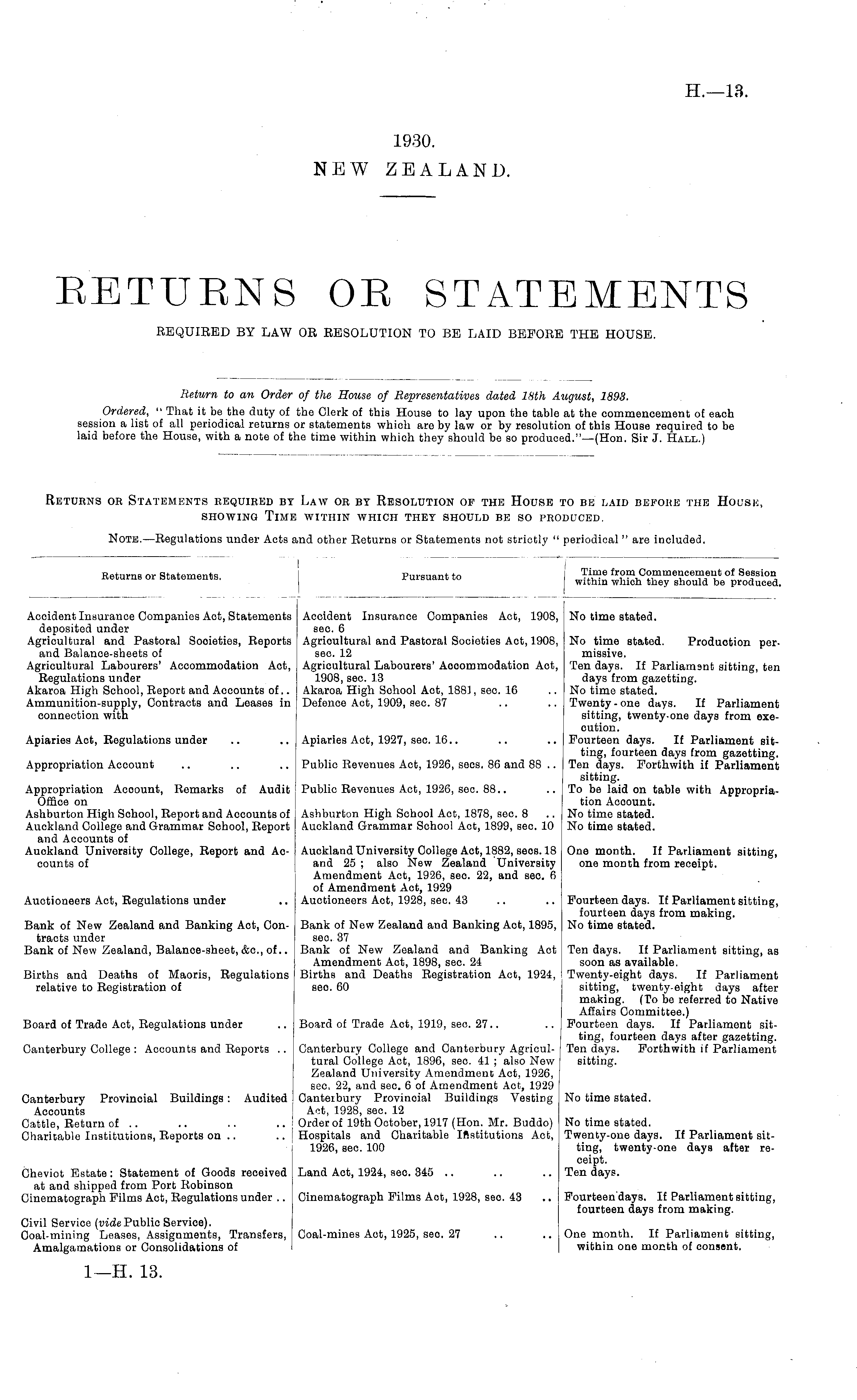 Return to an Order of the House of Representatives dated 18th August, 1893. Ordered, " That it be the duty of the Clerk of this House to lay upon the table at the commencement of each session a list of all periodical returns or statements which are by law or by resolution of this House required to be laid before the House, with a note of the time within which they should be so produced."—(Hon. Sir J. Hall.)