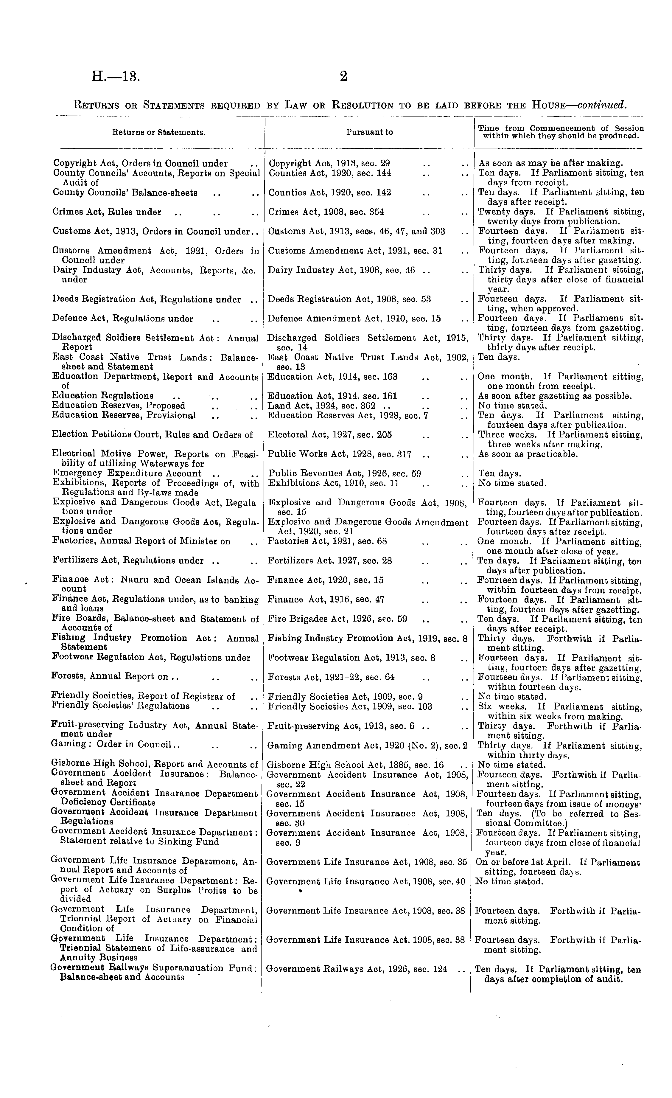 Rfitnrns or qt.stompntR Pnrsnanttn Time from Commencement ol Session Keturns or Statements. Fursuant to within which they should be produced. Copyright Act, Orders in Counoil under .. Copyright Act, 1913, sec. 29 .. .. As soon as may be after making. County Councils' Accounts, Reports on Special Counties Act, 1920, sec. 144 .. .. Ten days. If Parliament sitting, ten Audit of days from receipt. County Councils' Balance-sheets .. .. Counties Act, 1920, see. 142 .. .. Ten days. If Parliament sitting, ten days after receipt. Crimes Act, Rules under .. .. .. Crimes Act, 1908, sec. 354 .. .. Twenty days. If Parliament sitting, twenty days from publication. Customs Act, 1913, Orders in Council under.. Customs Act, 1913, sees. 46, 47, and 303 .. Fourteen days. If Parliament sitting, fourteen days after making. Customs Amendment Act, 1921, Orders in Customs Amendment Act, 1921, sec. 31 .. Fourteen days. If Parliament sitCouncil under ting, fourteen days after gazetting. Dairy Industry Act, Accounts, Reports, &o. Dairy Industry Act, 1908, sec. 46 .. .. Thirty days. If Parliament sitting, under thirty days after close of financial year. Deeds Registration Act, Regulations under .. Deeds Registration Act, 1908, sec. 53 .. Fourteen days. If Parliament sitting, when approved. Defence Act, Regulations under .. .. Defence Amendment Act, 1910, see. 15 .. Fourteen days. If Parliament sitting, fourteen days from gazetting. Discharged Soldiers Settlement Act : Annual Discharged Soldiers Settlement Act, 1915, Thirty days. If Parliament sitting, Report sec. 14 thirty days after receipt. Bast Coast Native Trust Lands: Balance- East Coast Native Trust Lands Act, 1902, Ten days. sheet and Statement seo. 13 Education Department, Report and Accounts Education Act, 1914, sec. 163 .. .. One month. If Parliament sitting, of one month from receipt. Education Regulations .. ., .. Education Act, 1914, seo. 161 .. .. As soon after gazetting as possible. Education Reserves, Proposed .. .. Land Act, 1924, sec. 362 .. .. .. No time stated. Education Reserves, Provisional .. .. Education Reserves Act, 1928, seo. 7 .. Ten days. If Parliament sitting, fourteen days after publication. Election Petitions Court, Rules and Orders of Electoral Act, 1927, seo. 205 .. .. Three weeks. If Parliament sitting, three weeks after making. Electrical Motive Power, Reports on Feasi- Public Works Act, 1928, sec. 317 .. .. As soon as practicable. bility of utilizing Waterways for Emergency Expenditure Account .. .. Publio Revenues Aot, 1926, sec. 59 Ten days. Exhibitions, Reports of Proceedings of, with Exhibitions Act, 1910, sec. 11 .. .. No time stated. Regulations and By-laws made Explosive and Dangerous Goods Act, Regula Explosive and Dangerous Goods Act, 1908, Fourteen days. If Parliament sittions under sec. 15 ting, fourteen days after publication. Explosive and Dangerous Goods Aot, Regula- Explosive and Dangerous Goods Amendment Fourteen days. If Parliament sitting, tions under Act, 1920, sec. 21 fourteen days after receipt. Factories, Annual Report of Minister on .. Factories Act, 192], seo. 68 .. .. One month. If Parliament sitting, one month after close of year. Fertilizers Act, Regulations under .. .. Fertilizers Aot, 1927, seo. 28 .. .. Ten days. If Parliament sitting, ten days after publication. Finance Act: Nauru and Ocean Islands Ac- Finance Act, 1920, sec, 15 .. .. Fourteen days. If Parliament sitting, count within fourteen days from receipt. Finance Aot, Regulations under, as to banking Finance Act, 1916, seo. 47 .. .. Fourteen days. If Parliament sitand loans ting, fourteen days after gazetting. Fire Boards, Balance-sheet and Statement of Fire Brigades Act, 1926, see. 59 .. .. Ten days. If Parliament sitting, ten Accounts of days after receipt. Fishing Industry Promotion Act : Annual Fishing Industry Promotion Act, 1919, sec. 8 Thirty days. Forthwith if ParliaStatement ment sitting. Footwear Regulation Act, Regulations under Footwear Regulation Aot, 1913, sec. 8 .. Fourteen days. If Parliament sitting, fourteen days after gazetting. Forests, Annual Report on .. .. .. Forests Aot, 1921-22, sec. 64 .. .. Fourteen days, If Parliament sitting, within fourteen days. Friendly Societies, Report of Registrar of .. Friendly Sooieties Act, 1909, seo. 9 .. No time stated. Friendly Societies' Regulations .. .. Friendly Societies Act, 1909, sec. 103 .. Six weeks. If Parliament sitting, within six weeks from making. Fruit-preserving Industry Act, Annual State- Fruit-preserving Act, 1913, sec. 6 .. .. Thirty days. Forthwith if Parliament under ment sitting. Gaming: Order in Council.. .. .. Gaming Amendment Act, 1920 (No. 2), sec. 2 Thirty days. If Parliament sitting, within thirty days. Gisborne High School, Report and Accounts of Gisbome High School Act, 1885, sec. 16 .. No time stated. Government Acoident Insuranoe: Balance- Government Aocident Insuranoe Aot, 1908, Fourteen days. Forthwith if Parlia sheet and Report sec. 22 ment sitting. Government Accident Insuranoe Department Government Accident Insurance Act, 1908, Fourteen days. If Parliament sitting, Deficiency Certificate seo. 15 fourteen days from issue of moneys' Government Accident Insurance Department Government Accident Insurance Act, 1908, Ten days. (To be referred to SesRegulations sec. 30 sional Committee.) Government Aooident Insurance Department: Government Accident Insurance Act, 1908, Fourteen days. If Parliament sitting, Statement relative to Sinking Fund seo. 9 fourteen days from close of financial year. Government Life Insurance Department, An- Government Life Insuranoe Act, 1908, sec. 35 On or before 1st April. If Parliament nual Report and Accounts of sitting, fourteen davs. Government Life Insurance Department: Re- Government Life Insurance Act, 1908, sec. 40 No time stated. port of Actuary on Surplus Profits to be divided Government Life Insurance Department, Government Life Insurance Act, 1908, seo. 38 Fourteen days. Forthwith if ParliaTriennial Report of Actuary 