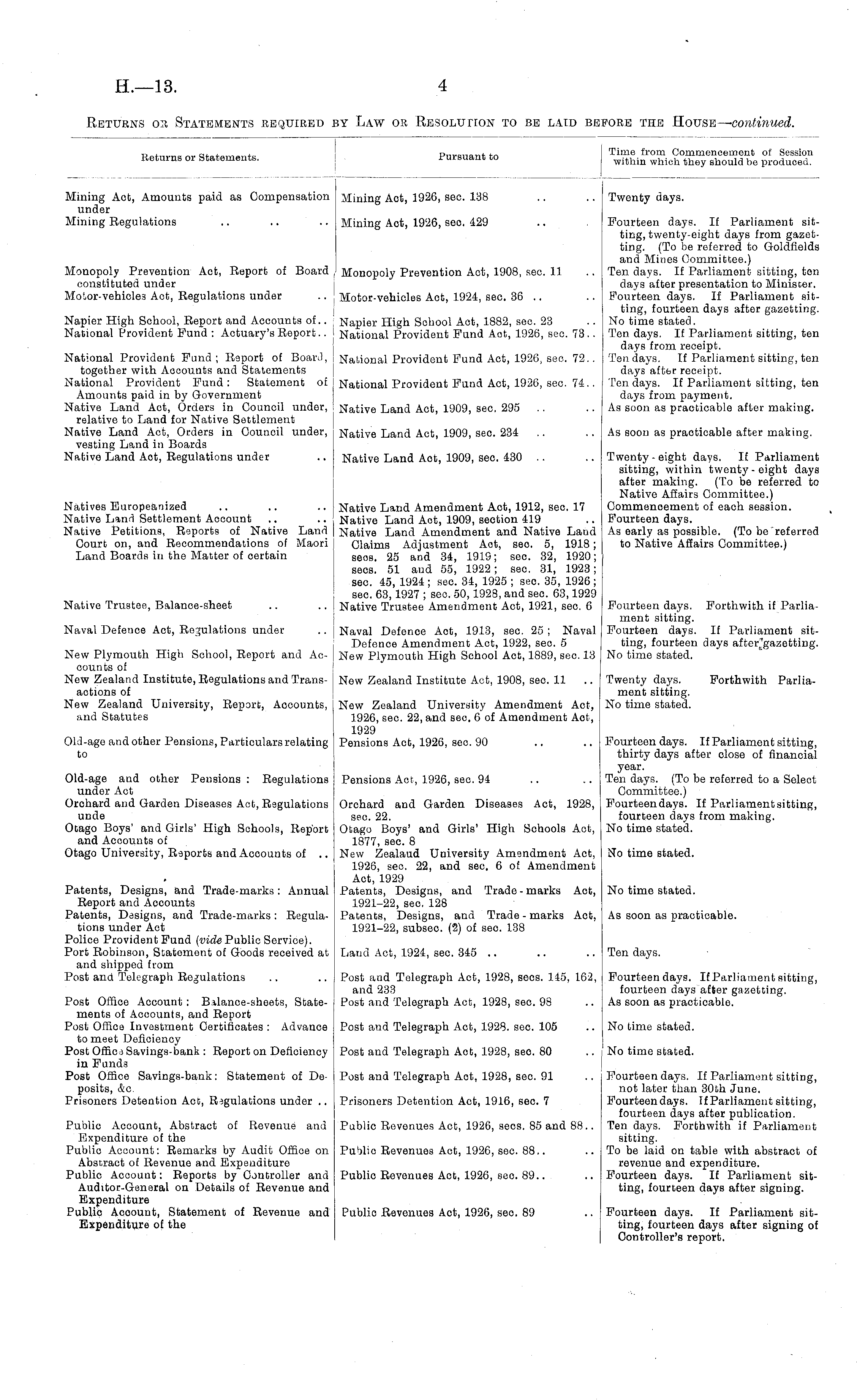 t, , a , , , ! p,-,vonov.f frv Time from Commencement of Session Returns or Statements. ; Pursuant to within which they should be produced. Mining Act, Amounts paid as Compensation Mining Act, 1926, sec. 188 .. .. Twenty days. under Mining Regulations .. .. .. Mining Act, 1926, seo. 429 .. Fourteen days. If Parliament sitting, twenty-eight days from gazetting. (To be referred to Goldfields and Mines Committee.) Monopoly Prevention Act, Report of Board Monopoly Prevention Act, 1908, sec. 11 .. Ten days. If Parliament sitting, ten constituted under i days after presentation to Minister. Motor-vehicles Act, Regulations under .. . Motor-vehicles Act, 1924, sec. 36 .. .. Fourteen days. If Parliament sitting, fourteen days after gazetting. Napier High School, Report and Accounts of.. Napier High School Act, 1882, sec. 23 .. No time stated. National Provident Fund : Actuary's Report.. National Provident Fund Act, 1926, sec. 73 .. Ten days. If Parliament sitting, ten days from receipt. National Provident Fund; Report of Board, National Provident Fund Act, 1926, seo. 72.. Ten days. If Parliament sitting, ten together with Accounts and Statements days after receipt. National Provident Fund: Statement of National Provident Fund Act, 1926, sec. 74.. Ten days. If Parliament sitting, ten Amounts paid in by Government days from payment. Native Land Act, Orders in Council under, Native Land Act, 1909, sec. 293 .. .. As soon as practicable after making, relative to Land for Native Settlement Native Land Act, Orders in Council under, Native Land Act, 1909, sec. 234 .. .. As soon as practicable after making, vesting Land in Boards Native Land Aot, Regulations under .. Native Land Aot, 1909, sec. 430 .. .. Twenty-eight days. If Parliament sitting, within twenty-eight days after making. (To be referred to Native Affairs Committee.) Natives Europeanized .. .. .. Native Land Amendment Act, 1912, sec. 17 Commencement of each session. Native L»nd Settlement Account .. .. Native Land Aot, 1909, section 419 .. Fourteen days. Native Petitions, Reports of Native Land Native Land Amendment and Native Laud As early as possible. (To be referred Court on, and Recommendations of Maori Claims Adjustment Act, seo. 5, 1918; to Native Affairs Committee.) Land Boards in the Matter of oertain seos. 25 and 34, 1919; sec. 32, 1920; sees. 51 and 55, 1922; seo. 31, 1923; sec. 45, 1924 ; sec. 34, 1925 ; seo. 35, 1926; sec. 63, 1927 ; sec. 50,1928, and sec. 63,1929 Native Trustee, Balance-sheet .. .. Native Trustee Amendment Act, 1921, sec. 6 Fourteen days. Forthwith if Parliament sitting. Naval Defence Act, Regulations under .. Naval Defence Aot, 1913, sec. 25 ; Naval Fourteen days. If Parliament sitDefence Amendment Act, 1922, seo. 5 ting, fourteen days afterjgazetting. New Plymouth High School, Report and Ac- New Plymouth High School Act, 1889, seo. 13 No time stated. counts of New Zealand Institute, Regulations and Trans- New Zealand Institute Act, 1908, seo. 11 .. Twenty days. Forthwith Parliaactions of ment sitting. New Zealand University, Report, Accounts, New Zealand University Amendment Aot, No time stated. and Statutes 1926, sec. 22, and seo, 6 of Amendment Aot, 1929 Old-age and other Pensions, Particulars relating Pensions Act, 1926, seo. 90 .. .. Fourteen days. If Parliament sitting, to thirty days after close of financial year. Old-age and other Pensions : Regulations Pensions Act, 1926, seo. 94 .. .. Ten days. (To be referred to a Select under Aot Committee.) Orchard and Garden Diseases Act, Regulations Orchard and Garden Diseases Aot, 1928, Fourteen days. If Parliament sitting, unde sec. 22. fourteen days from making. Otago Boys' and Girls' High Schools, Report Otago Boys' and Girls' High Schools Act, No time stated. and Accounts of 1877, sec. 8 Otago University, Reports and Accounts of .. New Zealaud Uuiversity Amendment Act, No time stated. 1926, seo. 22, and sec, 6 of Amendment Act, 1929 Patents, Designs, and Trade-marks: Annual Patents, Designs, and Trade-marks Act, No time stated. Report and Accounts 1921-22, sec. 128 Patents, Designs, and Trade-marks: Regula- Patents, Designs, and Trade - marks Act, As soon as practicable. tions under Act 1921-22, subsec. (2) of sec. 138 Police Provident Fund (vide Public Service). Port Robinson, Statement of Goods received at Laud Act, 1924, sec. 345 .. .. .. Ten days. and shipped from Post and Telegraph Regulations .. .. Post and Telegraph Act, 1928, sees. 145, 162, Fourteen days. If Parliament sitting, and 233 fourteen days after gazetting. Post Office Account : Balance-sheets, State- Post and Telegraph Act, 1928, sec. 98 As soon as practicable. ments of Accounts, and Report Post Office Investment Certificates : Advance Post and Telegraph Aot, 1928. seo. 105 .. No time stated. to meet Deficiency Post Offic i Savings-bank : Report on Deficiency Post and Telegraph Aot, 1928, seo. 80 .. i No time stated. in Funds Post Office Savings-bank; Statement of De- Post and Telegraph Aot, 1928, sec. 91 .. Fourteen days. If Parliament sitting, posits, &c. not later than 30th June. Prisoners Detention Act, Regulations under .. Prisoners Detention Act, 1916, sec. 7 Fourteen days. If Parliament sitting, fourteen days after publication. Public Account, Abstract of Revenue and Public Revenues Act, 1926, sees. 85 and 88.. Ten days. Forthwith if Parliament Expenditure of the sitting. Public Account; Remarks by Audit Office on Publio Revenues Act, 1926, sec. 88.. .. To be laid on table with abstract of Abstract of Revenue and Expenditure revenue and expenditure. Public Account: Reports by Controller and Public Revenues Act, 1926, seo. 89.. .. Fourteen days. If Parliament sit-Auditor-General on Details of Revenue and ting, fourteen days after signing. Expenditure Public Acoouut, Statement of Revenue and Public Revenues Act, 1926, sec. 89 .. Fourteen days. If Parliament sitExpenditure of the ting, fourteen days after signing of Controller's report.