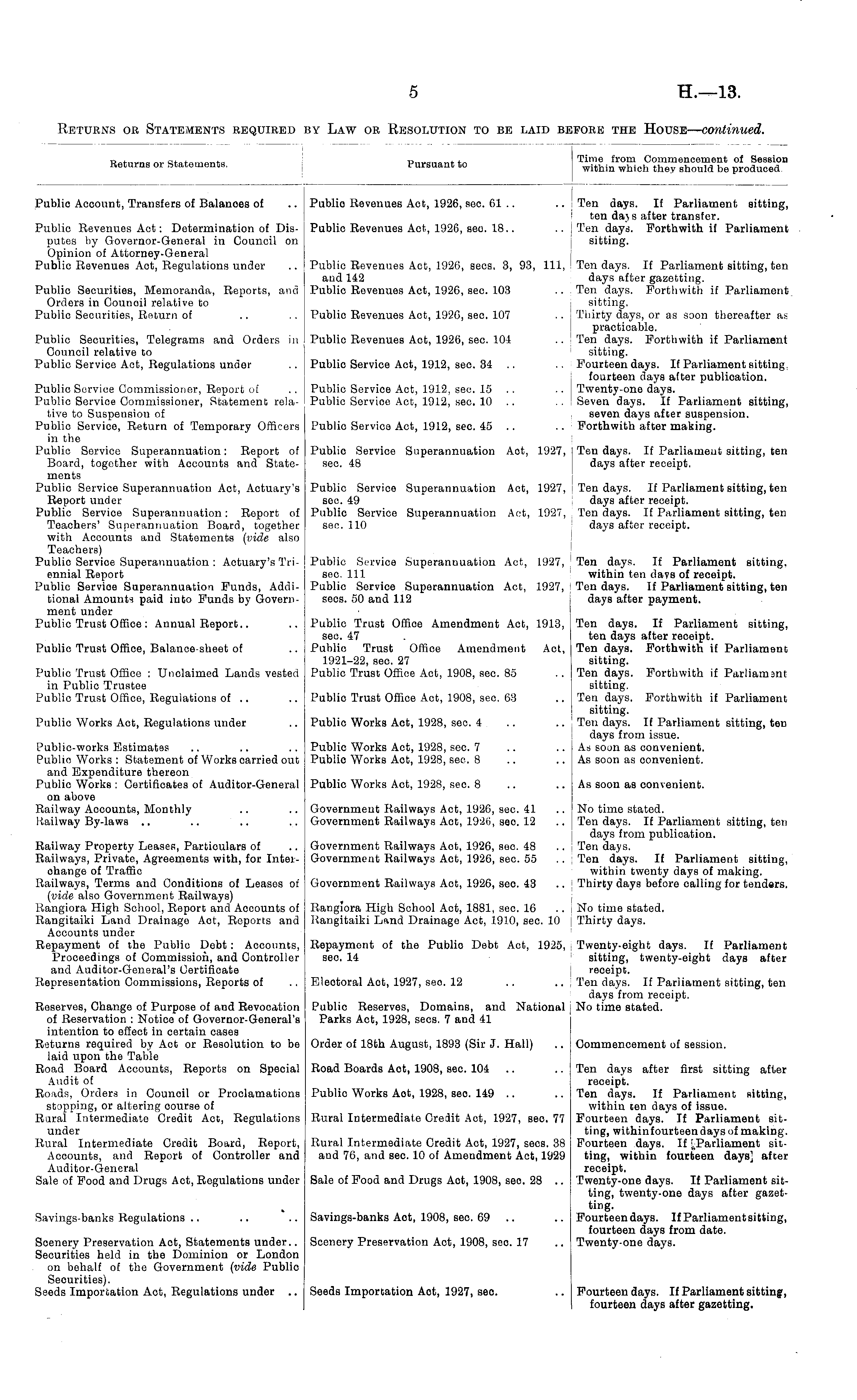 , „ , . Time from Commencement of Session Returns or Statements, Pursuant to within which they should be produced. Public Account, Transfers of Balanoes of .. Publio Revenues Act, 1926, sec. 61 .. .. Ten days. If Parliament sitting, ten days after transfer. Public Revenues Act: Determination of Dis- Public Revenues Act, 1926, seo. 18.. .. Ten dayd. Forthwith if Parliament putes by Governor-General in Council on sitting. Opinion of Attorney-General Public Revenues Act, Regulations under .. Public Revenues Act, 1926, sees. 3, 93, 111, Ten days. If Parliament sitting, ten and 142 days after gazetting. Public Securities, Memoranda, Reports, and Publio Revenues Act, 1926, sec. 103 .. Ten days. Forthwith if Parliament Orders in Council relative to sitting. Public Securities, Return of .. .. Public Revenues Act, 1920, sec. 107 .. j Thirty days, or as soon thereafter as ! practicable. Publio Securities, Telegrams and Orders in Public Revenues Act, 1926, seo. 101 .. ! Ten days. Forthwith if Parliament Council relative to sitting. Public Service Act, Regulations under .. Public Service Act, 1912, sec. 34 .. .. Fourteen days. If Parliament sitting, fourteen days after publication. Public Service Commissioner, Report of .. Public Service Act, 1912, sec. 15 .. .. 1 Twenty-one days. Public Servioe Commissioner, Statement rela- Public Servioe Act, 1912, sec. 10 .. .. 'Seven days. If Parliament sitting, tive to Suspension of seven days after suspension. Public Service, Return of Temporary Officers Public Service Act, 1912, sec. 45 .. .. Forthwith after making. in the Public Service Superannuation: Report of Public Service Superannuation Aot, 1927, Ten days. If Parliament sitting, ten Board, together with Accounts and State- sec. 48 days after receipt. ments Public Service Superannuation Act, Actuary's Public Service Superannuation Act, 1927, Ten days. If Parliament sitting, ten Report under see. 49 days after receipt. Public Servioe Superannuation: Report of Publio Service Superannuation Act, 1927, Ten days. If Parliament sitting, ten Teachers' Superannuation Board, together sec. 110 days after receipt. with Accounts and Statements (vide also Teachers) Public Service Superannuation : Actuary's Tri- Public Service Superannuation Act, 1927, Ten days. If Parliament sitting, ennial Report sec. Ill within ten davs of receipt. Public Servioe Superannuation Funds, Addi- Public Service Superannuation Act, 1927, Ten days. If Parliament sitting, ten tional Amounts paid into Funds by Govern- sees. 50 and 112 days after payment. ment under Public Trust Office: Annual Report.. .. Public Trust Offioe Amendment Act, 1913, Ten days. If Parliament sitting, sec. 47 . ten days after receipt. Public Trust Office, Balance-sheet of .. Public Trust Offioe Amendment Act, Ten days. Forthwith if Parliament 1921-22, sec. 27 sitting. Public Trust Office : Unclaimed Lands vested Public Trust Office Act, 1908, sec. 85 .. Ten days. Forthwith if Parliamsnt in Public Trustee sitting. Public Trust Office, Regulations of .. .. Public Trust Office Act, 1908, sec. 63 .. Ten days. Forthwith if Parliament sitting. Public Works Aot, Regulations under .. Public Works Act, 1928, seo. 4 .. .. Ten days. If Parliament sitting, ten days from issue. Public-works Estimates .. .. .. Publio Works Act, 1928, sec. 7 .. .. As soon as convenient. Publio Works : Statement of Works carried out Publio Works Aot, 1928, sec. 8 .. .. As soon as convenient, and Expenditure thereon Public Works : Certificates of Auditor-General Public Works Act, 1928, sec. 8 .. .. As soon as convenient. on above Railway Accounts, Monthly .. .. Government Railways Aot, 1926, sec. 41 .. No time stated. Railway By-laws .. .. .. .. Government Railways Act, 1926, seo. 12 .. Ten days. If Parliament sitting, ten days from publication. Railway Property Leases, Particulars of .. Government Railways Aot, 1926, seo. 48 .. ! Ten days. Railways, Private, Agreements with, for Inter- Government Railways Act, 1926, seo. 55 .. Ten days. If Parliament sitting, change of Traffic within twenty days of making. Railways, Terms and Conditions of Leases of Government Railways Act, 1926, seo. 43 .. Thirty days before oalling for tenders. (vide also Government Railways) Rangiora High School, Report and Aocounts of Ranglora High School Act, 1881, sec. 16 .. I No time stated. Rangitaiki Land Drainage Aot, Reports and Rangitaiki Lund Drainage Act, 1910, sec. 10 ; Thirty days. Accounts under Repayment of the Public Debt: Accounts, Repayment of the Publio Debt Act, 1925, Twenty-eight days. If Parliament Proceedings of Commission, and Controller sec. 14 sitting, twenty-eight days after and Auditor-General's Certificate receipt. Representation Commissions, Reports of .. Eleotoral Act, 1927, seo. 12 .. .. Ten days. If Parliament sitting, ten days from receipt. Reserves, Change of Purpose of and Revocation Publio Reserves, Domains, and National j No time stated. of Reservation : Notice of Governor-General's Parks Act, 1928, sees. 7 and 41 intention to effect in certain cases Returns required by Act or Resolution to be Order of 18th August, 1893 (Sir J. Hall) .. Commencement of session. laid upon the Table Road Board Accounts, Reports on Special Road Boards Aot, 1908, sec. 104 .. .. Ten days after first sitting after Audit of receipt. Roads, Orders in Council or Proclamations Public Works Aot, 1928, sec. 149 .. .. Ten days. If Parliament sitting, stopping, or altering course of within ten days of issue. Rural Intermediate Credit Act, Regulations Rural Intermediate Credit Aot, 1927, sec. 77 Fourteen days. If Parliament situnder ting, withinfourteen days of making. Rural Intermediate Credit Board, Report, Rural Intermediate Credit Aot, 1927, sees. 38 Fourteen days. If sitAocounts, and Report of Controller and and 76, and sec. 10 of Ameudment Act, 1929 ting, within fourteen days] after Auditor-General receipt. Sale of Food and Drugs Act, Regulations under Sale of Food and Drugs Aot, 1908, seo. 28 .. Twenty-one days. 