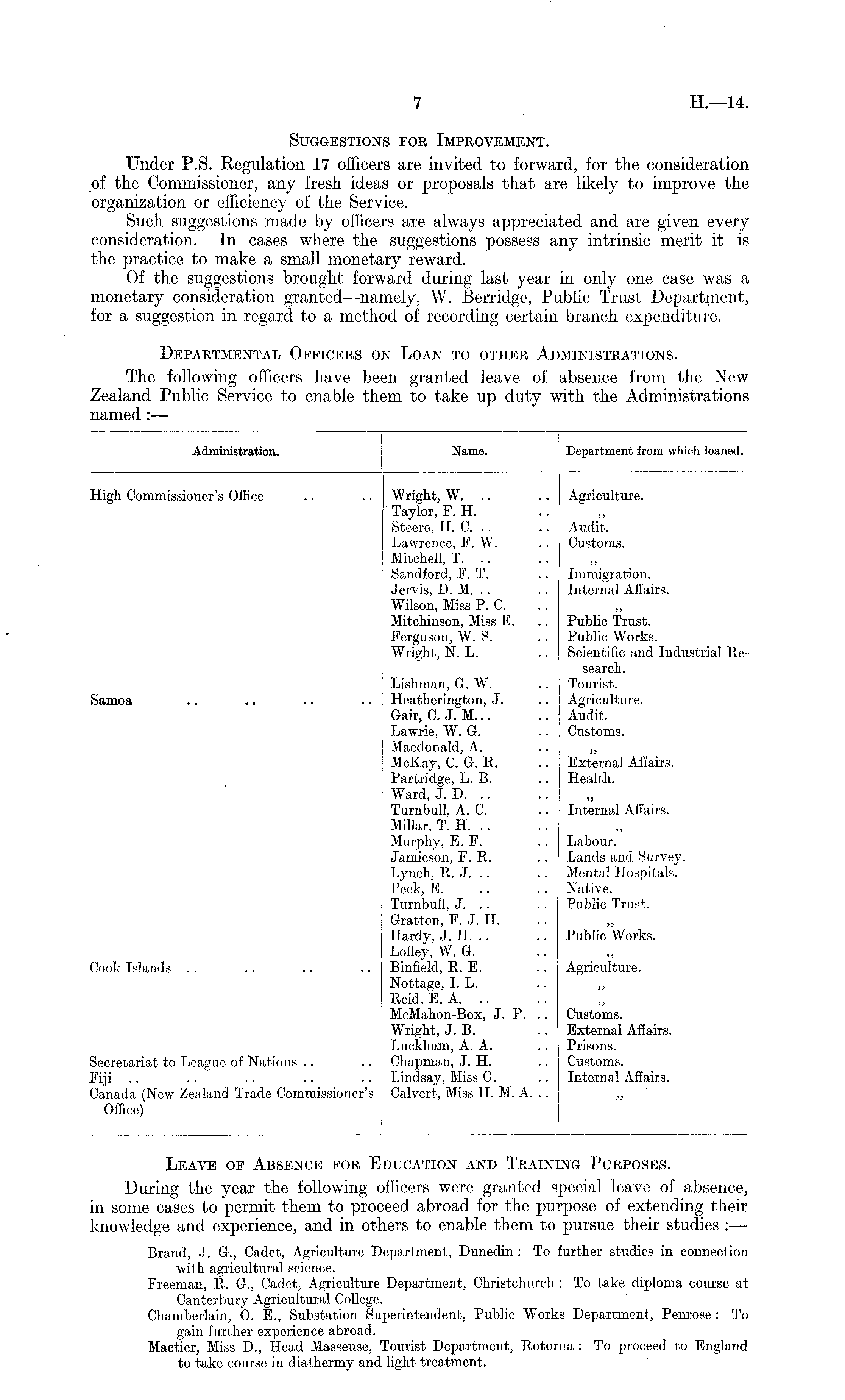 Suggestions por Improvement. Under P.S. Regulation 17 officers are invited to forward, for the consideration of the Commissioner, any fresh ideas or proposals that are likely to improve the organization or efficiency of the Service. Such suggestions made by officers are always appreciated and are given every consideration. In cases where the suggestions possess any intrinsic merit it is the practice to make a small monetary reward. Of the suggestions brought forward during last year in only one case was a monetary consideration granted —namely, W. Berridge, Public Trust Department, for a suggestion in regard to a method of recording certain branch expenditure. Departmental Oppicers on Loan to other Administrations. The following officers have been granted leave of absence from the New Zealand Public Service to enable them to take up duty with the Administrations named : —