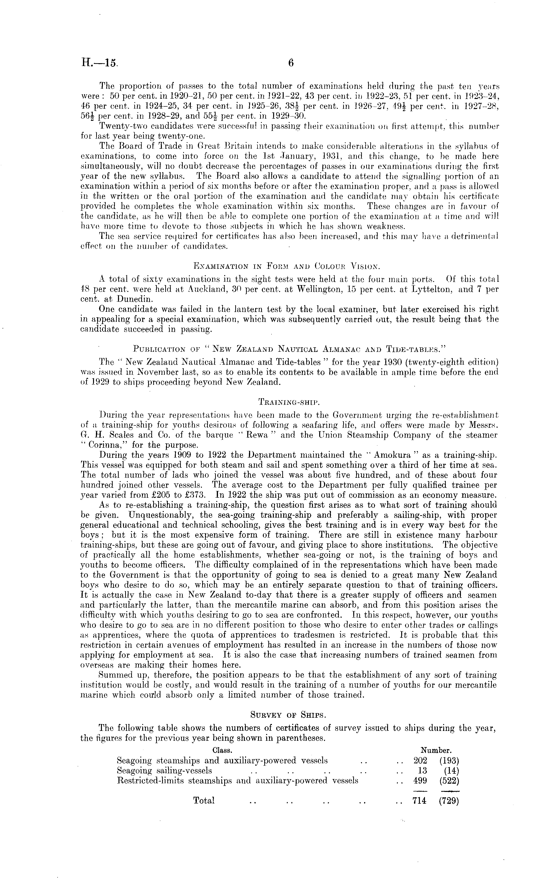 The proportion of passes to the total number of examinations held during the past ten years were : 50 per cent, in 1920-21, 50 per cent, in 1921-22, 4.3 per cent, in 1922-23, 51 per cent, in 1923-24, 46 per cent, in 1924-25, 34 per cent, in 1925-26, 38| per cent, in 1926-27, 19| per cent, in 1927-28, 56A per cent, in 1928-29, and 55J per cent, in 1929-30. Twenty-two candidates were successful in passing their examination on first attempt, this number for last year being twenty-one. The Board of Trade in Great Britain intends to make considerable alterations in the syllabus of examinations, to come into force on the Ist January, 1931, and this change, to be made here simultaneously, will no doubt decrease the percentages of passes in our examinations during the first year of the new syllabus. The Board also allows a candidate to attend the signalling portion of an examination within a period of six months before or after the examination proper, and a pass is allowed in the written or the oral portion of the examination and the candidate may obtain his certificate provided he completes the whole examination within six months. These changes are in favour of the candidate, as he will then be able to complete one portion of the examination at a time and will have more time to devote to those subjects in which he has shown weakness. The sea service required for certificates has also been increased, and this may have a detrimental effect on the number of candidates. Examination in Form and Colour Vision. A total of sixty examinations in the sight tests were held at the four main ports. Of this total 48 per cent, were held at Auckland, 30 per cent, at Wellington, 15 per cent, at Lyttelton, and 7 per cent, at Dunedin. One candidate was failed in the lantern test by the local examiner, but later exercised his right in appealing for a special examination, which was subsequently carried out, the result being that the candidate succeeded in passing. Publication of " New Zealand Nautical Almanac and Tide-tabi.es." The " New Zealand Nautical Almanac and Tide-tables " for the year 1930 (twenty-eighth edition) was issued in November last, so as to enable its contents to be available in ample time before the end of 1929 to ships proceeding beyond New Zealand. Training-ship. During the year representations have been made to the Government urging the re-establishment of a training-ship for youths desirous of following a seafaring life, and offers were made by Messrs. G. H. Scales and Co. of the barque " Rewa " and the Union Steamship Company of the steamer " Corinna," for the purpose. During the years 1909 to 1922 the Department maintained the " Amokura " as a training-ship. This vessel was equipped for both steam and sail and spent something over a third of her time at sea. The total number of lads who joined the vessel was about five hundred, and of these about four hundred joined other vessels. The average cost to the Department per fully qualified trainee per year varied from £205 to £373. In 1922 the ship was put out of commission as an economy measure. As to re-establishing a training-ship, the question first arises as to what sort of training should be given. Unquestionably, the sea-going training-ship and preferably a sailing-ship, with proper general educational and technical schooling, gives the best training and is in every way best for the boys ; but it is the most expensive form of training. There are still in existence many harbour training-ships, but these are going out of favour, and giving place to shore institutions. The objective of practically all the home establishments, whether sea-going or not, is the training of boys and youths to become officers. The difficulty complained of in the representations which have been made to the Government is that the opportunity of going to sea is denied to a great many New Zealand boys who desire to do so, which may be an entirely separate question to that of training officers. It is actually the case in New Zealand to-day that there is a greater supply of officers and seamen and particularly the latter, than the mercantile marine can absorb, and from this position arises the difficulty with which youths desiring to go to sea are confronted. In this respect, however, our youths who desire to go to sea are in no different position to those who desire to enter other trades or callings as apprentices, where the quota of apprentices to tradesmen is restricted. It is probable that this restriction in certain avenues of employment has resulted in an increase in the numbers of those now applying for employment at sea. It is also the case that increasing numbers of trained seamen from overseas are making their homes here. Summed up, therefore, the position appears to be that the establishment of any sort of training institution would be costly, and would result in the training of a number of youths for our mercantile marine which coirld absorb only a limited number of those trained. Survey of Ships. The following table shows the numbers of certificates of survey issued to ships during the year, the figures for the previous year being shown in parentheses. Class. Number. Seagoing steamships and auxiliary-powered vessels .. .. 202 (193) Seagoing sailing-vessels . . .. .. .. . . 13 (14) Restricted-limits steamships and auxiliary-powered vessels .. 499 (522) Total .. .. .. .. .. 714 (729)