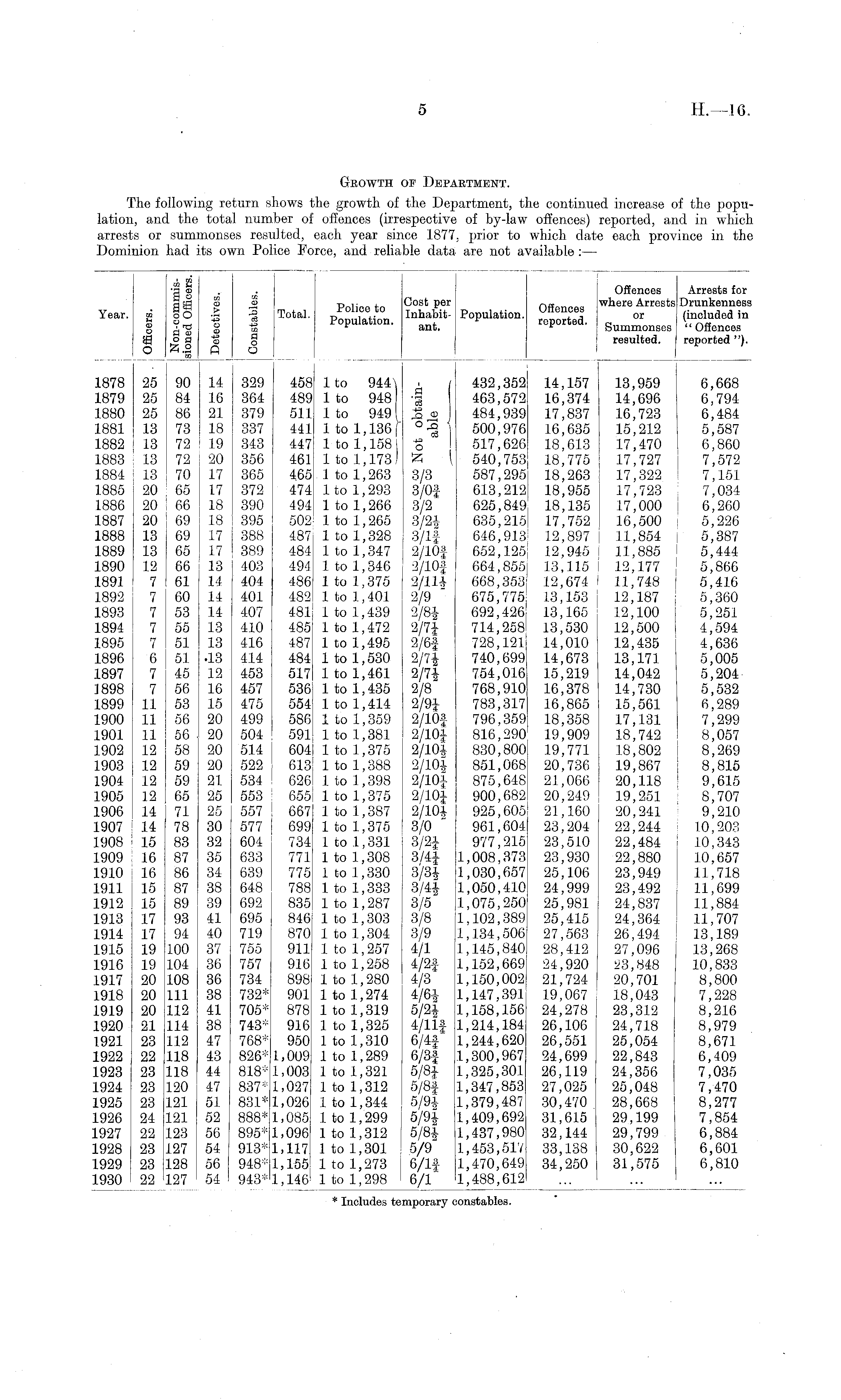 Growth of Department. The following return shows the growth of the Department, the continued increase of the population, and the total number of offences (irrespective of by-law offences) reported, and in which arrests or summonses resulted, each year since 1877, prior to which date each province in the Dominion had its own Police Force, and reliable data are not available :—