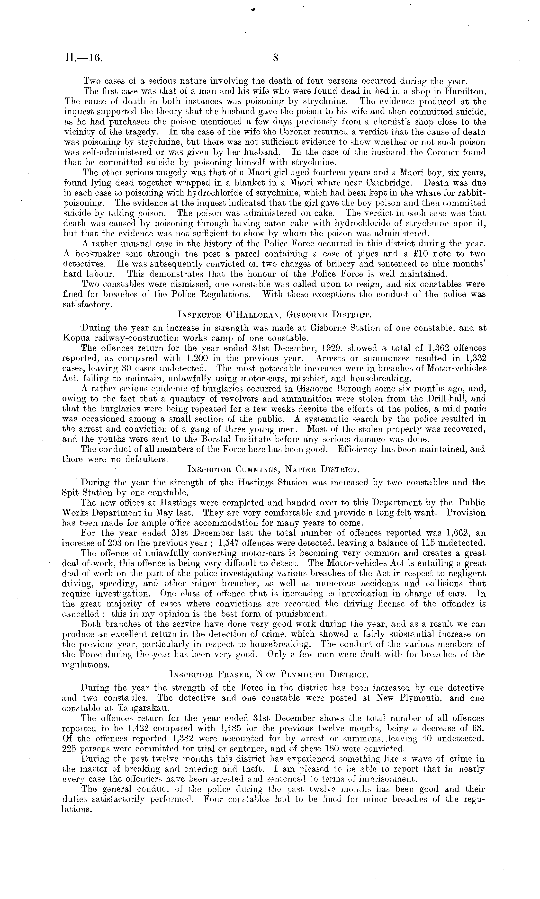 Two cases of a serious nature involving the death of four persons occurred during the year. The first case was that of a man and his wife who were found dead in bed in a shop in Hamilton. The cause of death in both instances was poisoning by strychnine. The evidence produced at the inquest supported the theory that the husband gave the poison to his wife and then committed suicide, as he had purchased the poison mentioned a few days previously from a chemist's shop close to the vicinity of the tragedy. In the case of the wife the Coroner returned a verdict that the cause of death was poisoning by strychnine, but there was not sufficient evidence to show whether or not such poison was self-administered or was given by her husband. In the case of the husband the Coroner found that he committed suicide by poisoning himself with strychnine. The other serious tragedy was that of a Maori girl aged fourteen years and a Maori boy, six years, found lying dead together wrapped in a blanket in a Maori whare near Cambridge. Death was due in each case to poisoning with hydrochloride of strychnine, which had been kept in the whare for rabbitpoisoning. The evidence at the inquest indicated that the girl gave the boy poison and then committed suicide by taking poison. The poison was administered on cake. The verdict in each case was that death was caused by poisoning through having eaten cake with hydrochloride of strychnine upon it, but that the evidence was not sufficient to show by whom the poison was administered. A rather unusual case in the history of the Police Force occurred in this district during the year. A bookmaker sent through the post a parcel containing a case of pipes and a £10 note to two detectives. He was subsequently convicted on two charges of bribery and sentenced to nine months' hard labour. This demonstrates that the honour of the Police Force is well maintained. Two constables were dismissed, one constable was called upon to resign, and six constables were fined for breaches of the Police Regulations. With these exceptions the conduct of the police was satisfactory. Inspector O'Halloran, Gisborne District; During the year an increase in strength was made at Gisborne Station of one constable, and at Kopua railway-construction works cam]) of one constable. The offences return for the year ended 31st .December, 1929, showed a total of 1,362 offences reported, as compared with 1,200 in the previous year. Arrests or summonses resulted in 1,332 cases, leaving 30 cases undetected. The most noticeable increases were in breaches of Motor-vehicles Act, failing to maintain, unlawfully using motor-cars, mischief, and housebreaking. A rather serious epidemic of burglaries occurred in Gisborne Borough some six months ago, and, owing to the fact that a quantity of revolvers and ammunition were stolen from the Drill-hall, and that the burglaries were being repeated for a few weeks despite the efforts of the police, a mild panic was occasioned among a small section of the public. A systematic search by the police resulted in the arrest and conviction of a gang of three young men. Most of the stolen property was recovered, and the youths were sent to the Borstal Institute before any serious damage was done. The conduct of all members of the Force here has been good. Efficiency has been maintained, and there were no defaulters. Inspector Cummings, Napier District. During the year the strength of the Hastings Station was increased by two constables and the Spit Station by one constable. The new offices at Hastings were completed and handed over to this Department by the Public Works Department in May last. They are very comfortable and provide a long-felt want. Provision has been made for ample office accommodation for many years to come. For the year ended 31st December last the total number of offences reported was 1,662, an increase of 203 on the previous year ; 1,547 offences were detected, leaving a balance of 115 undetected. The offence of unlawfully converting motor-cars is becoming very common and creates a great deal of work, this offence is being very difficult to detect. The Motor-vehicles Act is entailing a great deal of work on the part of the police investigating various breaches of the Act in respect to negligent driving, speeding, and other minor breaches, as well as numerous accidents and collisions that require investigation. One class of offence that is increasing is intoxication in charge of cars. In the great majority of cases where convictions are recorded the driving license of the offender is cancelled : this in my opinion is the best form of punishment. Both branches of the service have done very good work during the year, and as a result we can produce an excellent return in the detection of crime, which showed a fairly substantial increase on the previous year, particularly in respect to housebreaking. The conduct of the various members of the Force during the year has been very good. Only a few men were dealt with for breaches of the regulations. Inspector Fraser, New Plymouth District. During the year the strength of the Force in the district has been increased by one detective and two constables. The detective and one constable were posted at New Plymouth, and one constable at Tangarakau. The offences return for the year ended 31st December shows the total number of all offences reported to be 1,422 compared with 1,485 for the previous twelve months, being a decrease of 63. Of the offences reported 1,382 were accounted for by arrest or summons, leaving 40 undetected. 225 persons were committed for trial or sentence, and of these 180 wore convicted. During the past twelve months this district has experienced something like a wave of crime in the matter of breaking and entering and theft. lam pleased to be able to report that in nearly every case the offenders have been arrested and sentenced to terms of imprisonment. The general conduct of the police during the past t