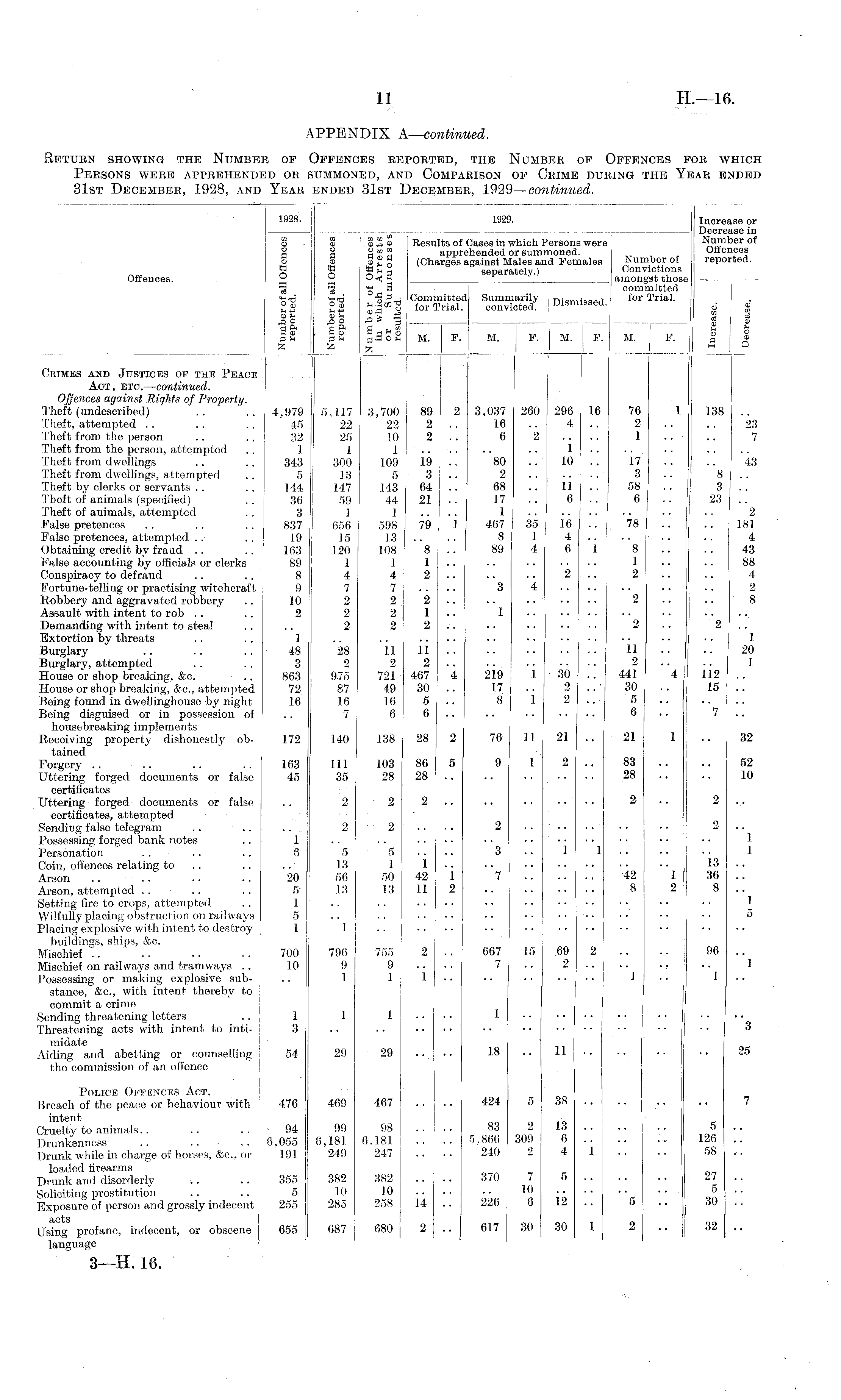 APPENDIX A—continued. Return showing the Number of Offences reported, the Number of Offences for which Persons were apprehended or summoned, and Comparison of Crime during the Year ended 31st December, 1928, and Year ended 31st December, 1929—continued.