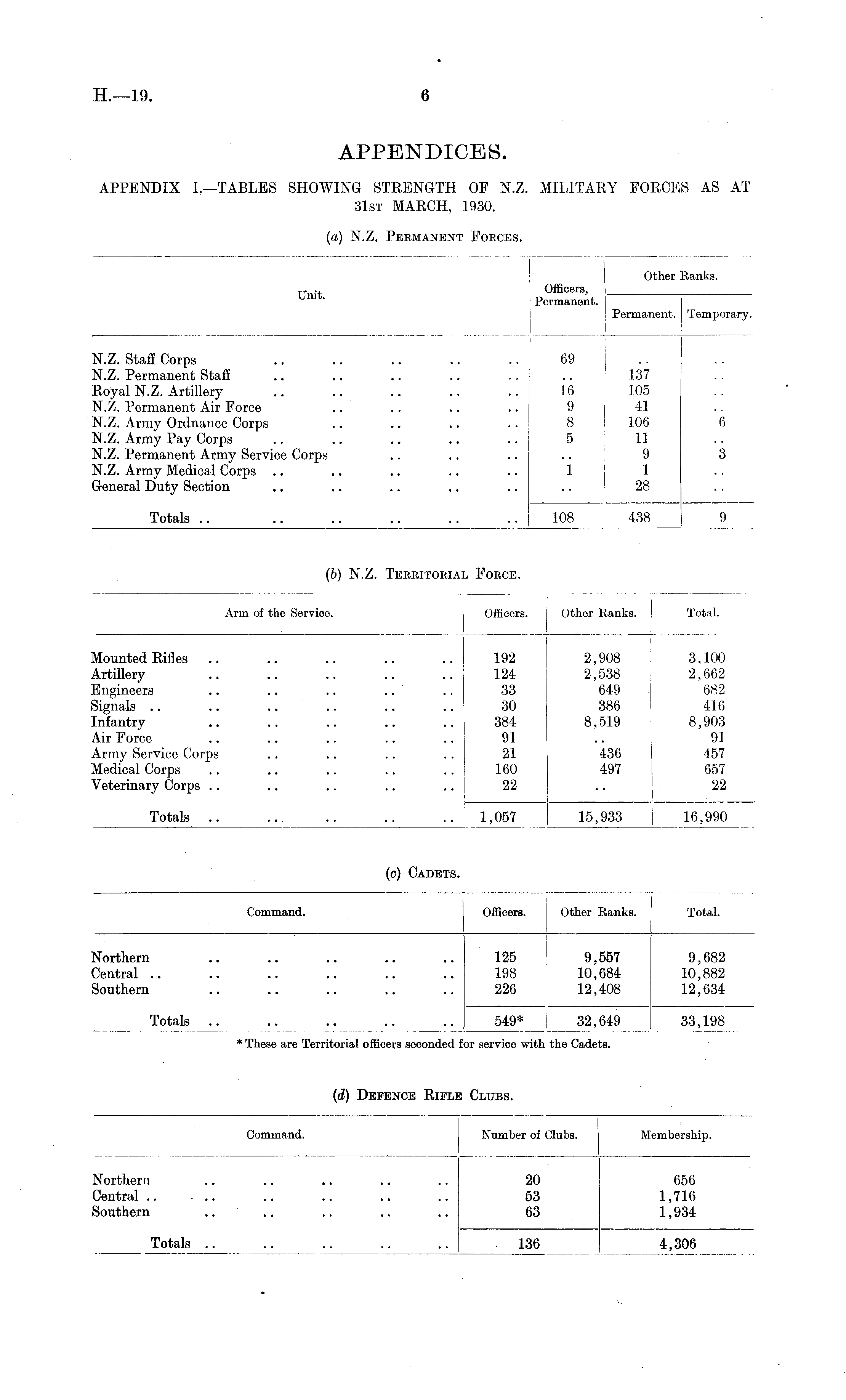 APPENDICES. APPENDIX I.—TABLES SHOWING STRENGTH OF N.Z. MILITARY FORCES AS AT 31st MARCH, 1930. (a) N.Z. Permanent Forces.