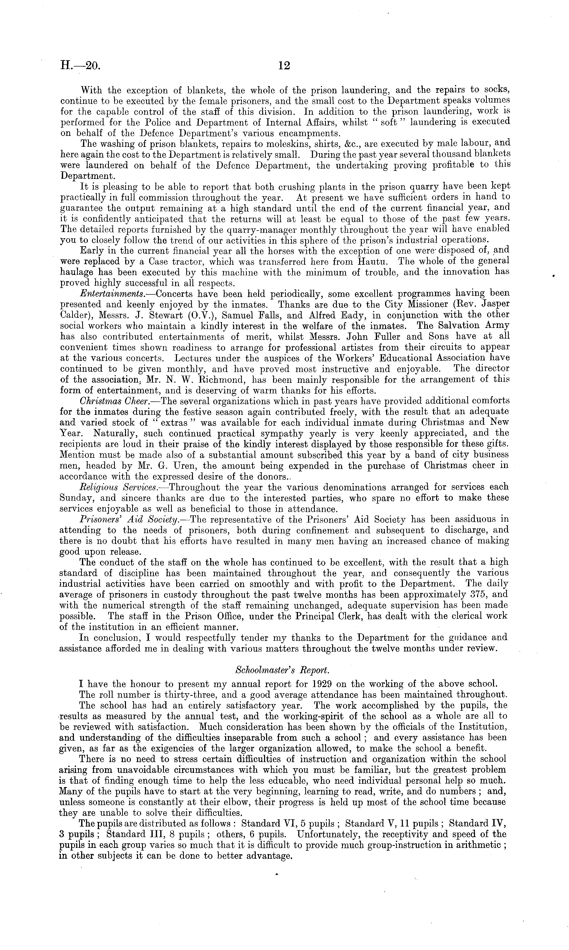 With the exception of blankets, the whole of the prison laundering, and the repairs to socks, continue to be executed by the female prisoners, and the small cost to the Department speaks volumes for the capable control of the staff of this division. In addition to the prison laundering, work is performed for the Police and Department of Internal Affairs, whilst " soft " laundering is executed on behalf of the Defence Department's various encampments. The washing of prison blankets, repairs to moleskins, shirts, &c., are executed by male labour, and here again the cost to the Department is relatively small. During the past year several thousand blankets were laundered on behalf of the Defence Department, the undertaking proving profitable to this Department. It is pleasing to be able to report that both crushing plants in the prison quarry have been kept practically in full commission throughout the year. At present we have sufficient orders in hand to guarantee the output remaining at a high standard until the end of the current financial year, and it is confidently anticipated that the returns will at least be equal to those of the past few years. The detailed reports furnished by the quarry-manager monthly throughout the year will have enabled you to closely follow the trend of our activities in this sphere of the prison's industrial operations. Early in the current financial year all the horses with the exception of one were- disposed of, and were replaced by a Case tractor, which was transferred here from Hautu. The whole of the general haulage has been executed by this machine with the minimum of trouble, and the innovation has proved highly successful in all respects. Entertainments.—Concerts have been held periodically, some excellent programmes having been presented and keenly enjoyed by the inmates. Thanks are due to the City Missioner (Rev. Jasper Calder), Messrs. J. Stewart (0.V.), Samuel Falls, and Alfred Eady, in conjunction with the other social workers who maintain a kindly interest in the welfare of the inmates. The Salvation Army has also contributed entertainments of merit, whilst Messrs. John Fuller and Sons have at all convenient times shown readiness to arrange for professional artistes from their circuits to appear at the various concerts. Lectures under the auspices of the Workers' Educational Association have continued to be given monthly, and have proved most instructive and enjoyable. The director of the association, Mr. N. W. Richmond, has been mainly responsible for the arrangement of this form of entertainment, and is deserving of warm thanks for his efforts. Christmas Cheer. —The several organizations which in past years have provided additional comforts for the inmates during the festive season again contributed freely, with the result that an adequate and varied stock of " extras " was available for each individual inmate during Christmas and New Year. Naturally, such continued practical sympathy yearly is very keenly appreciated, and the recipients are loud in their praise of the kindly interest displayed by those responsible for these gifts. Mention must be made also of a substantial amount subscribed this year by a band of city business men, headed by Mr. G. Uren, the amount being expended in the purchase of Christinas cheer in accordance with the expressed desire of the donors.. Religious Services.—Throughout the year the various denominations arranged for services each Sunday, and sincere thanks are due to the interested parties, who spare no effort to make these services enjoyable as well as beneficial to those in attendance. Prisoners' Aid Society. —The representative of the Prisoners' Aid Society has been assiduous in attending to the needs of prisoners, both during confinement and subsequent to discharge, and there is no doubt that his efforts have resulted in many men having an increased chance of making good upon release. The conduct of the staff on the whole has continued to be excellent, with the result that a high standard of discipline has been maintained throughout the year, and consequently the various industrial activities have been carried on smoothly and with profit to the Department. The daily average of prisoners in custody throughout the past twelve months has been approximately 375, and with the numerical strength of the staff remaining unchanged, adequate supervision has been made possible. The staff in the Prison Office, under the Principal Clerk, has dealt with the clerical work of the institution in an efficient manner. In conclusion, I would respectfully tender my thanks to the Department for the guidance and assistance afforded me in dealing with various matters throughout the twelve months under review. Schoolmaster's Report. I have the honour to present my annual report for 1929 on the working of the above school. The roll number is thirty-three, and a good average attendance has been maintained throughout. The school has had an entirely satisfactory year. The work accomplished by the pupils, the results as measured by the annual test, and the working-spirit of the school as a whole are all to be reviewed with satisfaction. Much consideration has been shown by the officials of the Institution, and understanding of the difficulties inseparable from such a school ; and every assistance has been given, as far as the exigencies of the larger organization allowed, to make the school a benefit. There is no need to stress certain difficulties of instruction and organization within the school arising from unavoidable circumstances with which you must be familiar, but the greatest problem is that of finding enough time to help the less educable, who need individual personal help so much. Many of the pupils have to start at the very beginning, learning to read, write, and do numbers ; and, unless someone is constantly at their elbow, their progress is held up most of the school time because they are unable to solve their diffi