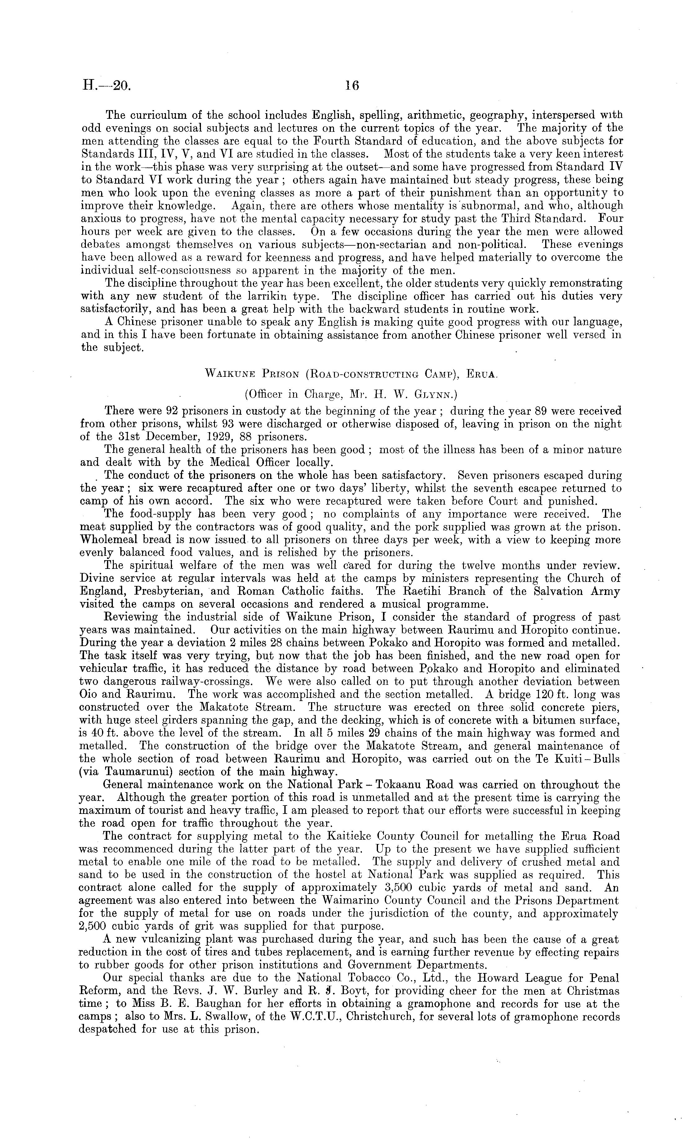 The curriculum of the school includes English, spelling, arithmetic, geography, interspersed with odd evenings on social subjects and lectures on the current topics of the year. The majority of the men attending the classes are equal to the Fourth Standard of education, and the above subjects for Standards 111, IV, V, and VI are studied in the classes. Most of the students take a very keen interest in the work—this phase was very surprising at the outset—and some have progressed from Standard IV to Standard VI work during the year ; others again have maintained but steady progress, these being men who look upon the evening classes as more a part of their punishment than an opportunity to improve their knowledge. Again, there are others whose mentality is subnormal, and who, although anxious to progress, have not the mental capacity necessary for study past the Third Standard. Four hours per week are given to the classes. On a few occasions during the year the men were allowed debates amongst themselves on various subjects —non-sectarian and non-political. These evenings have been allowed as a reward for keenness and progress, and have helped materially to overcome the individual self-consciousness so apparent in the majority of the men. The discipline throughout the year has been excellent, the older students very quickly remonstrating with any new student of the larrikin type. The discipline officer has carried out his duties very satisfactorily, and has been a great help with the backward students in routine work. A Chinese prisoner unable to speak any English is making quite good progress with our language, and in this I have been fortunate in obtaining assistance from another Chinese prisoner well versed in the subject. Waikune Prison (Road-constructing Camp), Erua, (Officer in Charge, Mr. H. W. Glynn.) There were 92 prisoners in custody at the beginning of the year ; during the year 89 were received from other prisons, whilst 93 were discharged or otherwise disposed of, leaving in prison on the night of the 31st December, 1929, 88 prisoners. The general health of the prisoners has been good ; most of the illness has been of a minor nature and dealt with by the Medical Officer locally. The conduct of the prisoners on the whole has been satisfactory. Seven prisoners escaped during the year ; six were recaptured after one or two days' liberty, whilst the seventh escapee returned to camp of his own accord. The six who were recaptured were taken before Court and punished. The food-supply has been very good ; no complaints of any importance were received. The meat supplied by the contractors was of good quality, and the pork supplied was grown at the prison. Wholemeal bread is now issued to all prisoners on three days per week, with a view to keeping more evenly balanced food values, and is relished by the prisoners. The spiritual welfare of the men was well c'ared for during the twelve months under review. Divine service at regular intervals was held at the camps by ministers representing the Church of England, Presbyterian, and Roman Catholic faiths. The Raetihi Branch of the Salvation Army visited the camps on several occasions and rendered a musical programme. Reviewing the industrial side of Waikune Prison, I consider the standard of progress of past years was maintained. Our activities on the main highway between Raurimu and Horopito continue. During the year a deviation 2 miles 28 chains between Pokako and Horopito was formed and metalled. The task itself was very trying, but now that the job has been finished, and the new road open for vehicular traffic, it has reduced the distance by road between Pokako and Horopito and eliminated two dangerous railway-crossings. We were also called on to put through another deviation between Oio and Raurimu. The work was accomplished and the section metalled. A bridge 120 ft. long was constructed over the Makatote Stream. The structure was erected on three solid concrete piers, with huge steel girders spanning the gap, and the decking, which is of concrete with a bitumen surface, is 40 ft. above the level of the stream. In all 5 miles 29 chains of the main highway was formed and metalled. The construction of the bridge over the Makatote Stream, and general maintenance of the whole section of road between Raurimu and Horopito, was carried out on the Te Kuiti- Bulls (via Taumarunui) section of the main highway. General maintenance work on the National Park - Tokaanu Road was carried on throughout the year. Although the greater portion of this road is unmetalled and at the present time is carrying the maximum of tourist and heavy traffic, I am pleased to report that our efforts were successful in keeping the road open for traffic throughout the year. The contract for supplying metal to the Kaitieke County Council for metalling the Erua Road was recommenced during the latter part of the year. Up to the present we have supplied sufficient metal to enable one mile of the road to be metalled. The supply and delivery of crushed metal and sand to be used in the construction of the hostel at National Park was supplied as required. This contract alone called for the supply of approximately 3,500 cubic yards of metal and sand. An agreement was also entered into between the Waimarino County Council and the Prisons Department for the supply of metal for use on roads under the jurisdiction of the county, and approximately 2,500 cubic yards of grit was supplied for that purpose. A new vulcanizing plant was purchased during the year, and such has been the cause of a great reduction in the cost of tires and tubes replacement, and is earning further revenue by effecting repairs to rubber goods for other prison institutions and Government Departments. Our special thanks are due to the National Tobacco Co., Ltd., the Howard League for Penal Reform, and the Revs. J. W. Burley and R. S. Bovt, for providing cheer for the men at Christmas time ; to Miss B. E. Baug