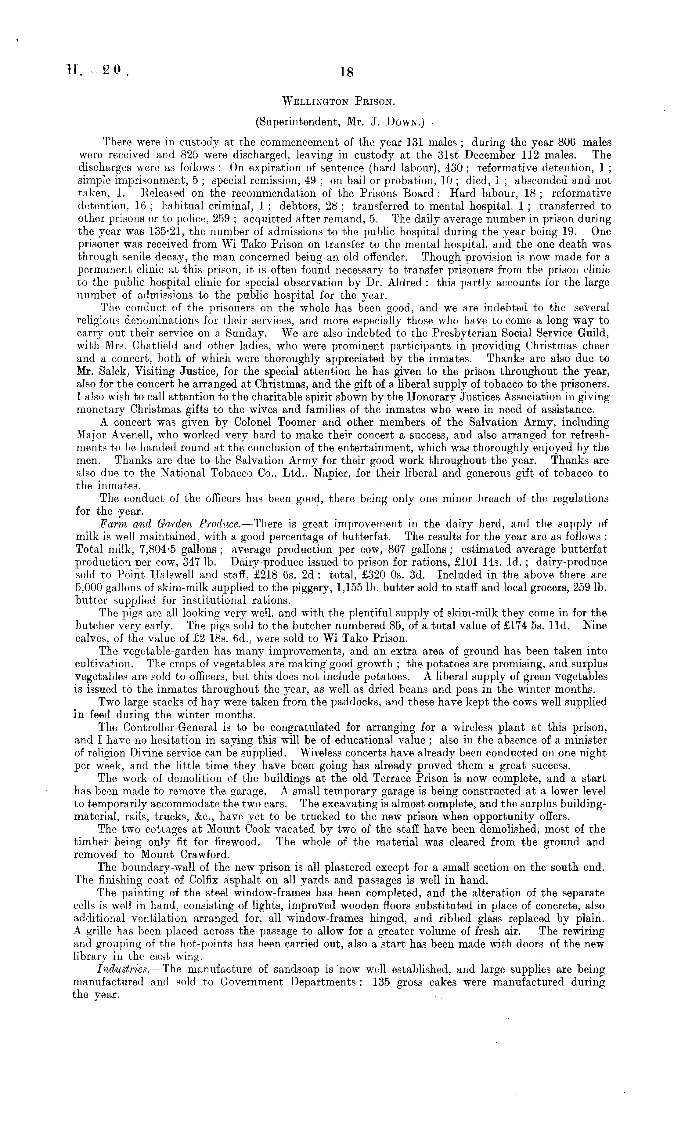 Wellington Prison. (Superintendent, Mr. J. Down.) There were in custody at the commencement of the year 131 males ; during the year 806 males were received and 825 were discharged, leaving in custody at the 31st December 112 males. The discharges were as follows : On expiration of sentence (hard labour), 430 ; reformative detention, 1 ; simple imprisonment, 5 ; special remission, 49 ; on bail or probation, 10 ; died, 1 ; absconded and not taken, 1. Released on the recommendation of the Prisons Board: Hard labour, 18; reformative detention, 16 ; habitual criminal, 1 ; debtors, 28 ; transferred to mental hospital, 1 ; transferred to other prisons or to police, 259 ; acquitted after remand, 5. The daily average number in prison during the year was 135-21, the number of admissions to the public hospital during the year being 19. One prisoner was received from Wi Tako Prison on transfer to the mental hospital, and the one death was through senile decay, the man concerned being an old offender. Though provision is now made for a permanent clinic at this prison, it is often found necessary to transfer prisoners from the prison clinic to the public hospital clinic for special observation by Dr. Aldred : this partly accounts for the large number of admissions to the public hospital for the year. The conduct of the prisoners on the whole has been good, and we are indebted to the several religious denominations for their services, and more especially those who have to come a long way to carry out their service on a Sunday. We are also indebted to the Presbyterian Social Service Guild, with Mrs. Chatfield and other ladies, who were prominent participants in providing Christmas cheer and a concert, both of which were thoroughly appreciated by the inmates. Thanks are also due to Mr. Salek, Visiting Justice, for the special attention he has given to the prison throughout the year, also for the concert he arranged at Christmas, and the gift of a liberal supply of tobacco to the prisoners. I also wish to call attention to the charitable spirit shown by the Honorary Justices Association in giving monetary Christmas gifts to the wives and families of the inmates who were in need of assistance. A concert was given by Colonel Toomer and other members of the Salvation Army, including Major Avenell, who worked very hard to make their concert a success, and also arranged for refreshments to be handed round at the conclusion of the entertainment, which was thoroughly enjoyed by the men. Thanks are due to the Salvation Army for their good work throughout the year. Thanks are also due to the National Tobacco Co., Ltd., Napier, for their liberal and generous gift of tobacco to the inmates. The conduct of the officers has been good, there being only one minor breach of the regulations for the year. Farm and Garden Produce. —There is great improvement in the dairy herd, and the supply of milk is well maintained, with a good percentage of butterfat. The results for the year are as follows : Total milk, 7,804-5 gallons ; average production per cow, 867 gallons ; estimated average butterfat production per cow, 347 lb. Dairy-produce issued to prison for rations, £101 14s. Id. ; dairy-produce sold to Point Halswell and staff, £218 6s. 2d : total, £320 os. 3d. Included in the above there are 5,000 gallons of skim-milk supplied to the piggery, 1,155 lb. butter sold to staff and local grocers, 259 lb. butter supplied for institutional rations. The pigs are all looking very well, and with the plentiful supply of skim-milk they come in for the butcher very early. The pigs sold to the butcher numbered 85, of a total value of £174 ss. lid. Nine calves, of the value of £2 18s. 6d., were sold to Wi Tako Prison. The vegetable-garden has many improvements, and an extra area of ground has been taken into cultivation. The crops of vegetables are making good growth ; the potatoes are promising, and surplus vegetables are sold to officers, but this does not include potatoes. A liberal supply of green vegetables is issued to the inmates throughout the year, as well as dried beans and peas in the winter months. Two large stacks of hay were taken from the paddocks, and these have kept the cows well supplied in feed during the winter months. The Controller-General is to be congratulated for arranging for a wireless plant at this prison, and I have no hesitation in saying this will be of educational value ; also in the absence of a minister of religion Divine service can be supplied. Wireless concerts have already been conducted on one night per week, and the little time they have been going has already proved them a great success. The work of demolition of the buildings at the old Terrace Prison is now complete, and a start has been made to remove the garage. A small temporary garage is being constructed at a lower level to temporarily accommodate the two cars. The excavating is almost complete, and the surplus buildingmaterial, rails, trucks, &c., have yet to be trucked to the new prison when opportunity offers. The two cottages at Mount Cook vacated by two of the staff have been demolished, most of the timber being only fit for firewood. The whole of the material was cleared from the ground and removed to Mount Crawford. The boundary-wall of the new prison is all plastered except for a small section on the south end. The finishing coat of Colfix asphalt on all yards and passages is well in hand. The painting of the steel window-frames has been completed, and the alteration of the separate cells is well in hand, consisting of lights, improved wooden floors substituted in place of concrete, also additional ventilation arranged for, all window-frames hinged, and ribbed glass replaced by plain. A grille has been placed across the passage to allow for a greater volume of fresh air. The rewiring and grouping of the hot-points has been carried out, also a start has been made with doors of the newlibrary in the east wing. Industries. —Th