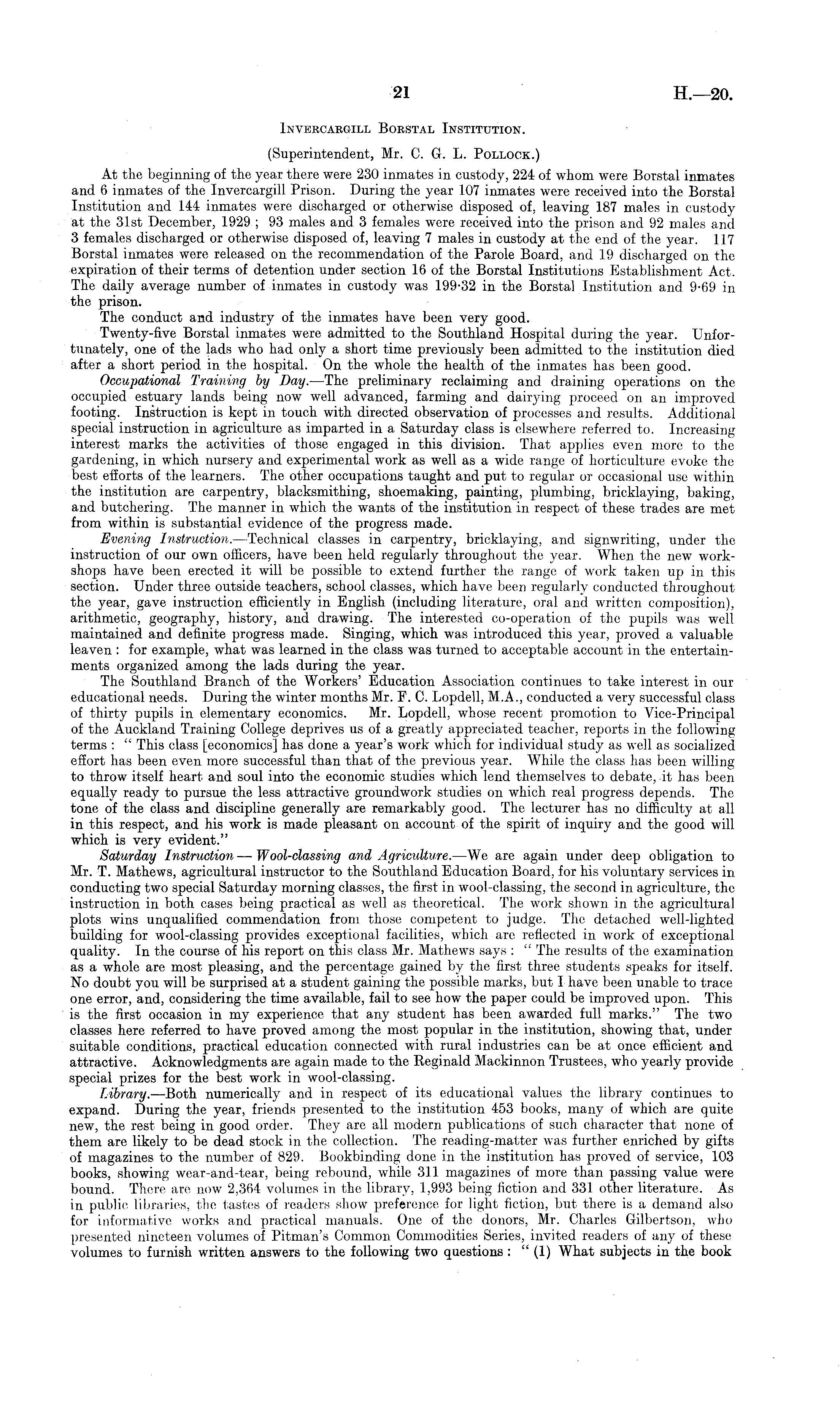 Invercargill Borstal Institution. (Superintendent, Mr. C. G. L. Pollock.) At the beginning of the year there were 230 inmates in custody, 224 of whom were Borstal inmates and 6 inmates of the Invercargill Prison. During the year 107 inmates were received into the Borstal Institution and 144 inmates were discharged or otherwise disposed of, leaving 187 males in custody at the 31st December, 1929 ; 93 males and 3 females were received into the prison and 92 males and 3 females discharged or otherwise disposed of, leaving 7 males in custody at the end of the year. 117 Borstal inmates were released on the recommendation of the Parole Board, and 19 discharged on the expiration of their terms of detention under section 16 of the Borstal Institutions Establishment Act. The daily average number of inmates in custody was 199-32 in the Borstal Institution and 9-69 in the prison. The conduct and industry of the inmates have been very good. Twenty-five Borstal inmates were admitted to the Southland Hospital during the year. Unfortunately, one of the lads who had only a short time previously been admitted to the institution died after a short period in the hospital. On the whole the health of the inmates has been good. Occupational Training by Day.—The preliminary reclaiming and draining operations on the occupied estuary lands being now well advanced, farming and dairying proceed on an improved footing. Instruction is kept in touch with directed observation of processes and results. Additional special instruction in agriculture as imparted in a Saturday class is elsewhere referred to. Increasing interest marks the activities of those engaged in this division. That applies even more to the gardening, in which nursery and experimental work as well as a wide range of horticulture evoke the best efforts of the learners. The other occupations taught and put to regular or occasional use within the institution are carpentry, blacksmithing, shoemaking, painting, plumbing, bricklaying, baking, and butchering. The manner in which the wants of the institution in respect of these trades are met from within is substantial evidence of the progress made. Evening Instruction. —Technical classes in carpentry, bricklaying, and signwriting, under the instruction of our own officers, have been held regularly throughout the year. When the new workshops have been erected it will be possible to extend further the range of work taken up in this section. Under three outside teachers, school classes, which have been regularly conducted throughout the year, gave instruction efficiently in English (including literature, oral and written composition), arithmetic, geography, history, and drawing. The interested co-operation of the pupils was well maintained and definite progress made. Singing, which was introduced this year, proved a valuable leaven : for example, what was learned in the class was turned to acceptable account in the entertainments organized among the lads during the year. The Southland Branch of the Workers' Education Association continues to take interest in our educational needs. During the winter months Mr. F. C. Lopdell, M.A., conducted a very successful class of thirty pupils in elementary economics. Mr. Lopdell, whose recent promotion to Vice-Principal of the Auckland Training College deprives us of a greatly appreciated teacher, reports in the following terms : " This class [economics] has done a year's work which for individual study as well as socialized effort has been even more successful than that of the previous year. While the class has been willing to throw itself heart and soul into the economic studies which lend themselves to debate, it has been equally ready to pursue the less attractive groundwork studies on which real progress depends. The tone of the class and discipline generally are remarkably good. The lecturer has no difficulty at all in this respect, and his work is made pleasant on account of the spirit of inquiry and the good will which is very evident." Saturday Instruction —Wool-classing and Agriculture.—We are again under deep obligation to Mr. T. Mathews, agricultural instructor to the Southland Education Board, for his voluntary services in conducting two special Saturday morning classes, the first in wool-classing, the second in agriculture, the instruction in both cases being practical as well as theoretical. The work shown in the agricultural plots wins unqualified commendation from those competent to judge. The detached well-lighted building for wool-classing provides exceptional facilities, which are reflected in work of exceptional quality. In the course of his report on this class Mr. Mathews says : " The results of the examination as a whole are most pleasing, and the percentage gained by the first three students speaks for itself. No doubt you will be surprised at a student gaining the possible marks, but I have been unable to trace one error, and, considering the time available, fail to see how the paper could be improved upon. This is the first occasion in my experience that any student has been awarded full marks." The two classes here referred to have proved among the most popular in the institution, showing that, under suitable conditions, practical education connected with rural industries can be at once efficient and attractive. Acknowledgments are again made to the Reginald Mackinnon Trustees, who yearly provide special prizes for the best work in wool-classing. Library. —Both numerically and in respect of its educational values the library continues to expand. During the year, friends presented to the institution 453 books, many of which are quite new, the rest being in good order. They are all modern publications of such character that none of them are likely to be dead stock in the collection. The reading-matter was further enriched by gifts of magazines to the number of 829. Bookbinding done in the institution has proved of service, 103 books, show