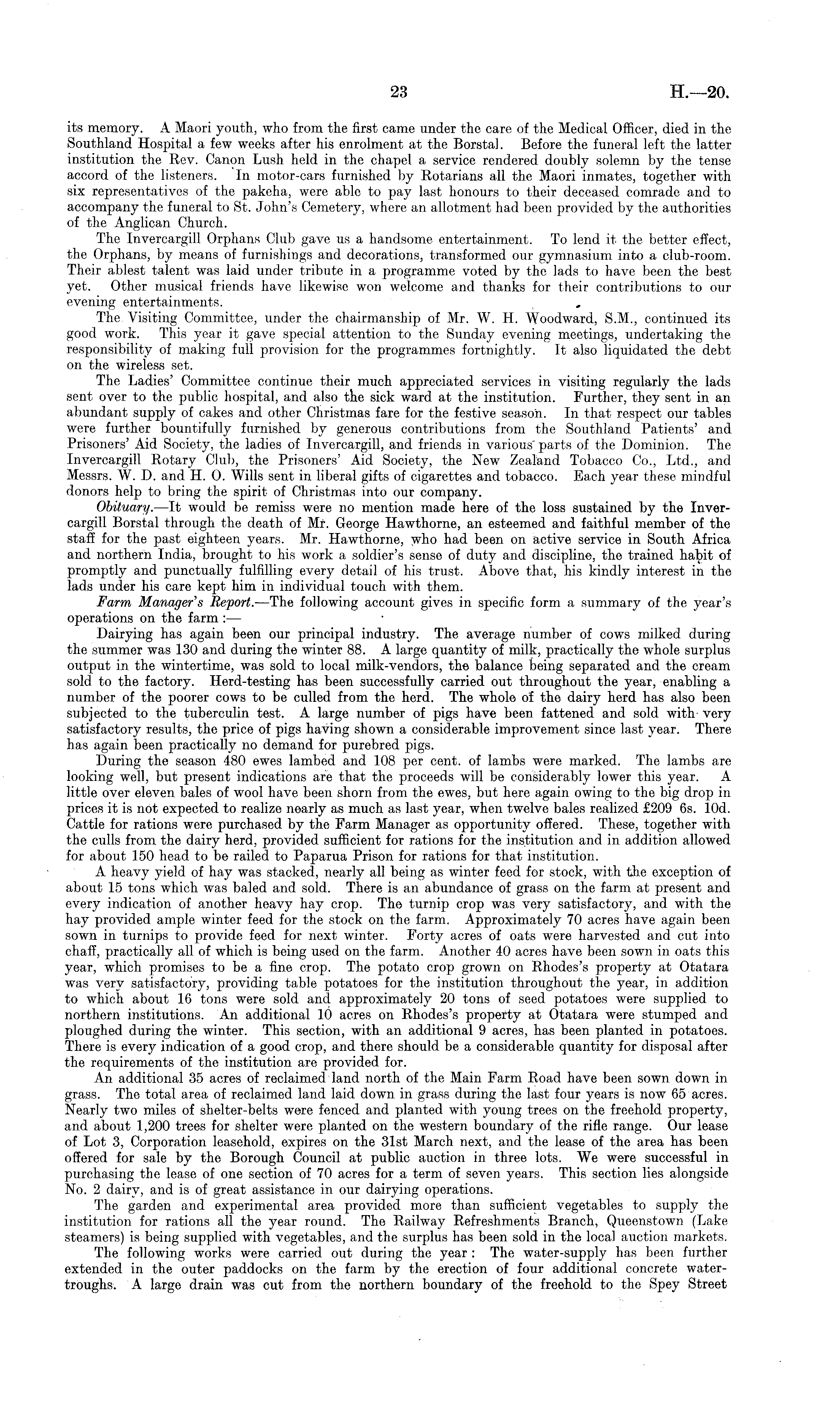 its memory. A Maori youth, who from the first came under the care of the Medical Officer, died in the Southland Hospital a few weeks after his enrolment at the Borstal. Before the funeral left the latter institution the Rev. Canon Lush held in the chapel a service rendered doubly solemn by the tense accord of the listeners. In motor-cars furnished by Rotarians all the Maori inmates, together with six representatives of the pakeha, were able to pay last honours to their deceased comrade and to accompany the funeral to St. John's Cemetery, where an allotment had been provided by the authorities of the Anglican Church. The Invercargill Orphans Club gave us a handsome entertainment. To lend it the better effect, the Orphans, by means of furnishings and decorations, transformed our gymnasium into a club-room. Their ablest talent was laid under tribute in a programme voted by the lads to have been the best yet. Other musical friends have likewise won welcome and thanks for their contributions to our evening entertainments. The Visiting Committee, under the chairmanship of Mr. W. H. Woodward, S.M., continued its good work. This year it gave special attention to the Sunday evening meetings, undertaking the responsibility of making full provision for the programmes fortnightly. It also liquidated the debt on the wireless set. The Ladies' Committee continue their much appreciated services in visiting regularly the lads sent over to the public hospital, and also the sick ward at the institution. Further, they sent in an abundant supply of cakes and other Christmas fare for the festive season. In that respect our tables were further bountifully furnished by generous contributions from the Southland Patients' and Prisoners' Aid Society, the ladies of Invercargill, and friends in various" parts of the Dominion. The Invercargill Rotary Club, the Prisoners' Aid Society, the New Zealand Tobacco Co., Ltd., and Messrs. W. D. and H. 0. Wills sent in liberal gifts of cigarettes and tobacco. Each year these mindful donors help to bring the spirit of Christmas into our company. Obituary.—lt would be remiss were no mention made here of the loss sustained by the Invercargill Borstal through the death of Mr. George Hawthorne, an esteemed and faithful member of the staff for the past eighteen years. Mr. Hawthorne, who had been on active service in South Africa and northern India, brought to his work a soldier's sense of duty and discipline, the trained habit of promptly and punctually fulfilling every detail of his trust. Above that, his kindly interest in the lads under his care kept him in individual touch with them. Farm Manager's Report. —The following account gives in specific form a summary of the year's operations on the farm : — Dairying has again been our principal industry. The average number of cows milked during the summer was 130 and during the winter 88. A large quantity of milk, practically the whole surplus output in the wintertime, was sold to local milk-vendors, the balance being separated and the cream sold to the factory. Herd-testing has been successfully carried out throughout the year, enabling a number of the poorer cows to be culled from the herd. The whole of the dairy herd has also been subjected to the tuberculin test. A large number of pigs have been fattened and sold with very satisfactory results, the price of pigs having shown a considerable improvement since last year. There has again been practically no demand for purebred pigs. During the season 480 ewes lambed and 108 per cent, of lambs were marked. The lambs are looking well, but present indications are that the proceeds will be considerably lower this year. A little over eleven bales of wool have been shorn from the ewes, but here again owing to the big drop in prices it is not expected to realize nearly as much as last year, when twelve bales realized £209 6s. lOd. Cattle for rations were purchased by the Farm Manager as opportunity offered. These, together with the culls from the dairy herd, provided sufficient for rations for the institution and in addition allowed for about 150 head to be railed to Paparua Prison for rations for that institution. A heavy yield of hay was stacked, nearly all being as winter feed for stock, with the exception of about 15 tons which was baled and sold. There is an abundance of grass on the farm at present and every indication of another heavy hay crop. The turnip crop was very satisfactory, and with the hay provided ample winter feed for the stock on the farm. Approximately 70 acres have again been sown in turnips to provide feed for next winter. Forty acres of oats were harvested and cut into chaff, practically all of which is being used on the farm. Another 40 acres have been sown in oats this year, which promises to be a fine crop. The potato crop grown on Rhodes's property at Otatara was very satisfactory, providing table potatoes for the institution throughout the year, in addition to which about 16 tons were sold and approximately 20 tons of seed potatoes were supplied to northern institutions. An additional 10 acres on Rhodes's property at Otatara were stumped and ploughed during the winter. This section, with an additional 9 acres, has been planted in potatoes. There is every indication of a good crop, and there should be a considerable quantity for disposal after the requirements of the institution are provided for. An additional 35 acres of reclaimed land north of the Main Farm Road have been sown down in grass. The total area of reclaimed land laid down in grass during the last four years is now 65 acres. Nearly two miles of shelter-belts were fenced and planted with young trees on the freehold property, and about 1,200 trees for shelter were planted on the western boundary of the rifle range. Our lease of Lot 3, Corporation leasehold, expires on the 31st March next, and the lease of the area has been offered for sale by the Borough Council at public auction in three lots. W